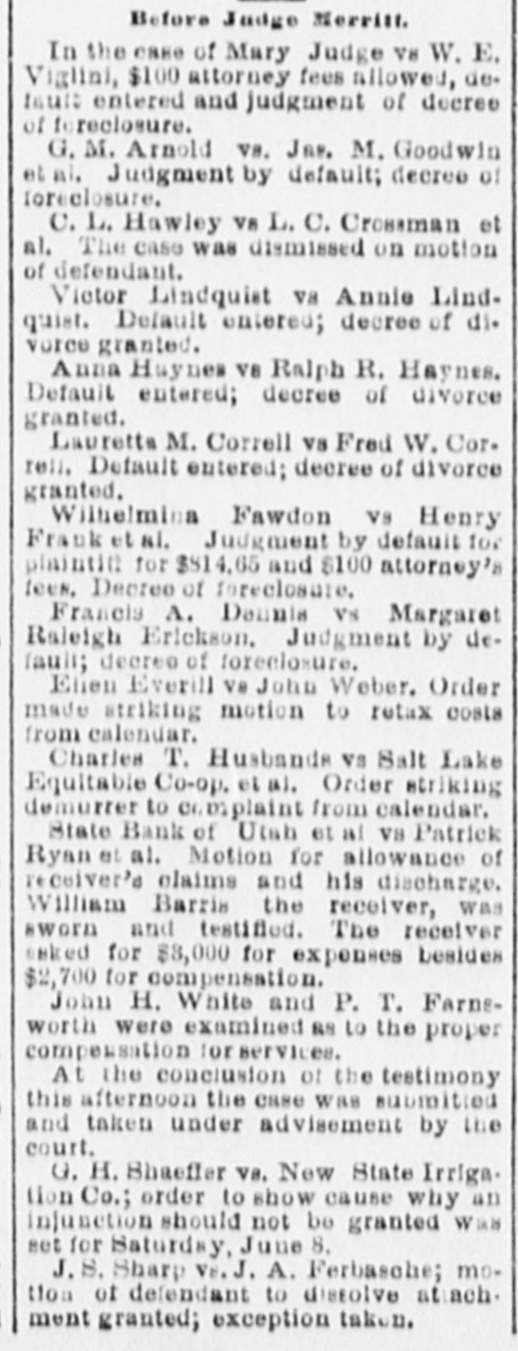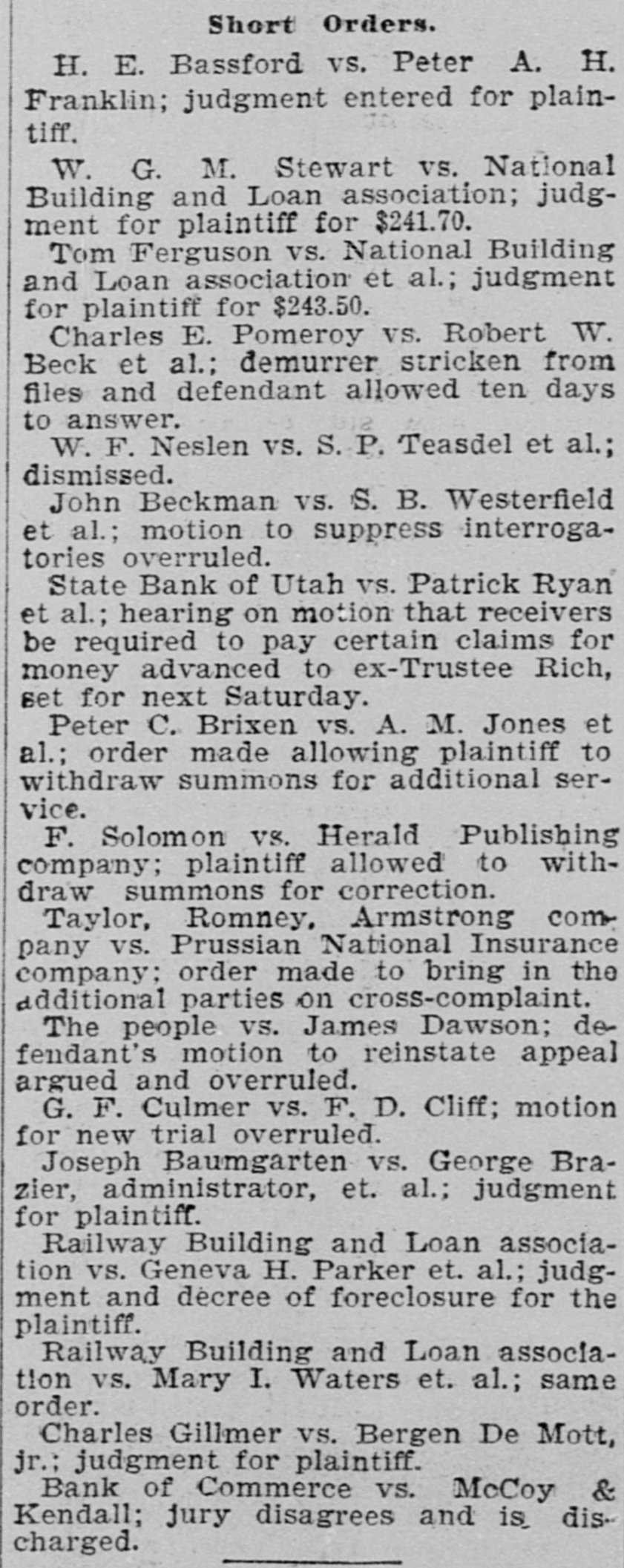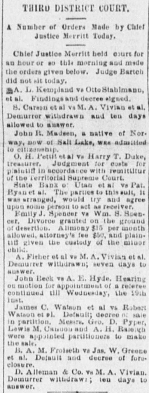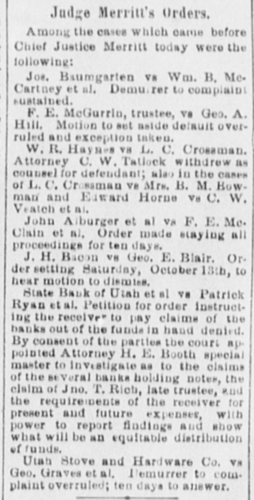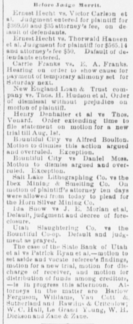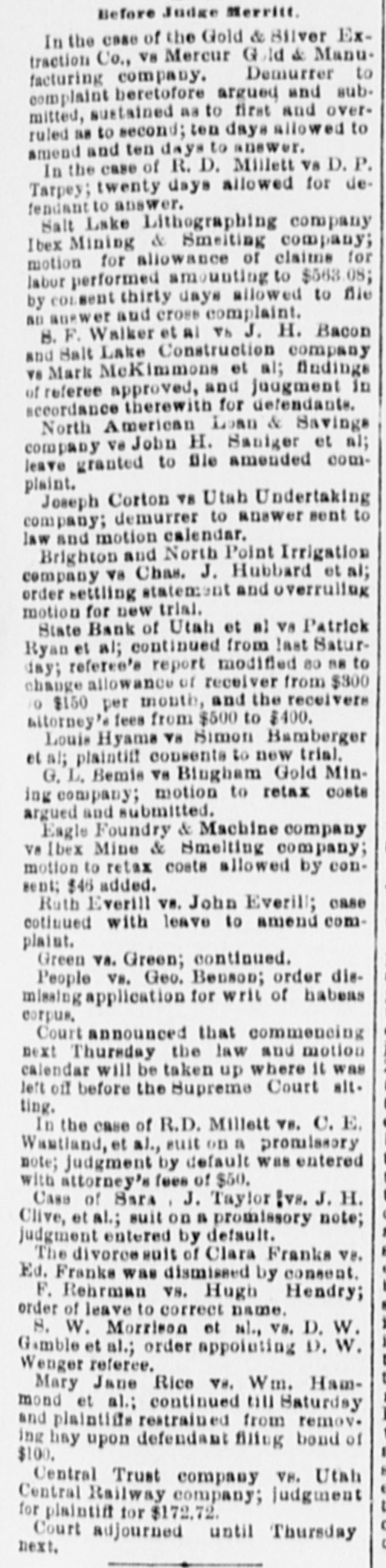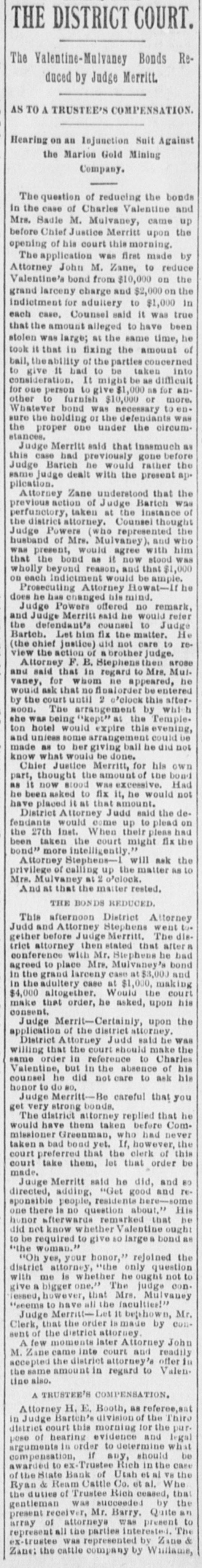 THE DISTRICT COURT. The Valentine-Mulvaney Bonds Reduced by Judge Merritt. AS TO A TRUSTEE'S COMPENSATION. Hearing on an Injunction Suit Against the Marion Gold Mining Company. The question of reducing the bonds in the case of Charles Valentine and Mrs. Sadie M. Mulvaney, came up before Chief Justice Merritt upon the opening of his court this morning. The application was first made by Attorney John M. Zane, to reduce Valentine's bond from $10,000 on the grand larceny charge and $2,000 on the indictment for adultery to $1,000 in each case, Counsel said it was true that the amount alleged to have been stolen was large; at the same time, he took it that in fixing the amount of bail, theability of the parties concerned to give it had to be taken into consideration. It might be as difficult for one person to give $1,000 ns for another to furnish $10,000 or more. Whatever bond was necessary to ensure the holding or the defendants was the proper one under the circumstances. Judge Merritt said that inasmuch as this case had previously gone before Judge Barteh he would rather the same judge dealt with the present ap. plication. Attorney Zane understood that the previous action of Judge Bartch was perfunctory, taken at the instance of the district attorney. Counsel thought Judge Powers (who represented the husband of Mrs. Mulvaney) and who was present, would agree with him that the bond as it now stood was wholly beyond reason. and that $1,000 on each indictment would be ample. Prosecuting Attorney Howat-If he does he has changed his mind. Judge Powers offered no remark, and Judge Merritt said he would refer the defendant's counsel to Judge Bartch. Let him fix the matter. He (the chief justice) did not care to review the action of a brother judge. Attorney F. B. Stephens then arose and said that in regard to Mrs. Mulvaney, for whom ne appeared, he would ask that no finalorder be entered by the court until 2 e'clock this aftermoon. The arrangement by whi h she WES being "kept" at the Templeton hotel would expire this evening, and unless some arrangement could be made as to her giving ball he did not know what would be done. Chief Justice Merritt, for his own part, thought the amount of the bond as it now stood was excessive. Had he been asked to fix it, he would not have placed it at that amount. District Attorney Judd said the defendants would come up to plead on the 27th inst. When their pleas had been taken the court might fix the bond" more intelligently. Attorney Stephens-1 will ask the privilege of calling up the matter RS to Mrs. Mulvaney at 2 o'clock. And at that the matter rested. THE BONDS REDUCED. This afternoon District Attorney Judd and Attorney Stephens went together before Judge Merritt. The district attorney then stated that after & conference with Mr. Stephens he bad agreed to place Mrs. Mulvaney's bond in the grand larceny case at $3,000 and in the adultery case at $1,000, making $4,000 altogether. Would the court make that order, he asked, upon his consent. Judge Merrit-Certainly, upon the application of the district attorney. District Attorney Judd said he was willing that the court should make the same order in reference to Charles Valentine, but in the absence of his counsel he did not care to ask his honor to do BO. Judge Merritt-Be careful that you get very strong bonds. The district attorney replied that he would have them taken before Commissioner Greenman, who had never taken a bad boad yet. If, however, the court preferred that the clerk of this court take them, let that order be made. Judge Merritt said he did, and BD directed, adding, "Get good and responsible people, residents here-some one there is no question about." His honor afterwards remarked that be did not know whether Valentine ought to be required to give EO largea bond as "the woman.' "Oh yes, your honor," rejoined the district attorney, "the only question with me is whether he ought not to give a bigger one." The judge con. lessed, however, that Mrs. Mulvaney "seems to have all the faculties!" Judge Merritt-Let it betshown, Mr. Clerk, that the order 18 made by consent of the district attorney. A few moments later Attorney John M. Zane came into court and readily accepted the district attorney's offer in the same amount in regard to Valen. tine also. A TRUSTEE'S COMPENSATION. Attorney H. E. Booth, as referee,sat in Judge Bartch's division of the Thiro district court this morning for the pur. pose of hearing evidence and legal arguments in order to determine what compensation, if any, should be awarded to ex-Trustee Rich in the case of the State Bank of Utah et al V8 the Ryan & Ream Cattle Co. et al. Whe the duties of Trustee Rich ceased, that gentleman was succeeded by the present receiver, Mr. Barry. Quite an array of attorneys was present to the parties interested The