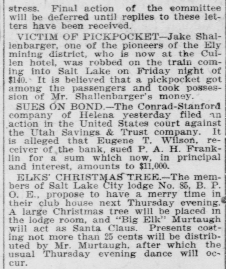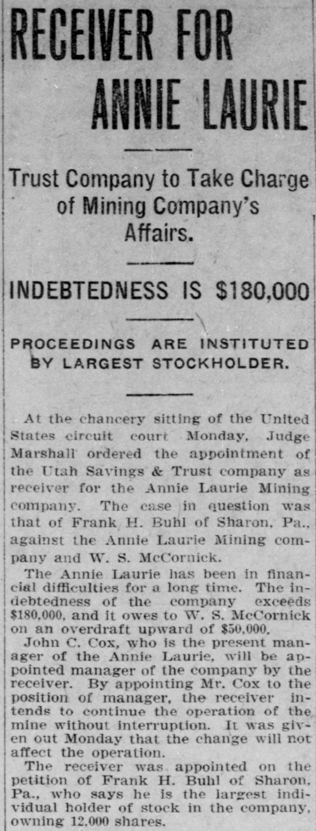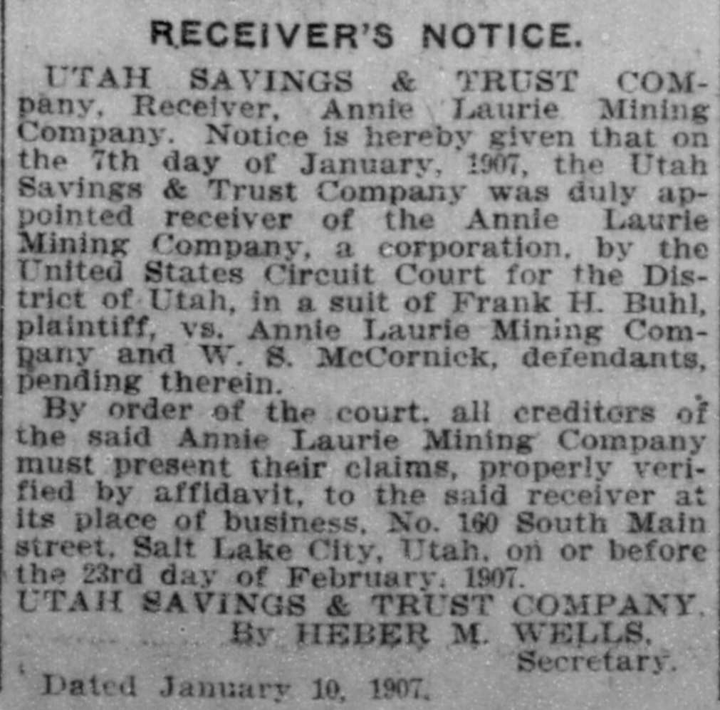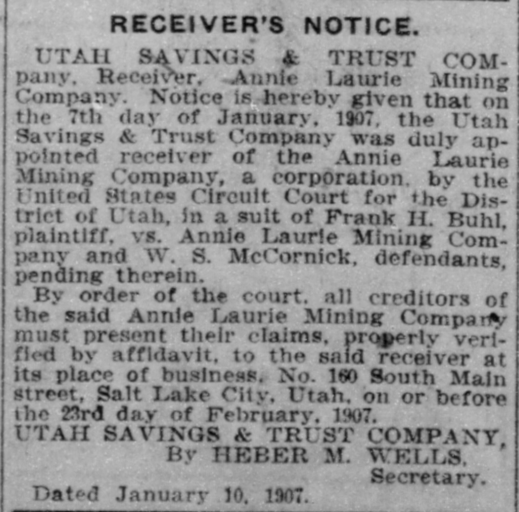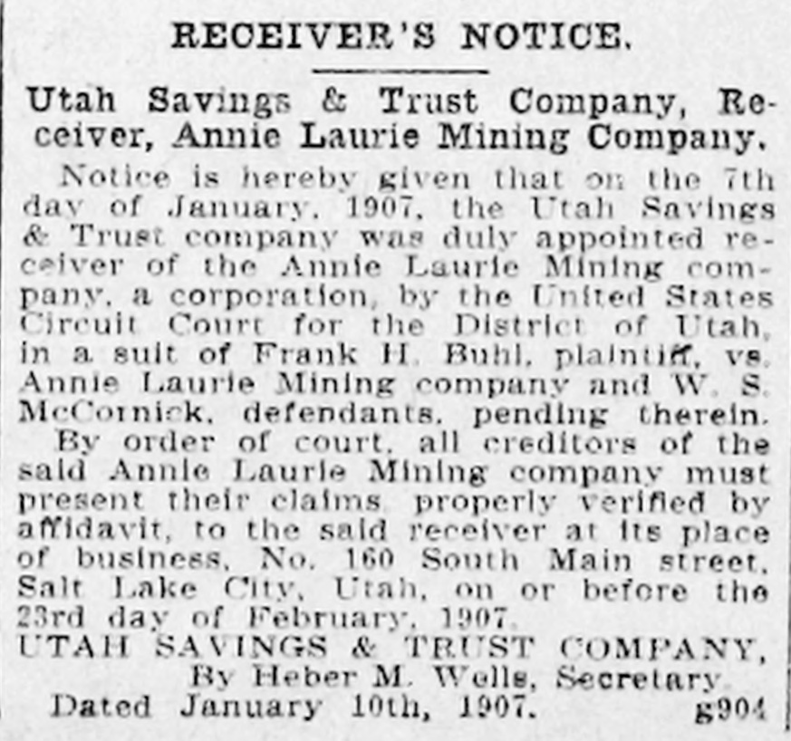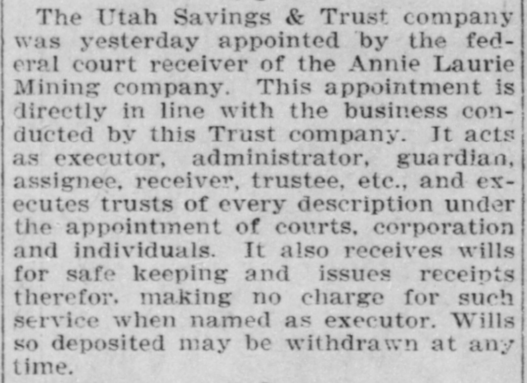 The Utah Savings & Trust company was yesterday appointed by the federal court receiver of the Annie Laurie Mining company. This appointment is directly in line with the business conducted by this Trust company. It acts as executor, administrator, guardian, assignee, receiver, trustee, etc., and executes trusts of every description under the appointment of courts, corporation and individuals. It also receives wills for safe keeping and issues receipts therefor. making no charge for such service when named as executor. Wills so deposited may be withdrawn at any time.