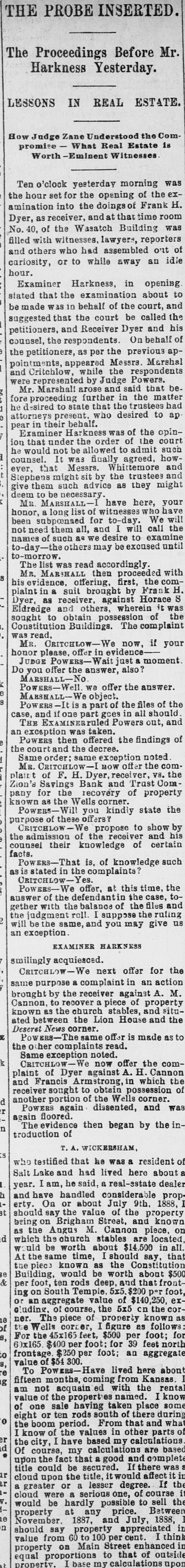 THE PROBE INSERTE The Proceedings Before I Harkness Yesterday. LESSONS IN REAL ESTA How Judge Zane Understood the C promise - What Real Estate 1 Worth -Eminent Witnesses. Ten o'clock yesterday morning the hour set for the opening of the amination into the doings of Fran Dyer, as receiver, and at that time r No. 40, of the Wasatch Building filled with witnesses, lawyers, repor and others who had assembled on cariosity, or to while away an hour. Examiner Harkness, in open stated that the examination abou be made was in behalf of the court, suggested that the court be called petitioners, and Receiver Dyer and counsel, the respondents. On beha the petitioners, as per the previous pointments, appeared Messrs. Mar and Critchlow, while the respond were represented by Judge Powers. Mr. Marshall arose and said that fore proceeding further in the ms he desired to state that the trustees attorneys present. who desired to pear in their behalf. Examiner Harkness was of the 0) ion that under the order of the c he would not be allowed to admit s counsel. It was finally agreed, b ever, that Messrs. Whittemore Stephens might sit by the trustees give them such advice as they m deem to be necessary. MR. MARSHALL-I have here, ! honor, a long list of witnesses who I been subpensed for to-day. We not need them all, and I will call names of such as we desire to exat to-day-the others may be excused 1 to-morrow. The list was read accordingly. MR. MARSHALL then proceeded 8 his evidence. offering, first, the o plaint in a suit brought by Fran Dyer, as receiver, against Horao Eldredge and others, wherein it sought to obtain possession of Constitution Buildings. The completed was read. MR. ORITCHLOW-We now, if honor please, offer in evidence— JUDGE POWERS-Wait just a mom Do you offer the answer, also? MARSHALL-No. POWERS-Well. we offer the answ MARSHALL-We object. Powers-It is a part of the files of case, and if one part goes in all sho THE EXAMINERRUIED Powers out, an exception was taken. POWERS then offered the finding the court and the decree. Same order: same exception note MR. CRITCHLOW-I HOW offer the o plaint of F. H. Dyer, receiver, VS. Zion's Savings Bank and Trust 0 pany for the recovery of prop known as the Wells corner. POWERS-Will you kindly state purpose of these offers? CEITCHLOW-We propose to show the admission of the receiver and counsel their knowledge of cer facts. POWERS-That is, of knowledge 8 as is stated in the complaints? CRITCHLOW-Yes. Powers-We offer, at this time, answer of the defendantin the case