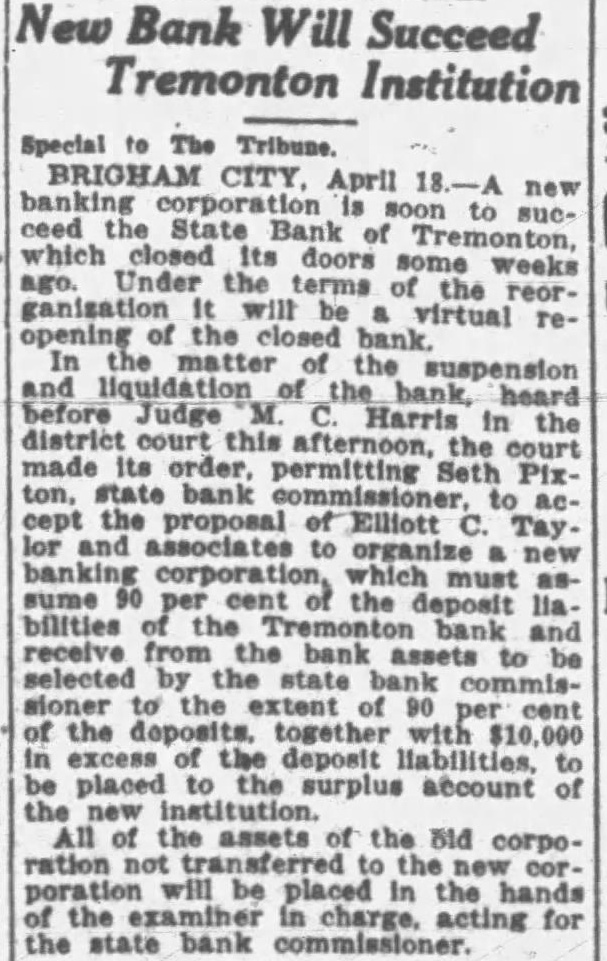 New Bank Will Succeed Tremonton Institution Special The Tribune. BRIGHAM CITY, April new to ceed which the closed State Bank of Tremonton, sucdoors some weeks ago. Under the terms of the ganisation will virtual reopening of the closed bank. In matter suspension heard before Judge Harris district this afternoon, in the made its bank permitting Seth Pixton, cept the proposal of Elliott Tay. lor and associates organize must sume cent the deposit bilities bank receive from the bank assets to selected bank extent the together with excess of the deposit liabilities, placed to the surplus account the institution. All the assets of the Bld corporation poration be placed the hands the examiner charge, acting for the state bank