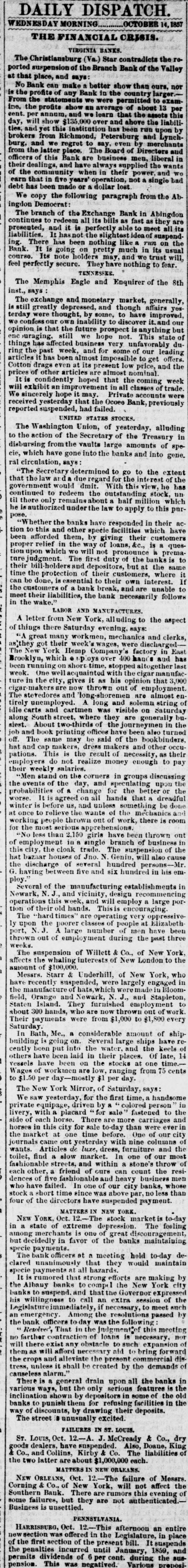 CRISIS. DAILY MORNING DISPATCH. OCTOBER 14. 1857 THE FINANCIAL The VIRGINIA the Branch Star Bank of the Valley not ours. than profite ported and says better show larger. that place, can make a Bank to the counted country exam No Bank of any were about 13 this will day, this institution From the the profits and learn and that above run the upon liabili by cent inc. show been and and brokers regret The Board from Richmond to of Directors Dise dealings and when in burg, Bank are bad their singie has been We the the Ab following of the that in five years or dollar lost from in Bank Abingdon fast they continues ingdon branch Democrat of the meet suspe all its run ing. like a The to redeem on the Bank its usual Its note feel They liabilities. There going been trust to fear COUTRO perfectly secure ENNESSES The and of 8th the Eagle Enquirer Memphis market, generally affairs yes inst., says exchange and monetary mand though have improve out The depres by some, thing but still great thought, ability to This is rday own future prospect du that the hope leading busine for and the things almost most impor low price It is week ring been that the James coming of trade. the Ocoeo Bank, The the the Treasury vaults of large amounts the into into banks and the this view, he to this pur their tion the duty banks the but where unable follow the to and Company his that they