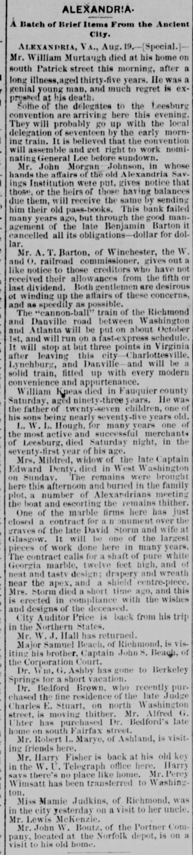 À Batch of Brief Items From the Ancient City. ALEXANDRIA, VA., Aug. 19.-[Special.]Mr. William Murtaugh died at his home on south Patrick street this morning, after a I long illness, aged thirty-five years. He was a genial young man, and much regret is expressed at his death. Softie of the délegates to the Leesburg convention are arriving here this evening. They will probably go up with the local delegation of seventeen by the early morning train. It is believed that the convention will assemble and get right to work nominating General Lee before sundown. Mr. John Morgan Johnson, in whose hands the affairs of the old Alexandria SavI ings Institution were put, gives notice that those. or the heirs of those having balances due them, will receive the same by sending ) him their old pass-books. This bank failed many years ago, but through the good management of the late Benjamin Barton it cancelled all its obligations-dollar for dollar. ) Mr. A. T. Barton. of Winchester, the W. and O. railroad commissioner, gives out a like notice to those creditors who have not received their allowances from the fifth or last dividend. Both gentlemen are desirous of winding up the affairs of these concerns, and as speedily as possible. The "cannon-ball" train of the Richmond and Danville road between Washington and Atlanta will be put on about October will run on a fast-express It will at but three after this 1st, and leaving stop city-Charlotteeville, points in schedule. Virginia Lynchburg, and Danville-and will be a solid train, fitted up with every modern convenience and appurtenance. William Kpeas died in Fauquier county Saturday, aged ninety-three years. He was the father of twenty-seven children, one of his sons being nearly seventy-tive years old. L. W. L. Hough, for many years one of the most active and successful merchants of Leesburg, died Saturday night, in the seventy-first year of his age. Mrs. Mildred, widow of the late Captain Edward Denty, died in West Washington on Sunday. The remains were brought here this afternoon and buried in the family plot, a number of Alexandrians meeting the boat and escorting the remains thither. One of the marble firms here has just closed a contract for a m onument over the graves of the late David Storm and wife at Glasgow. It will be one of the largest pieces of work done here in many years. The contract calls for a shaft of pure white Georgia marble, twelve feet high, and of neat and tastv design: drapery and wreath near the apex, and a shield centre-piece. Mrs. Storm died a short time ago, and this is erected in compliance with the wishes and designs of the deceased. City Auditor Price is back from his trip in the Northern States. Mr. W. J. Hall has returned. Major Samuel Beach. of Richmond. is visiting his brother, Captain John S. Beach, of the Corporation Court. Dr. Wm. G. Ashby has gone to Berkeley Springs for a short vacation. Dr. Bedford Brown, who recently purchased the fine residence of the late Judge Charles E. Stuart, on north Washington street, is moving thither. Mr. Alfred G. Uhter has purchased Dr. Bedford's late home on south Fairfax street. Mr. Robert L. Marye, of Ashland, is visiting friends here. Mr. Harry Fisher is back at his old key in the W. U. Telegraph office here. Harry savs there's no place like home. Mr. Percy Wimsatt has been transferred to Washington. Miss Mamie Judkins, of Richmond, was in the city yesterday on a visit to her uncle, Mr. Lewis McKenzie. Mr. John W. Boutz, of the Portner Company, located at the Norfolk depot, is on a visit to his old home.