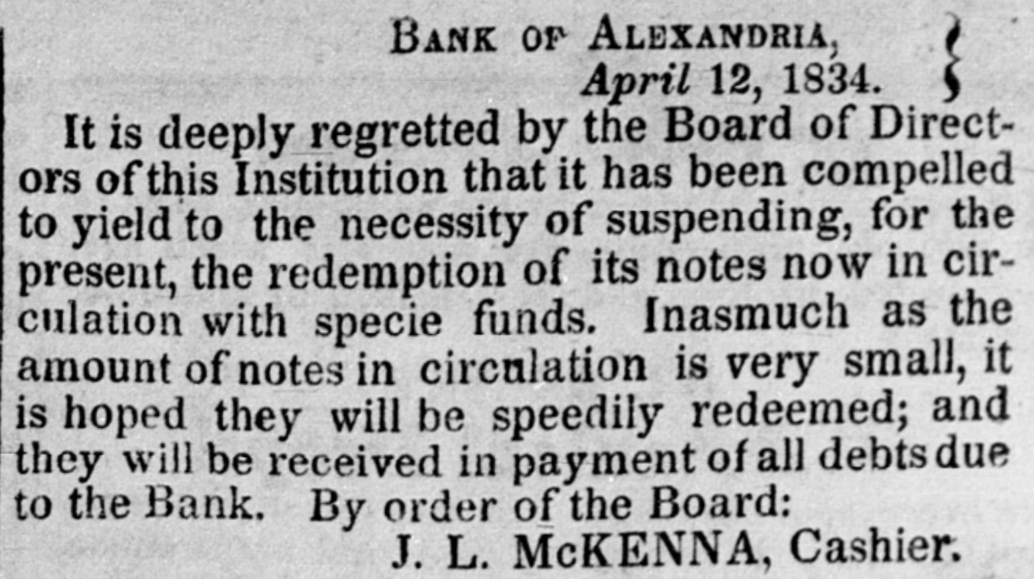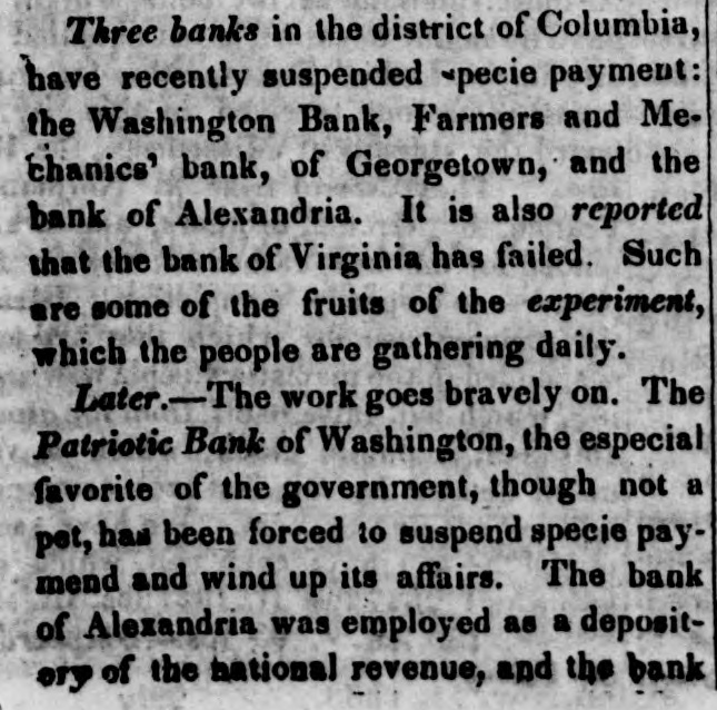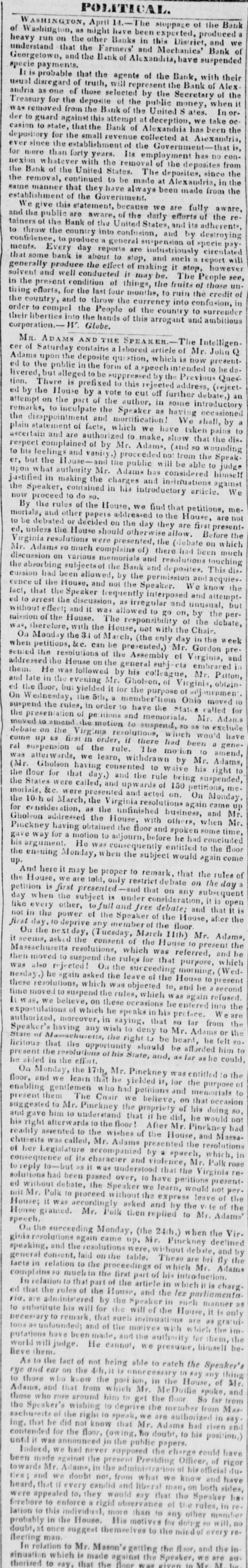POLATICAL April 14.-1 stoppage of produced the Bank WASHINGTON, as might have been expected, and we a of Washington, the other Banks in this District, Bank of heavy run on that the Farmers' and Mechanics' suspended specie understand Georgetown, and the Bank of Alexandria, have will represent It is payments probable that the agents of the the Bank, Bank with of Alex their usual disregard as one of of those truth, selected by the Secretary when of the it andria Treasury for the deposite Bank of of the the public United money, ates. In or. was removed against from the this attempt at deception, has we been take the oc. der to guard state, that the Bank of Alexandria Alexandria, casion to for the small revenue collected at is, depository the establishment of the Governm has no conthe with removal ever for more since than forty years. Its employment of the deposites from the nexion the Bank whatever of the United States. made The at deposites, Alexandria, since in the same the removal, manner continued that they have to be always been made from the aware, establishment of the Government. because we are fully of the United and We the give public this are statement, aware, of the States, daily efforts and its of adherents, the re. tainers of to throw the the Bank country into general confusion, suspension and by of specie pay destroying to stop, ments. confidence, Every to produce day reports are industriously and such circulated report will generally that some produce bank is the about effect of making it The stop, People how see, suivent in the present and well condition conduete of things, it months, may the be. to fruits ruin the of those credit un- of tix ing efforts, and for the to throw last four the currency into confusion, surrender in the country, the People of the country to ambitious order their liberties into to compel the hands of this arrogant and corporation.- W. Globe. MR. ADAMS AND THE labored SPEAKER article of The Mr. Intelligen John Q cer Adams of Saturday upon the contains deposite question, of a speech which intended is now to present- be deed to the pnblic alleged in the to be form suppressed by the Previous (reject Ques: livered,but There is prefix to this rejected address, debate,) tion. the House by a vote to cut off further introductory an ed by on the part of the author, in some occasioned attempt to inculpate the Speaker as having shall, by remarks, disappointment and mortification! We pains the statement of facts, which we have taken that the dis- to plain uscertain and are authorized to make, show sounding respect complained of by Mr. Adains, (and !rom so the Speakthe to his feelings and variey .) proceeded public will no: be able to judge er, but what the authority House- and Mr. Adams has considered himself against upon in making the charges and insinfuations article. We justified the Speaker, contained in his introductory now proceed rules to of do the so. House, we find that petitions, are me. not By the other papers addressed to the House, morials, debated and or decided on the day they are first Before present- the to ed, be unless the House were should presented, otherwi the allow. (debate on which Virginia Adams resolutions FO much complains of) there had been touching much Mr. various memorials and resolutions This dis. discussion absorbing on subjects of the Bank and deposites. and acquiesthe had been allowed, by the permission We know the cussion of the House, and not the Speaker. and cence fact, that the Speaker frequently irregular interposed and unusual, attempt- but ed arrest the and discussion, it was allowed as to go on, by the debate, perwithout effect of the House. The responsibility the of Chair. the mission therefore, with the House, not with the W was, the 3.1 of March, (the only day Gordon in eek Oa Monday & can be presented,) Mr. pre- and on the general sented when petitions, the resolutions of the Assembly subj- et Virginia, embraced in Gholson, floor, them. addressed He the was House followed by his colleague, of Virginia, Mr. obtain- Patton, Ohio and late in the but evening yielded Mr. it for the purpose of adjournment moved 10 the in rules, ed On the Wednesday, the 5th, order to member'thou have the States called for Adais suspend presentation of petitions and memorials. as Mr. to exclude the amend the motion to suspend, would have moved 10 the Virgima resolutions, which debate on first in order, if there had been a genecome up as of the rule. !he mo ion Mr. to amend, Adams, was ral suspension afterwards, we learn, withdrawn waive by his right to (Mr. Gholson having consented and the to rule being suspended, the floor for that called, day, and upwards of 150 petitions, me. the States &c were were prese nted and acted on. On Monday, morials, 10.h of March, the Virgi resolutions again and came Mr. the consideration, as the unfinished business, when Mr. for addressed the House, with others, some time, Gholson having obtained the floor and spoken concluded Pinckney for motion to adjourn, before he had the floor gave way He was consequently entitled to the is argumen ensuing Monday, when the subject would again come up. here it may be proper to remark, that on the the rules day of And we are told, only restrict debate is petition the House, is first presented under -and that consideration, on any subsequent it is open day when the other, subject to full and free debate; and that it the is like every the power of the Speaker of the House, after first not in day, 10 deprive any member March of the 11th) floor. Mr. Adams, On the next day, (Tuesday, consent of the House to present the Massachusetts it seems, asked resolutions, the which was referred, and which he moved to suspend the rules for that purpose, (Wedthen also rejected! On the acceeding House morning, to present was he again asked the leave of the a second nesday ,) W hich was objected to, and he refused. these resolutions, to suspend the rules, which was again the time was, moved we