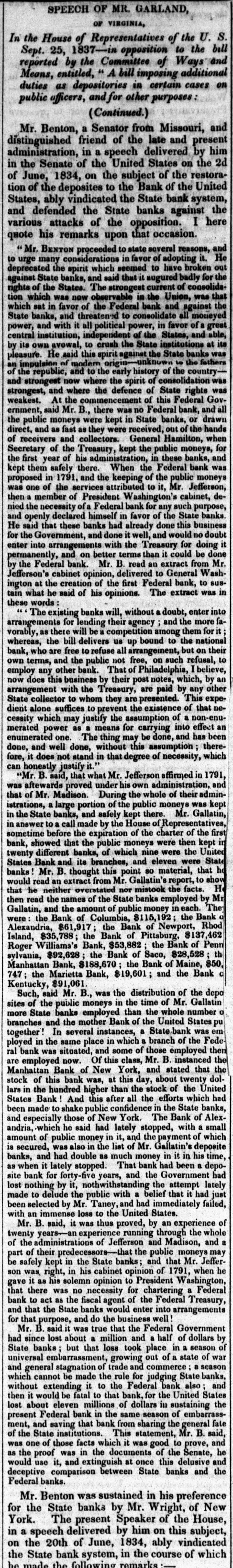 # SPEECH OF MR. GARLAND, OF VIRGINIA, In the House of Representatives of the U. S. Sept. 25, 1837-in opposition to the bill reported by the Committee of Ways and Means, entitled, "A bill imposing additional duties as depositories in certain cases on public officers, and for other purposes: (Continued.) Mr. Benton, a Senator from Missouri, and distinguished friend of the late and present administration, in a speech delivered by him in the Senate of the United States on the 2d of June, 1834, on the subject of the restora- tion of the deposites to the Bank of the United States, ably vindicated the State bank system, and defended the State banks against the various attacks of the opposition. I here quote his remarks upon that occasion. "Mr. BENTON proceeded to state several reasons, and to urge many considerations in favor of adopting it. He deprecated the spirit which seemed to have broken out against State banks, and said that it augured badly for the rights of the States. The strongest current of consolida- tion which was now observable in the Union, was that which sat in favor of the Federal bank and against the State banks, and threatened to consolidate all moneyed power, and with it all political power, in favor of a great central institution, independent of the States, and able, by its own avowal, to crush the State institutions at its pleasure. He said this spirit against the State banks was an impulsion of modern origin-unknown to the fathers of the republic, and to the early history of the country- and strongest now where the spirit of consolidation was strongest, and where the defence of State rights was weakest. At the commencement of this Federal Gov- ernment, said Mr. B., there was no Federal bank, and all the public moneys were kept in State banks, or drawn direct, and as fast as they were received, out of the hands of receivers and collectors. General Hamilton, when Secretary of the Treasury, kept the public moneys, for the first year of his administration, in these banks, and kept them safely there. When the Federal bank was proposed in 1791, and the keeping of the public moneys was one of the services attributed to it, Mr. Jefferson, then a member of President Washington's cabinet, de- nied the necessity of a Federal bank for any such purpose, and openly declared himself in favor of the State banks. He said that these banks had already done this business for the Government, and done it well, and would no doubt enter into arrangements with the Treasury for doing it permanently, and on better terms than it could be done by the Federal bank. Mr. B. read an extract from Mr. Jefferson's cabinet opinion, delivered to General Wash- ington at the creation of the first Federal bank, to sus- tain what he said of his opinions. The extract was in these words: "The existing banks will, without a doubt, enter into arrangements for lending their agency; and the more fa- vorably, as there will be a competition among them for it; whereas, the bill delivers us up bound to the national bank, who are free to refuse all arrangement, but on their own terms, and the public not free, on such refusal, to employ any other bank. That of Philadelphia, I believe, now does this business by their post notes, which, by an arrangement with the Treasury, are paid by any other State collector to whom they are presented. This expe- dient alone suffices to prevent the existence of that ne- cessity which may justify the assumption of a non-enu- merated power as a means for carrying into effect an enumerated one. The thing may be done, and has been done, and well done, without this assumption; there- fore, it does not stand in that degree of necessity, which can honestly justify it." "Mr. B. said, that what Mr. Jefferson affirmed in 1791, was afterwards proved under his own administration, and that of Mr. Madison. During the whole of their admin- istrations, a large portion of the public moneys was kept in the State banks, and safely kept there. Mr. Gallatin, in answer to a call made by the House of Representatives, sometime before the expiration of the charter of the first bank, showed that the public moneys were then kept in twenty different banks, of which nine were the United States Bank and its branches, and eleven were State banks! Mr. B. thought this point so material, that he would read an extract from Mr. Gallatin's report, to show that he neither overstated nor mistook the facts. He then read the names of the State banks employed by Mr Gallatin, and the amount of public money in each. The were the Bank of Columbia, $115,192; the Bank of Alexandria, $61,917; the Bank of Newport, Rhod Island, $35,788; the Bank of Pittsburg, $137,462 Roger Williams's Bank, $53,882; the Bank of Penn- sylvania, $92,628; the Bank of Saco, $28,528; th Manhattan Bank, $188,670; the Bank of Maine, $50, 747; the Marietta Bank, $19,601; and the Bank o Kentucky, $91,061. Such, said Mr. B., was the distribution of the depo- sites of the public moneys in the time of Mr. Gallatin more State banks employed than the whole number of branches and the mother Bank of the United States pu together! In several instances, a State bank was em- ployed in the same place in which a branch of the Fede- ral bank was situated, and some of those employed then are employed now. Of this class, Mr. B. instanced the Manhattan Bank of New York, and stated that the stock of this bank was, at this day, about twenty dol- lars in the hundred higher than the stock of the United States Bank! And this after all the efforts which had been made to shake public confidence in the State banks, and especially those of New York. The Bank of Alex- andria, which he said had lately stopped, with a small amount of public money in it, and the payment of which is secured, was also in the list of Mr. Gallatin's deposite banks, and had double as much money in it in his time, as when it lately stopped. That bank had been a depo- site bank for forty-five years, and the Governmen
