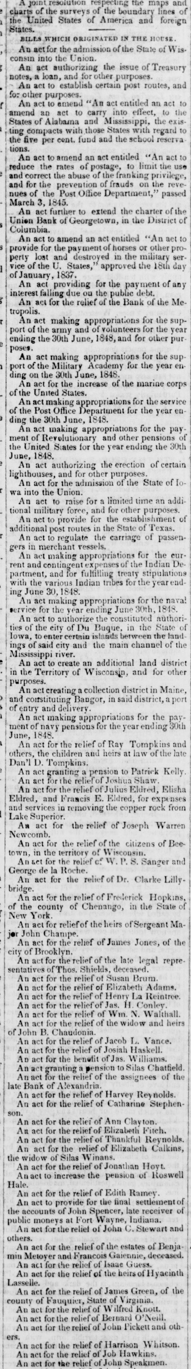 joint resolution respecting the maps and charts of the surveys of the boundary lines of the United States of America and foreign States. BILLS WHICH ORIGINATED IN THE HOUSE. An act for the admission of the State of Wis consin into the Union. An act authorizing the issue of Treasury notes, a loan, and for other purposes. An act to establish certain post routes, and for other purposes. An act to amend 'An act entitled an act to amend an act to carry into effect, to the States of Alabama and Mississippi, the existing compacts with those States with regard to the five per cent. fund and the school reserva tions. An act to amend an act entitled "An act to reduce the rates of postage, to limit the use and correct the abuse of the franking privilege, and for the prevention of frauds on the revenues of the Post Office Department," passed March 1845. An act further to extend the charter of the Union Bank of Georgetown, in the District of Columbia. An act to amend an act entitled "An act to provide for the payment of horses or other property lost and destroyed in the military ser vice of the U. States," approved the 18th day of January, 1837. An act providing for the payment of any interest falling due ou the public debt. An act for the relief of the Bank of the Metropolis. An act making appropriations for the support of the army and of volunteers for the year ending the 30th June, 1848, and for other purposes. An act making appropriations for the support of the Military Academy for the year ending on the 30th June, 1848. An act for the increase of the marine corps of the United States. An act making appropriations for the service of the Post Office Department for the year ending the 30th June, 1848. An act making appropriations for the pay ment of Revolutionary and other pensions of the United States for the year ending the 30th June, 1848. An act authorizing the erection of certain lighthouses, and for other purposes. An act for the admission of the State of Iowa into the Union. An act to raise for a limited time an addi tional military force, and for other purposes. An act to provide for the establishment of additional post routes in the State of Texas. An act to regulate the carriage of passengers in merchant vessels. An act making appropriations for the current and contingent expenses of the Indian De partment, and for fulfilling treaty stipulations with the various Indian tribes for the year ending June 1848. An act making appropriations for the nava! service for the year ending June 30th, 1848. An act to authorize the constituted authorities of the city of Du Buque, in the State of Iowa, to enter certain islands between the land. ings of said city and the main channel of the Mississippi river. An act to create an additional land district in the Territory of Wisconsin, and for other purposes. An act creating a collection district in Maine, and constituting Bangor, in said district, port of entry and delivery An act making appropriations for the payment of navy pensions for the year ending 30th June, 1848. An act for the relief of Ray Tompkins and others, the children and heirs at law of the late Dan'l D. Tompkins. An act granting a pension to Patrick Kelly An act for the relief of Joshua Shaw. An act for the relief of Julius Eldred, Elisha Eldred, and Francis E. Eldred, for expenses and services in removing the copper rock from Lake Superior. An act for the relief of Joseph Warren Newcomb. act for the relief of the citizens of Beetown, in the territory of Wisconsin. An &ct for the relief of W. S. Sanger and George de la Roche. An act for the relief of Dr. Clarke Lilly. bridge. An act for the relief of Frederick Hopkins, of the county of Chenango, in the State of New York. An act for relief of the heirs of Sergeant Major John Champe. act for the relief of James Jones, of the city of Brooklyn. An act for the relief of the late legal representatives of Thos. Shields, deceased. An act for the relief of Susan Brum. An act for the relief of Elizabeth Adams. An act for the relief of Henry La Reintree. An act for the relief of Jas. H Conley. An act for the relief of Wm. N. Walthall. An act for the relief of the widow and heirs of John B. Chaudonia. An act for the relief of Jacob L. Vance. An act for the relief of Josiah Haskell. An act for the benefit of Jas. Williams. granting a pension to Silas Chatfield An act for the relief of the assignees of the late Bank of Alexandria. An act for the relief of Harvey Reynolds. An act for the relief of Catharine Stephenson. An act for the relief of Ann Clayton. An act for the relief of Elizabeth Fitch. An act for the relief of Thankful Reynolds. An act for the relief of Elizabeth Calkins, the widow of Silas Winans. An act for the relief of Jonathan Hoyt. Anact to increase the pension of Roswell Hale. An act for the relief of Edith Ramey. An act to provide for the final settlement of the accounts of John Spencer, late receiver of public moneys at Fort Wayne, Indiana. An act for the relief of John C. Stewart and others. An act for the relief of the estates of Benja min Metoyer and Francois Gaiennie, deceased. An act for the relief of Isaae Guess. An act for the relief of the heirs of Hyacinth Lasselle. An act for the relief of James Green, of the county of Fauquier, State of Virginia. An act for the relief of Wilfred Knott. An: act for the relief of Bernard O'Neill. An act for the relief of John Pickett and others. An act for the relief of Harrison Whitson. act for the relief of Job Hawkins. An act for the relief of John Speakmen.