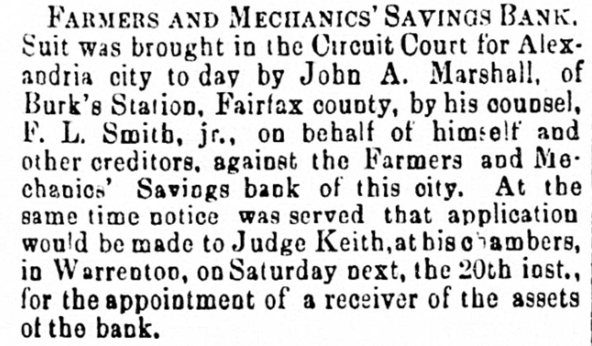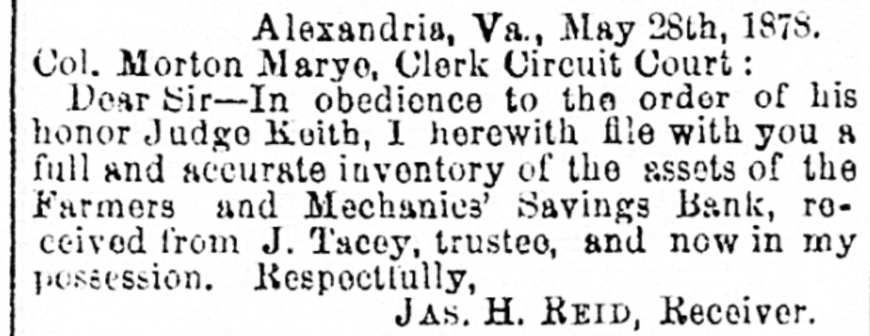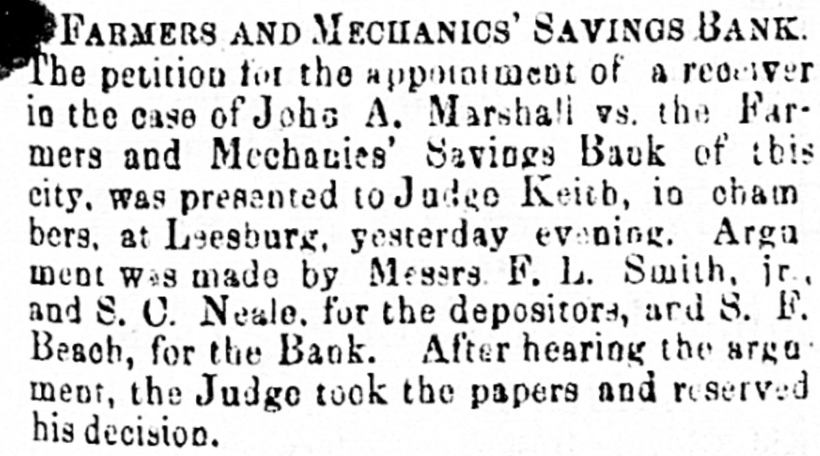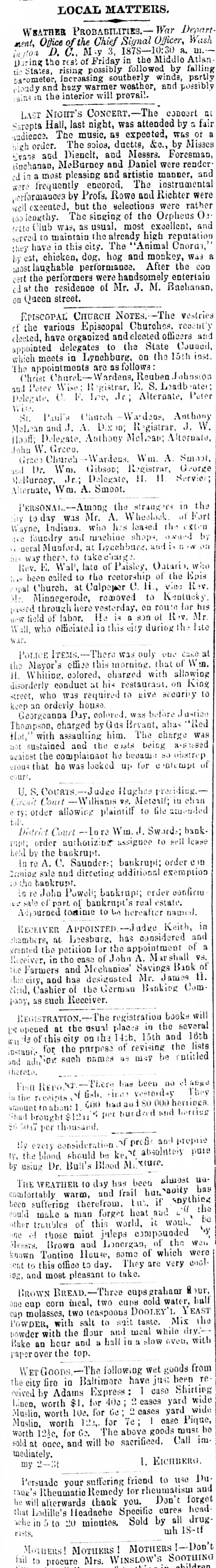 they have in this city. The "Animal Chorus," by eat, chicken, dog. hog and monkey, Was a most laughable performance. After the con cert the performers were handsomely entertain ed at the residence of Mr. J. M. Bachanan, on Queen street. EPISCOPAL CHURCH NoTEs.-The vestries of the various Episcopal Churches. recently elected, have organized and elected officers and appointed delegates to the State Council, which meets in Lynchburg. on the 15th inst. The appointments are as follows: Christ Wardens, Reuben Johnston and Peter Wise: Registrar, E. S. Leadbeater; Delegate, C. F. Inc. Jr; Alternate, Pater Wise. St. Paul's Church Wardens, Anthony Malean and J. A. Dixbo; Registrar, J. W. Hooff; Delegate, Anthony Melcan; Alternate, John W. Green. Grace Church -Wardens. Wm. A. Smoot, and Dr. Wm. Gibson; Registrar, George McBurney, Jr.; Delegate, 11. 11 Service; Alternate, W m. A. Smoot. PERSONAL - Among the strangers in the city to day was Mr. A. Wheelook of Fort Wayne, Indiana. who his leased the exten ive foundry and machine shops, owned by General Munford, at Lycehburg, and is W on ans way there, to take charge. Rev. E. Wall, late of Paisley, Oatario, who has been called to the rectorship of the Epis copal Church, at Calpeper C. H., view Rev. Mr. Minnegerode, removed to Kentucky. passed through here yesterday, co route for his new field of labor. He is a son of Rev. Mr. Wall, who officiated in this city during the Lite war. POLICE ITEMS.-There was only one case at the Mayor's office this morning. that of Wen. H. Whiting. colored, charged with allowing disorderly conduct at his restaurant. on King street, who was required to give security 10 keep an orderly house. Georgeanna Day, colored. was before Justice Thompson, charged by Gus Beyant, alias "Red Hot," with assaulting him. The charge was not sustained and the costs being assessed against the complainant he became so obstrep erous that he was looked up for intempt of court. U.S. COURTS.-Judge Hughes presiding.Circuit Court --Willhams VS. Metcalf; in chan ery; order allowing plaintiff to file amended bill. District Court -lore Wm. J. Swords; bankrupt; order authorizing assignee to sell lease held by the bankrupt. In TO A. C. Sauoder: bankrupi; order con Iming sale and directing additional exemption 10 the bankrupt. to re John Powell; bankrupt; order confirm or sale of part of bankrupt's real estate. Adjourned tominie to be hereafter named. RECEIVER APPOINTED.-Judge Keith, in chambers, at Leesburg. has considered and wranted the petition for the appointment of a Receiver, in the case of John A. Marshall VS. the Farmers and Mechanies' Savings Bank of this city, and has designated Mr. James 11. Reid, Cashier of the German Banking Company, as such Receiver. REGISTRATION.-The registration books will 18 opened at the usual places in the several WAL 13 of this city on the 14:b, 15th and 16th instant for the purpose of revising the lists and adving such names as may be entitled thereto. Fish REPORT-There has been ao change in the receipts of fish, since yesterday They amount to about 1. 000 hadaed 80 000 herriogs. Shad brought $12ai 5 per burdred and herring $6 5057 per thousand. By every consideration of profis and proprie ty, the blood should be ke,nt absolutely pure by using Dr. Bull's Blood M. clure. THE WEATHER to day has been almost uncomfortably warm, and frail but capity has been suffering therefrom. tut, if snything could make a man forget heat and 00 the other troubles of this world, it would be one of those mint juleps compounded by Messrs. Brown and Lonergan, of the wen known Tontine House, some of which were ent to this office to day. They are very cool. 10g, and most pleasant to take. BROWN BREAD.-Three eupsgrahanr a our, one cup corn meal, two cups cold water. half cup molasses, two teaspoons DOOLEY'L YEAST POWDER, with salt to suit taste. Mix the powder with the flour and meal while dry.-Bake an hour and 24 hall in a slow oven, with paperover the top.