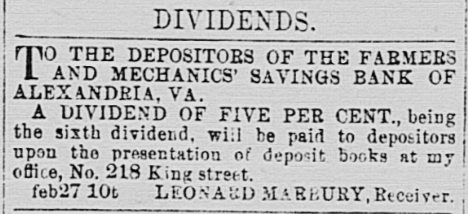 DIVIDENDS. T THE DEPOSITORS OF THE FARMERS AND MECHANICS' SAVINGS BANK OF ALEXANDRIA, VA. A DIVIDEND OF FIVE PER CENT., being the sixth dividend, will be paid to depositors upon the presentation of deposit books at my office, No. 218 King street. feb27 10t LEONARD MARBURY, Receiver.