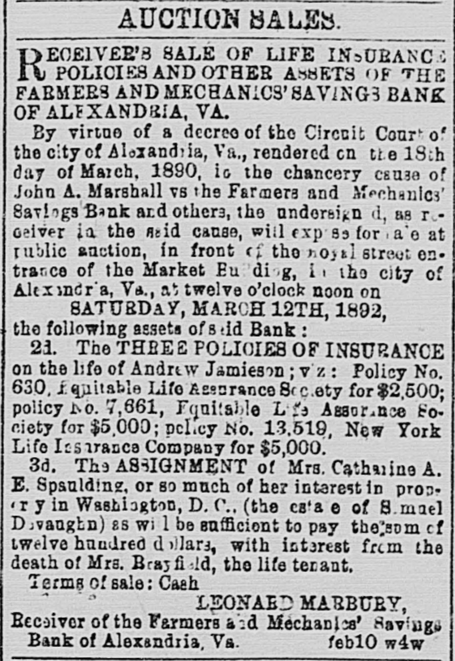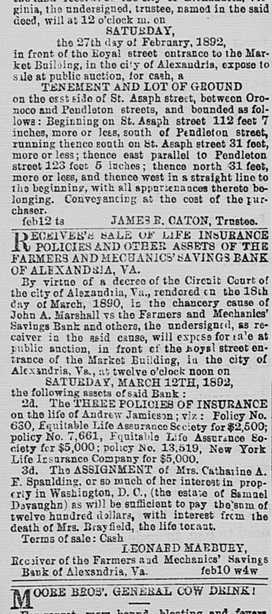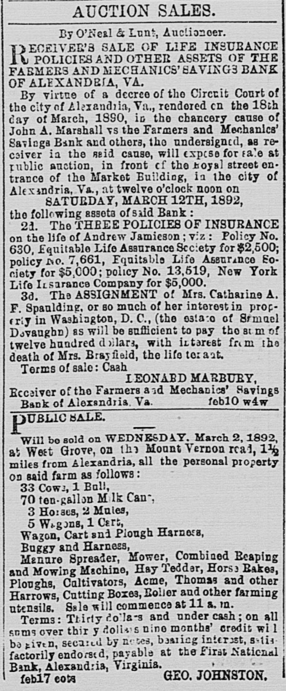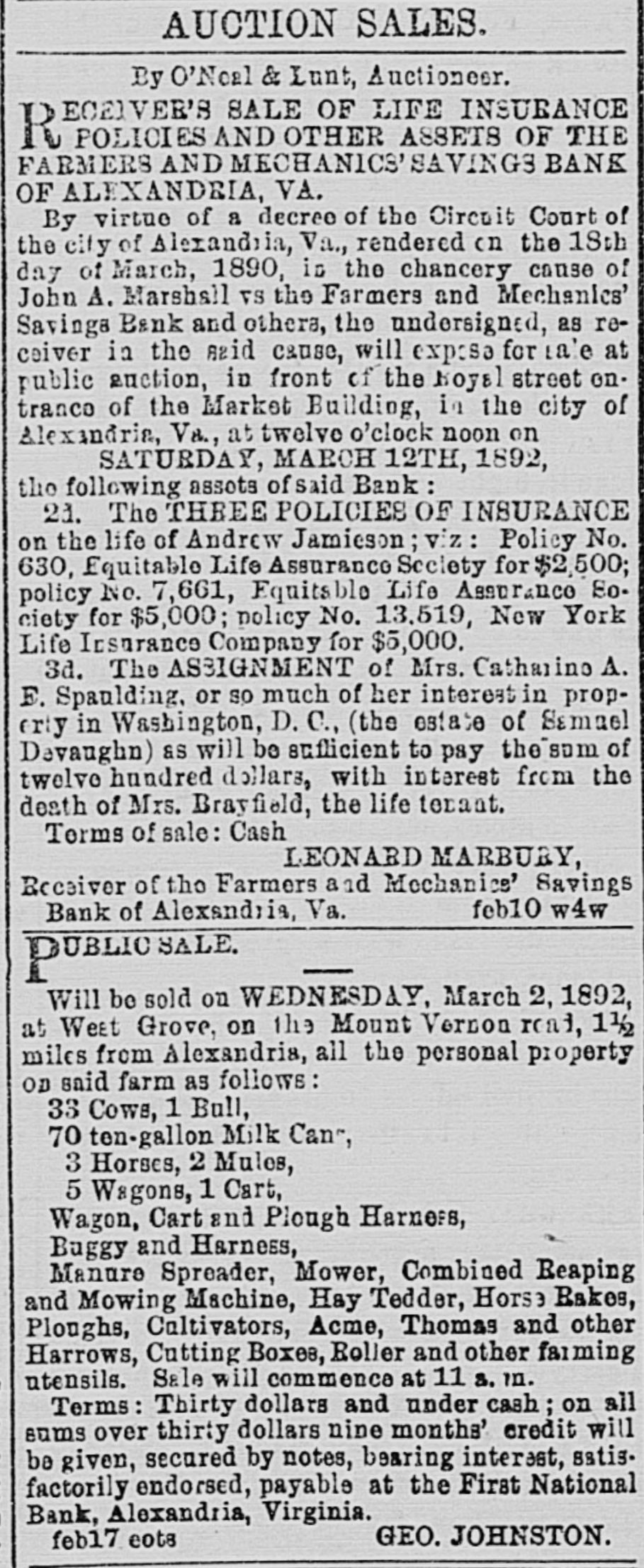 AUCTION SALES. By O'Noal & Lunt, Auctioneer. D ECEIVER'S SALE OF LIFE INSURANCE 10 POLICIES AND OTHER ASSETS OF THE FARMERS AND MECHANICS' SAVINGS BANK OF ALEXANDEIA, VA. By virtue of a decreo of the Circuit Court of the city of Alexandria, Va., rendered on the 18th day of March, 1890, is the chancery cause of John A. Marshall VS the Farmers and Mechanics' Savinga Bank and others, the undersigned, as receiver in the A2id cause, will exposa for La'e at public auction, in front of the Royal street ontranco of the Market Building, in the city of Alexindria, Va., at twelve o'clock noon on SATURDAY, MARCH 12TH, 1892, the following assots of said Bank: 21. The THREE POLICIES OF INSURANCE on the life of Andrew Jamieson; viz: Policy No. 630, Equitable Life Assurance Society for $2,500; policy No. 7,661, Equitable Life Assurance So. ciety for $5,000; policy No. 13,519, New York Life Insurance Company for $5,000. 3d. The ASSIGNMENT of Mrs. Catharino A. F. Spaulding, or so much of her interest in property in Washington, D. C., (the estate of Samuel Devaughn) as will be sufficient to pay the som of twelve hundred dollars, with interest from the death of Mrs. Brayfield, the life terant. Terms of sale: Cash LEONARD MARBURY, Receiver of the Farmers and Mechanics' Savings feb10 w4w Bank of Alexandria, Va. D UBLIC SALE. L Will be sold on WEDNESDAY, March 2, 1892, at West Grove, on the Mount Vernon read, 1 1/2 miles from Alexandria, all the personal property OD said farm as follows: 33 Cows, 1 Bull, 70 ten-gallon Milk Can-, 3 Horses, 2 Mules, 5 Wagons, 1 Cart, Wagon, Cart and Plough Harness, Buggy and Harness, Manure Spreader, Mower, Combined Reaping and Mowing Machine, Hay Tedder, Horse Rakes, Ploughs, Cultivators, Acme, Thomas and other Harrows, Cutting Boxes, Roller and other faiming utensils. Sale will commence at 11 a. in. Terms: Thirty dollars and under cash; on all sums over thirty dollars nine months' credit will be given, secured by notes, bearing interest, satis. factorily endorsed, payable at the First National Bank, Alexandria, Virginia. GEO. JOHNSTON. feb17 eots