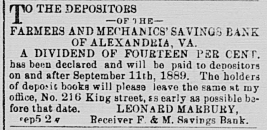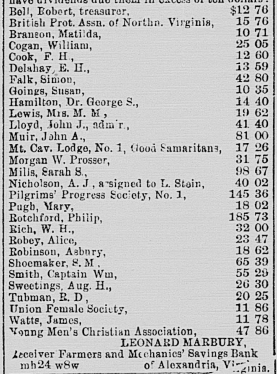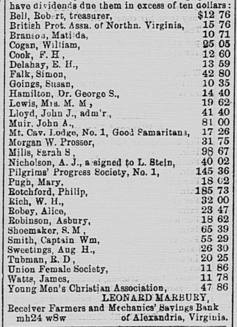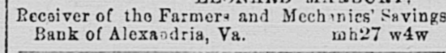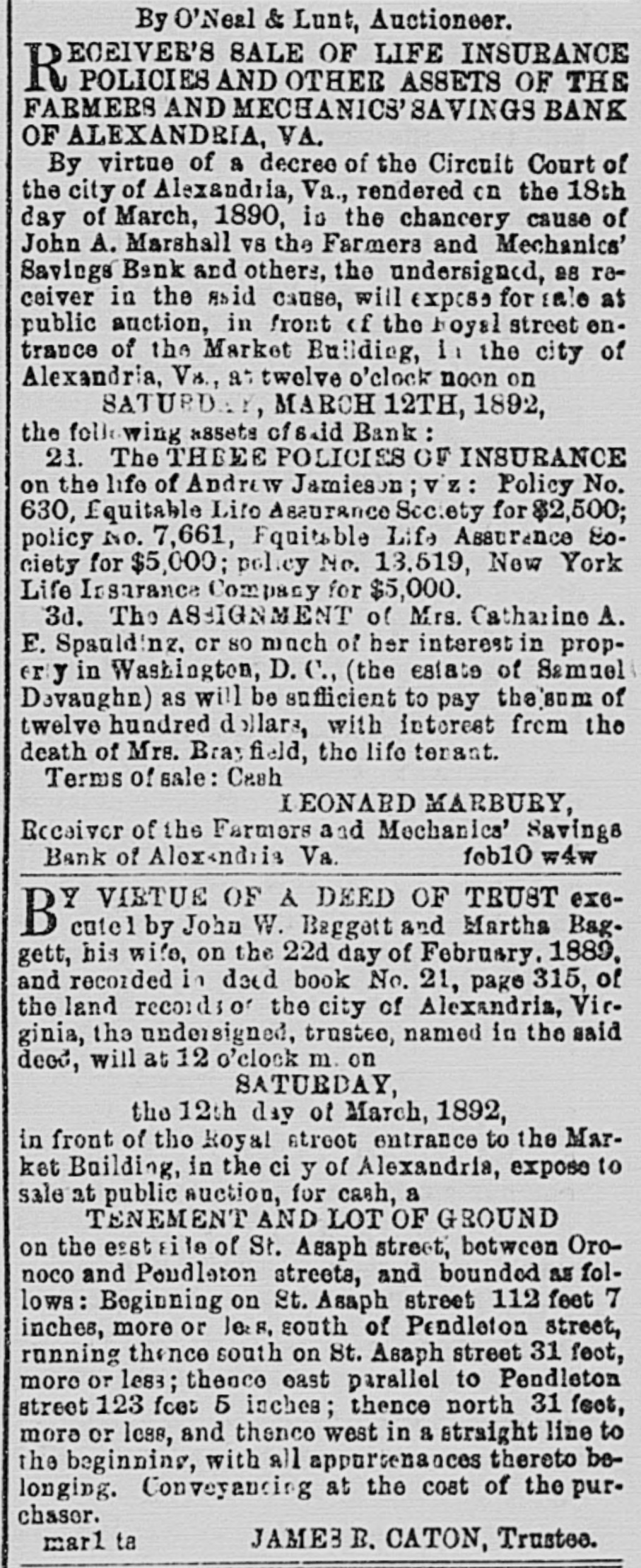 AUCTION SALES. By O'Noal & Lunt, Auctioneer. D ECEIVER'S SALE OF LIFE INSURANCE 10 POLICIES AND OTHER ASSETS OF THE FARMERS AND MECHANICS' SAVINGS BANK OF ALEXANDEIA, VA. By virtue of a decreo of the Circuit Court of the city of Alexandria, Va., rendered on the 18th day of March, 1890, is the chancery cause of John A. Marshall VS the Farmers and Mechanics' Savinga Bank and others, the undersigned, as receiver in the A2id cause, will exposa for La'e at public auction, in front of the Royal street ontranco of the Market Building, in the city of Alexindria, Va., at twelve o'clock noon on SATURDAY, MARCH 12TH, 1892, the following assots of said Bank: 21. The THREE POLICIES OF INSURANCE on the life of Andrew Jamieson; viz: Policy No. 630, Equitable Life Assurance Society for $2,500; policy No. 7,661, Equitable Life Assurance So. ciety for $5,000; policy No. 13,519, New York Life Insurance Company for $5,000. 3d. The ASSIGNMENT of Mrs. Catharino A. F. Spaulding, or so much of her interest in property in Washington, D. C., (the estate of Samuel Devaughn) as will be sufficient to pay the som of twelve hundred dollars, with interest from the death of Mrs. Brayfield, the life terant. Terms of sale: Cash LEONARD MARBURY, Receiver of the Farmers and Mechanics' Savings feb10 w4w Bank of Alexandria, Va. D UBLIC SALE. L Will be sold on WEDNESDAY, March 2, 1892, at West Grove, on the Mount Vernon read, 1 1/2 miles from Alexandria, all the personal property OD said farm as follows: 33 Cows, 1 Bull, 70 ten-gallon Milk Can-, 3 Horses, 2 Mules, 5 Wagons, 1 Cart, Wagon, Cart and Plough Harness, Buggy and Harness, Manure Spreader, Mower, Combined Reaping and Mowing Machine, Hay Tedder, Horse Rakes, Ploughs, Cultivators, Acme, Thomas and other Harrows, Cutting Boxes, Roller and other faiming utensils. Sale will commence at 11 a. in. Terms: Thirty dollars and under cash; on all sums over thirty dollars nine months' credit will be given, secured by notes, bearing interest, satis. factorily endorsed, payable at the First National Bank, Alexandria, Virginia. GEO. JOHNSTON. feb17 eots