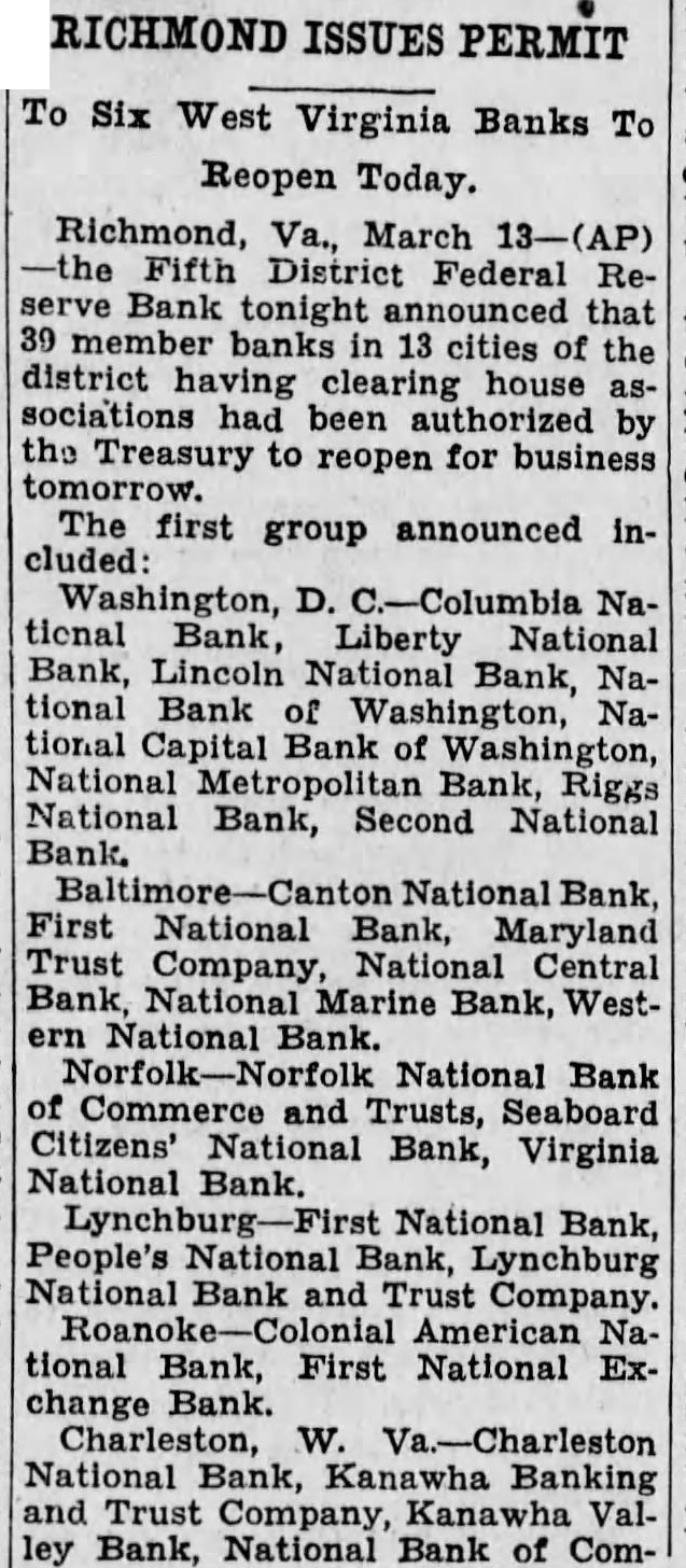 RICHMOND To Six Virginia Banks To Reopen Today. Richmond, March Fifth District Federal Bank tonight announced that banks cities the district clearing house by the to for business reopen The first group announced included: NaBank, Liberty National Bank, Lincoln National Bank, tional Bank Washington, tional Capital of Washington, Bank, Riggs National Bank, Second National Bank. National Bank, First National Bank, Maryland Trust Company, National Central Bank, National Marine Bank, WestNational Bank. National Bank and Seaboard Citizens' National Bank, Virginia National Bank. National Bank, People's National Lynchburg Bank and Trust Company. American Bank, First National Exchange Bank. Charleston, W. National Bank, Kanawha Trust Company, ley Bank, National Bank of Com-