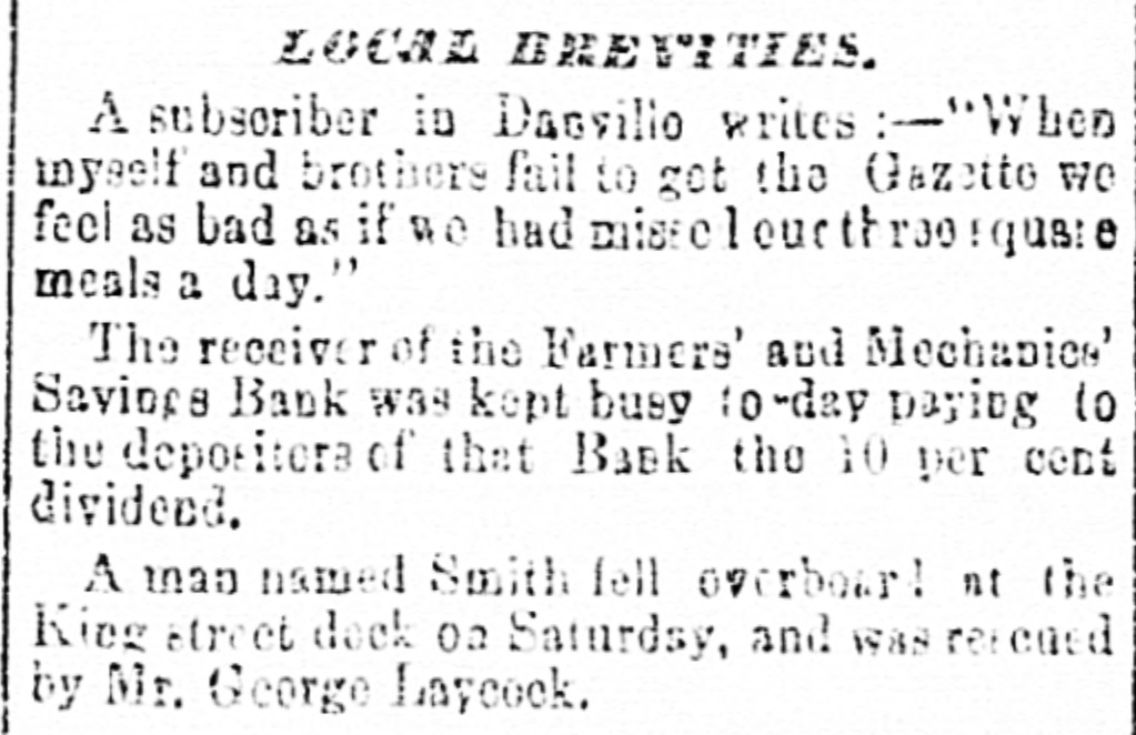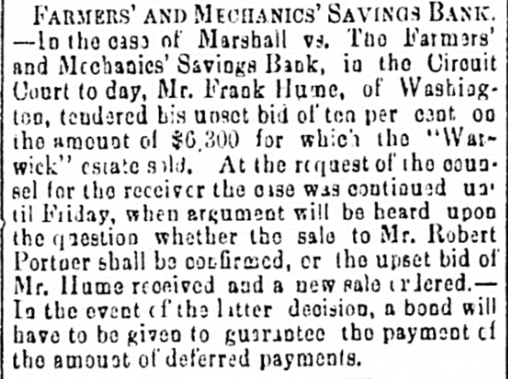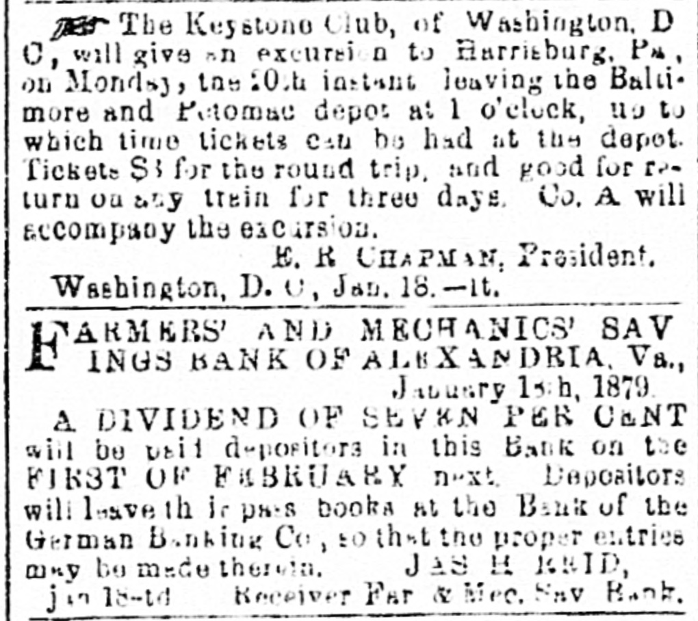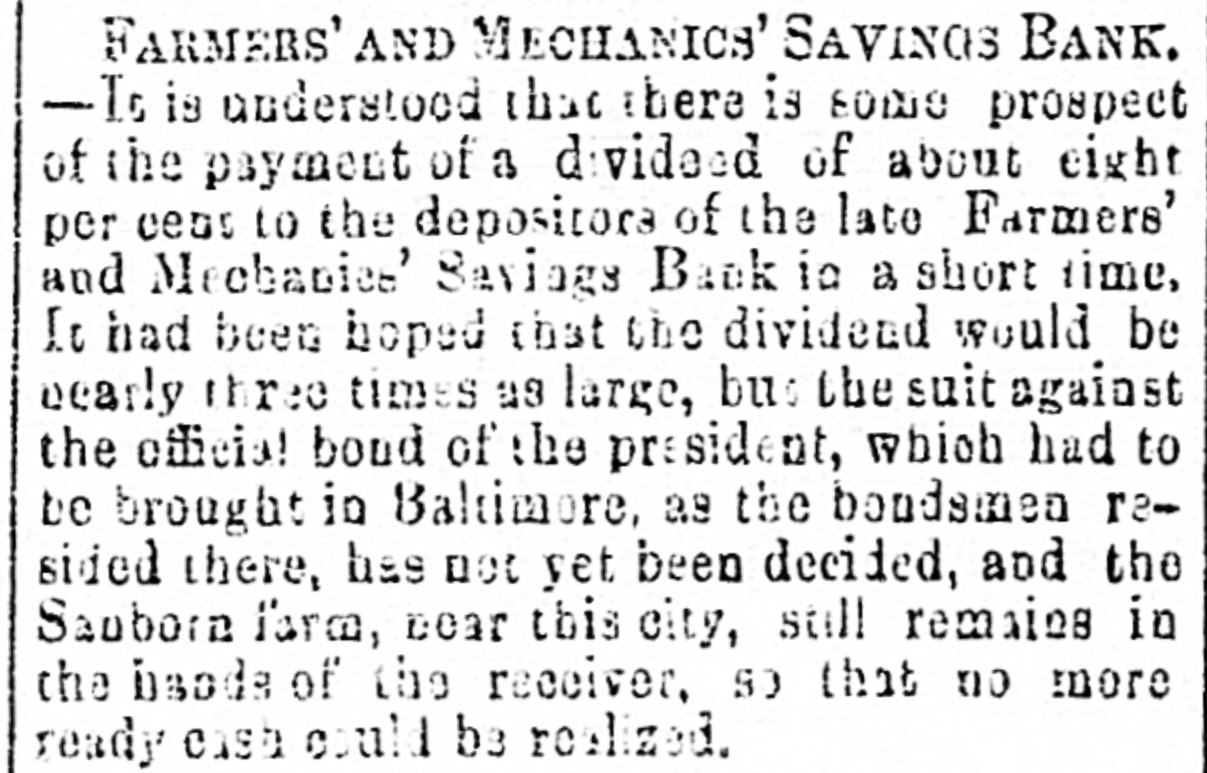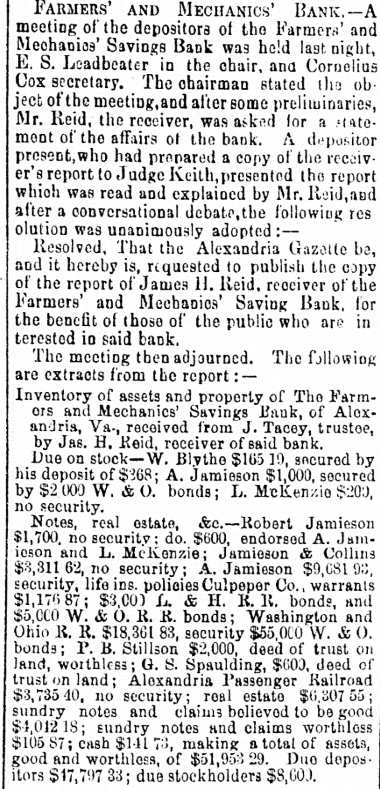 FARMERS' AND MECHANICS' BANK.-A meeting of the depositors of the Farmers' and Mechanics' Savings Bank was held last night, E. S. Leadbeater in the chair, and Cornelius Cox secretary. The chairman stated the ob. ject of the meeting, and after some preliminaries, Mr. Reid, the receiver, was asked for a state. ment of the affairs of the bank. A depositor present, who had prepared a copy of the receiver's report to Judge Keith, presented the report which was read and explained by Mr. Reid, and after a conversational debate, the following res olution was unanimously adopted :Resolved, That the Alexandria Gazette be, and it hereby is, requested to publish the copy of the report of James H. Reid. receiver of the Farmers' and Mechanics' Saving Bank. for the benefit of those of the public who are in terested in said bank. The meeting then adjourned. The following are extracts from the report :Inventory of assets and property of The Farmors and Mechanics' Savings Bank, of Alexandria, Va., received from J. Tacey, trustee, by Jas. H. Reid, receiver of said bank. Due on stock-W. Blythe $165 19, secured by his deposit of $368; A. Jamieson $1,000, secured by $2,000 W. & O. bonds; L. McKenzie $200, no security. Notes, real estate, &c.-Robert Jamieson $1,700. no security: do. $600, endorsed A. Jamieson and L. McKenzie; Jamieson & Collins $8,311 62, no security; A. Jamieson $9,681 93, security, life ins. policies Culpeper Co., warrants $1,176 87 ; $3,00) L. & H. R. R. bonds, and $5,000 W. & O. R. R. bonds; Washington and Ohio R. R. $18,361 83, security $55,000 W. & O. bonds; P. B. Stillson $2,000, deed of trust on land, worthless; G. S. Spaulding, $600, deed of trust on land; Alexandria Passenger Railroad $3,735 40, no security; real estate $6,307 55; sundry notes and claims believed to be good $4,012 18; sundry notes and claims worthless $105 S7; cash $141 73, making a total of assets, good and worthless, of $51,953 29. Due depos. itors $47,797 33; due stockholders $8,600.