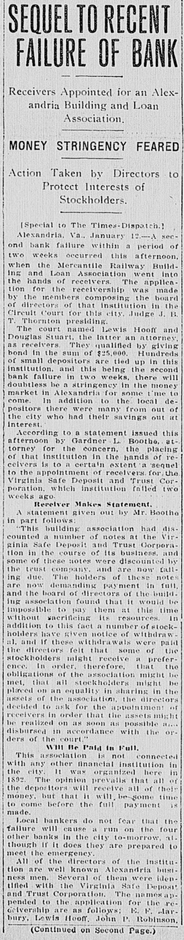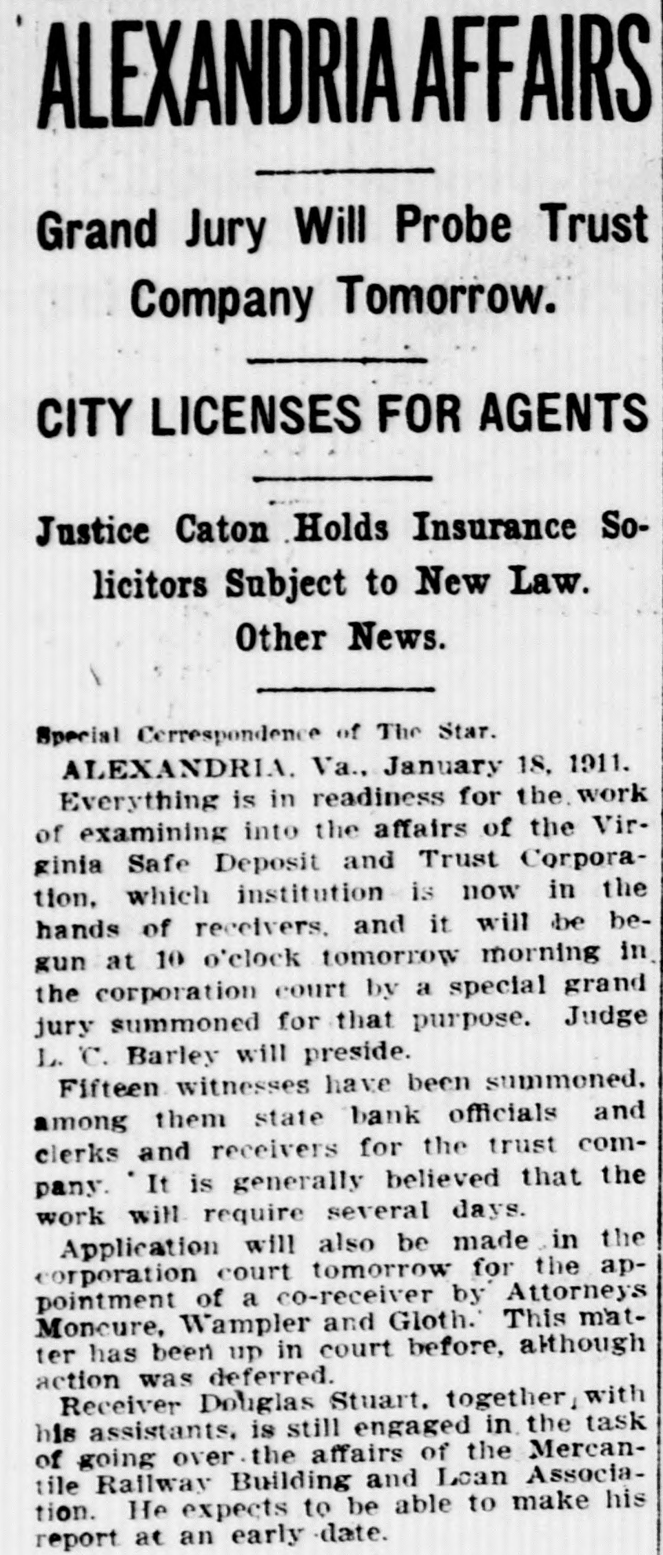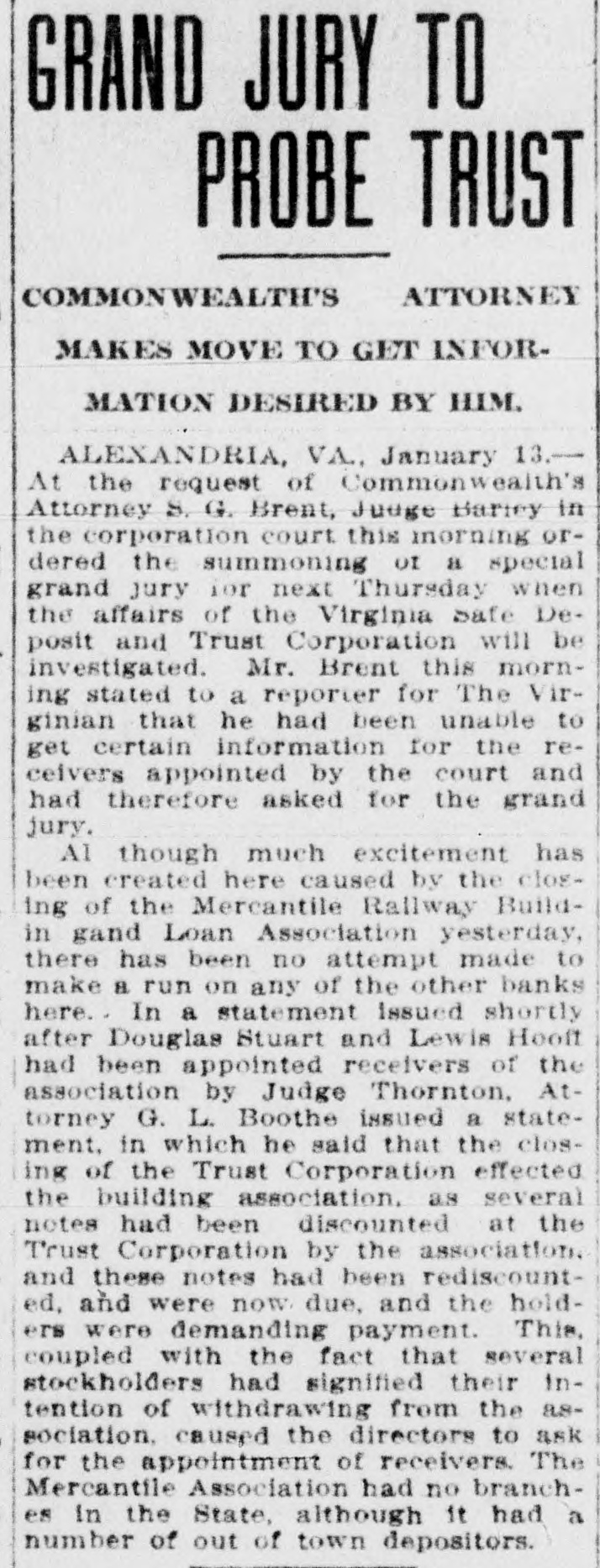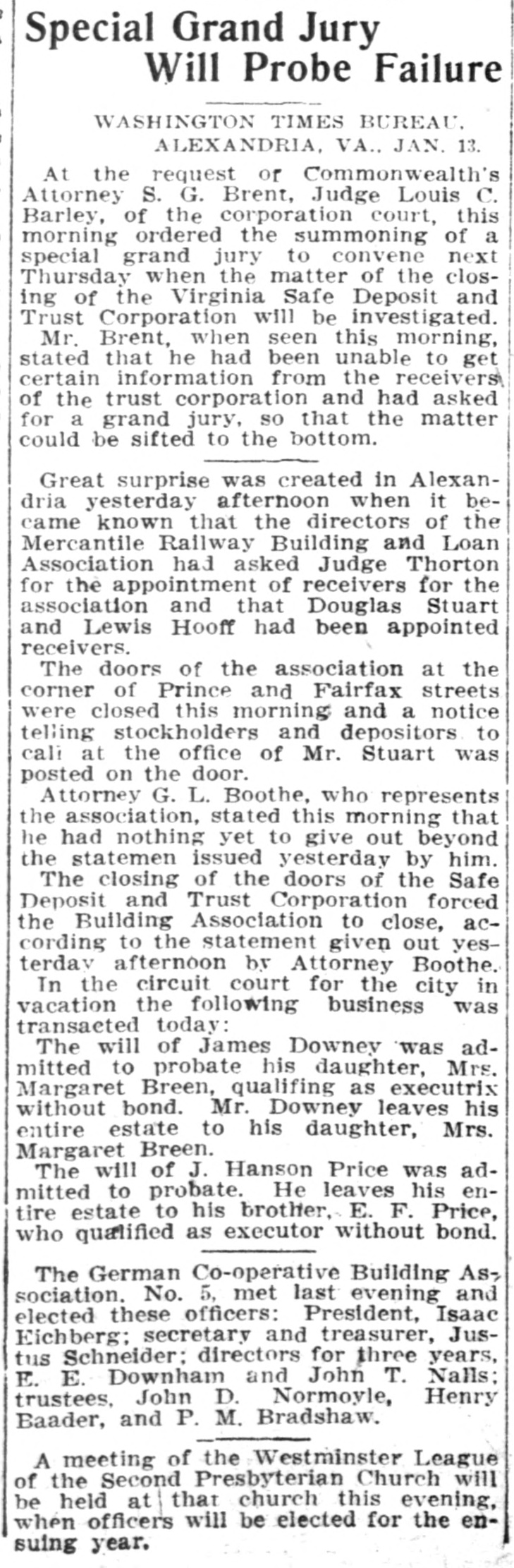 Special Grand Jury Will Probe Failure WASHINGTON TIMES BUREAU. ALEXANDRIA, VA., JAN. 13. At the request or Commonwealth's Attorney S. G. Brent, Judge Louis C. Barley, of the corporation court, this morning ordered the summoning of a special grand jury to convene next Thursday when the matter of the closing of the Virginia Safe Deposit and Trust Corporation will be investigated. Mr. Brent, when seen this morning, stated that he had been unable to get certain information from the receivers of the trust corporation and had asked for a grand jury, SO that the matter could be sifted to the bottom. Great surprise was created in Alexandria yesterday afternoon when it became known that the directors of the Mercantile Railway Building and Loan Association had asked Judge Thorton for the appointment of receivers for the association and that Douglas Stuart and Lewis Hooff had been appointed receivers. The doors of the association at the corner of Prince and Fairfax streets were closed this morning and a notice telling stockholders and depositors to cali at the office of Mr. Stuart was posted on the door. Attorney G. L. Boothe, who represents the association, stated this morning that he had nothing yet to give out beyond the statemen issued yesterday by him. The closing of the doors of the Safe Deposit and Trust Corporation forced the Building Association to close, according to the statement given out yesterday afternoon by Attorney Boothe. In the circuit court for the city in vacation the following business was transacted today: The will of James Downey was admitted to probate his daughter, Mrs. Margaret Breen, qualifing as executrix without bond. Mr. Downey leaves his entire estate to his daughter, Mrs. Margaret Breen. The will of J. Hanson Price was admitted to probate. He leaves his entire estate to his brother, E. F. Price, who qualified as executor without bond. The German Co-operative Building Association. No. 5, met last evening and elected these officers: President, Isaac Eichberg: secretary and treasurer, Justus Schneider: directors for three years, E. E. Downham and John T. Nalls; trustees, John D. Normoyle, Henry Baader, and P. M. Bradshaw. A meeting of the Westminster League of the Second Presbyterian Church will be held at that church this evening, when officers will be elected for the ensuing year.