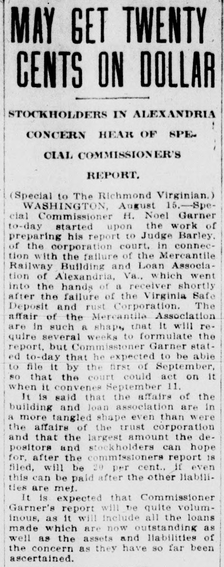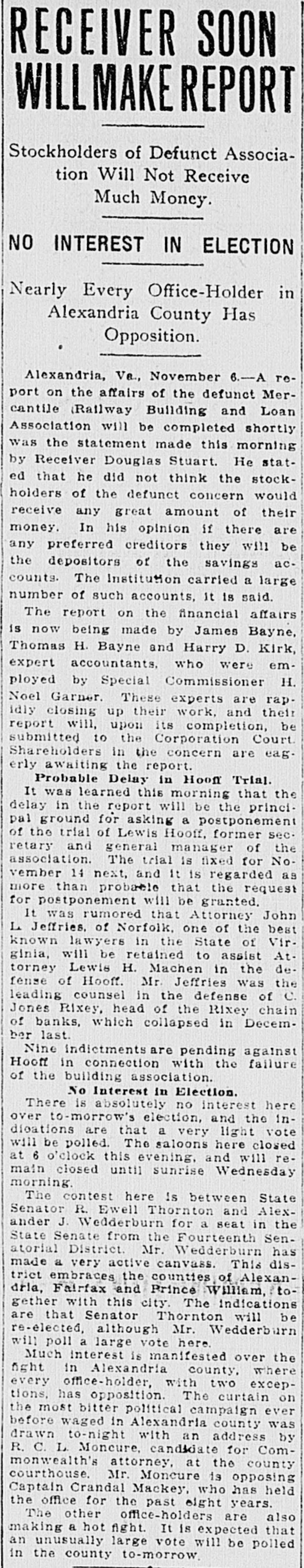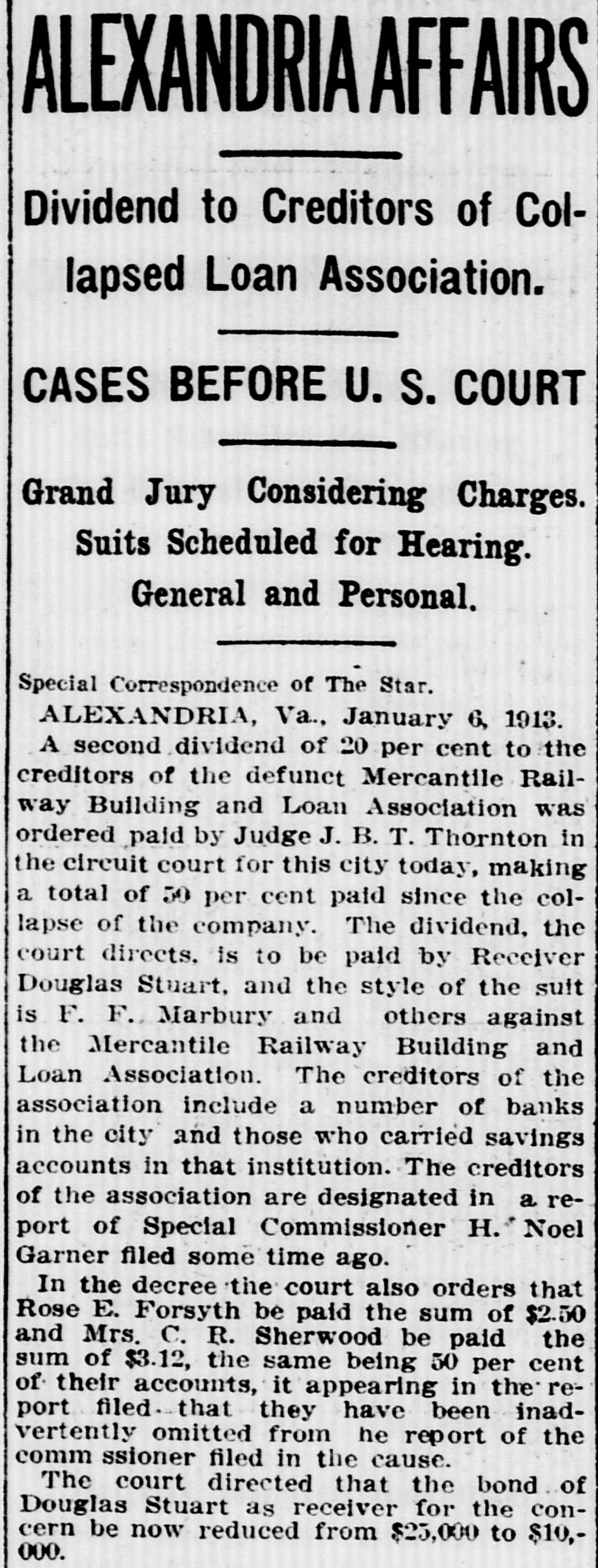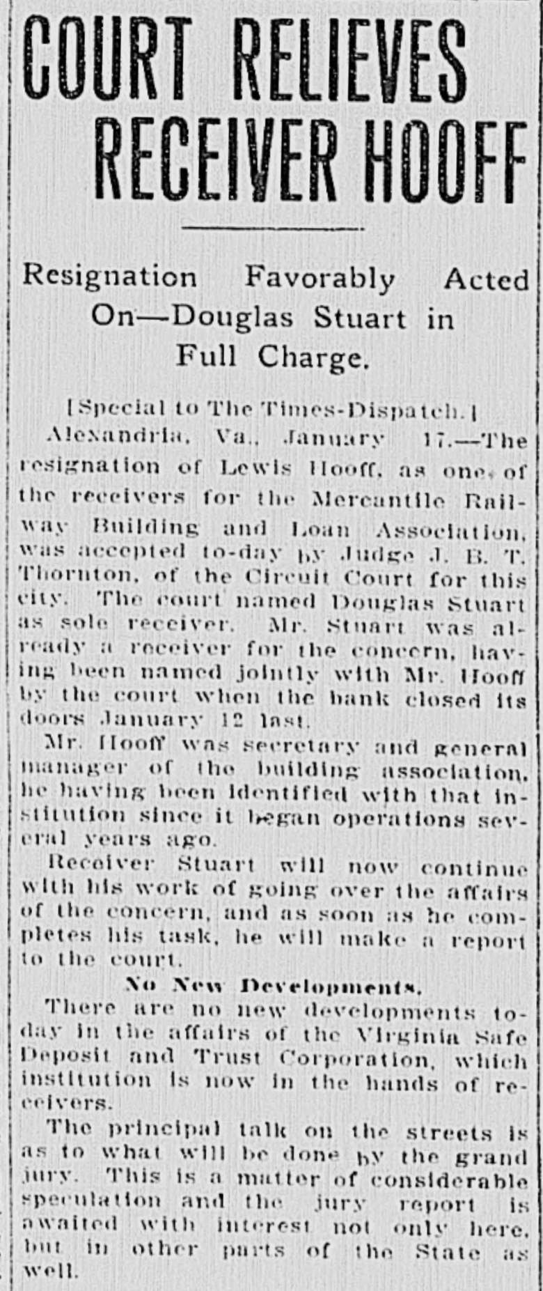 Special Grand Jury Will Probe Failure WASHINGTON TIMES BUREAU. ALEXANDRIA, VA., JAN. 13. At the request or Commonwealth's Attorney S. G. Brent, Judge Louis C. Barley, of the corporation court, this morning ordered the summoning of a special grand jury to convene next Thursday when the matter of the closing of the Virginia Safe Deposit and Trust Corporation will be investigated. Mr. Brent, when seen this morning, stated that he had been unable to get certain information from the receivers of the trust corporation and had asked for a grand jury, SO that the matter could be sifted to the bottom. Great surprise was created in Alexandria yesterday afternoon when it became known that the directors of the Mercantile Railway Building and Loan Association had asked Judge Thorton for the appointment of receivers for the association and that Douglas Stuart and Lewis Hooff had been appointed receivers. The doors of the association at the corner of Prince and Fairfax streets were closed this morning and a notice telling stockholders and depositors to cali at the office of Mr. Stuart was posted on the door. Attorney G. L. Boothe, who represents the association, stated this morning that he had nothing yet to give out beyond the statemen issued yesterday by him. The closing of the doors of the Safe Deposit and Trust Corporation forced the Building Association to close, according to the statement given out yesterday afternoon by Attorney Boothe. In the circuit court for the city in vacation the following business was transacted today: The will of James Downey was admitted to probate his daughter, Mrs. Margaret Breen, qualifing as executrix without bond. Mr. Downey leaves his entire estate to his daughter, Mrs. Margaret Breen. The will of J. Hanson Price was admitted to probate. He leaves his entire estate to his brother, E. F. Price, who qualified as executor without bond. The German Co-operative Building Association. No. 5, met last evening and elected these officers: President, Isaac Eichberg: secretary and treasurer, Justus Schneider: directors for three years, E. E. Downham and John T. Nalls; trustees, John D. Normoyle, Henry Baader, and P. M. Bradshaw. A meeting of the Westminster League of the Second Presbyterian Church will be held at that church this evening, when officers will be elected for the ensuing year.