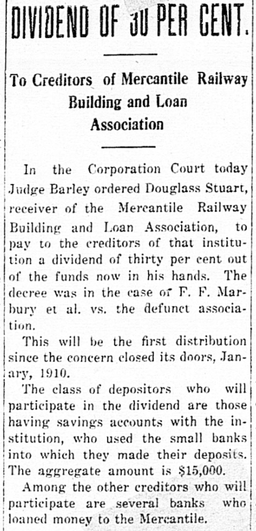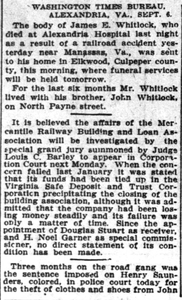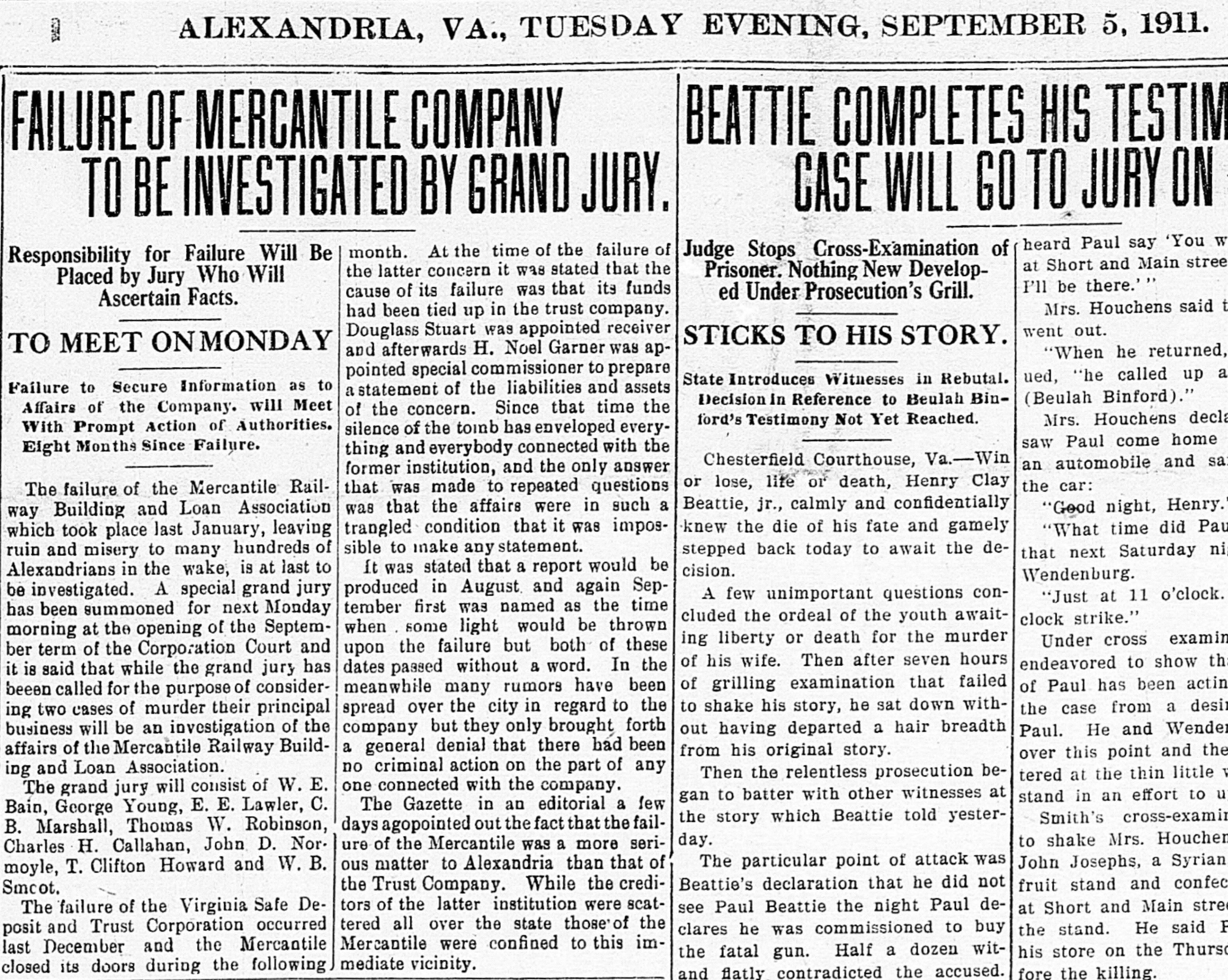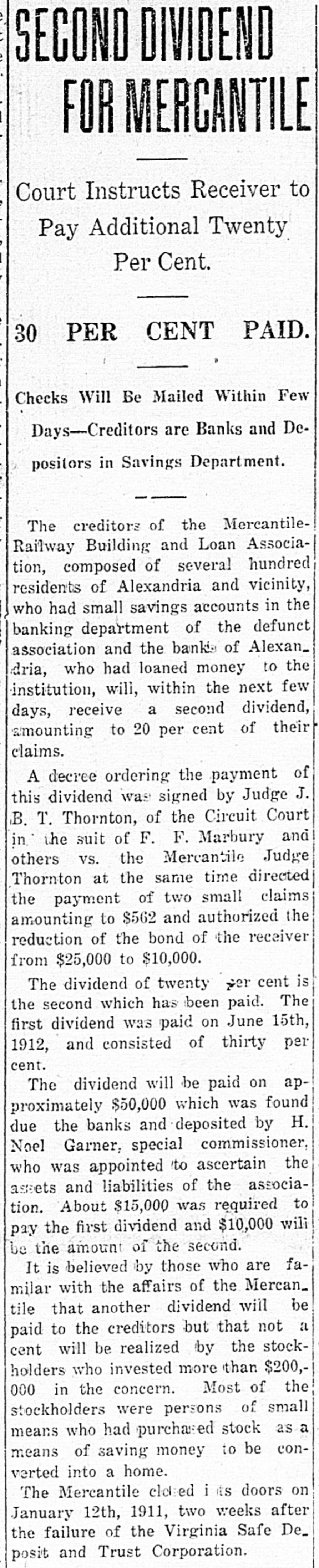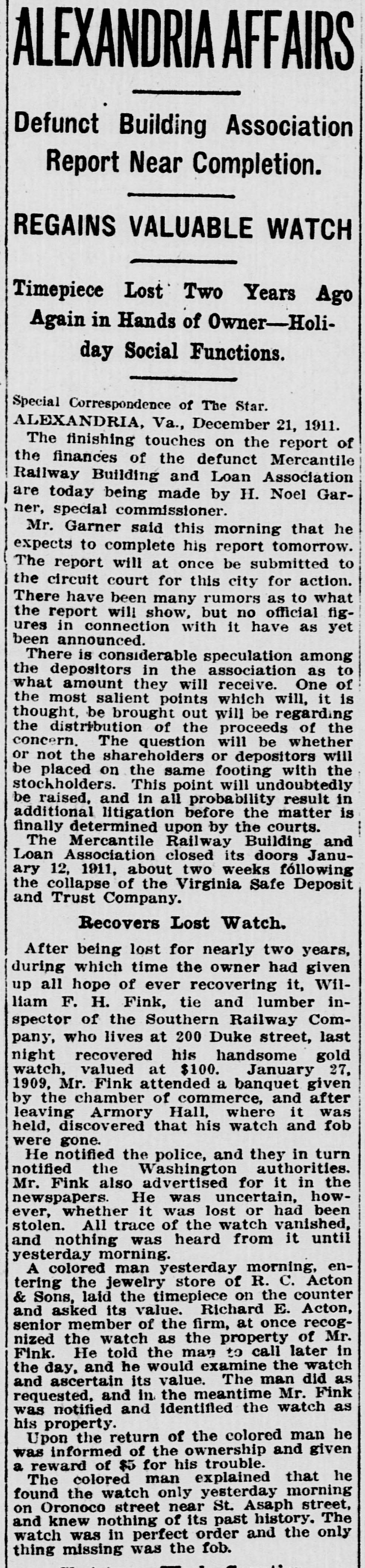 Special Grand Jury Will Probe Failure WASHINGTON TIMES BUREAU. ALEXANDRIA, VA., JAN. 13. At the request or Commonwealth's Attorney S. G. Brent, Judge Louis C. Barley, of the corporation court, this morning ordered the summoning of a special grand jury to convene next Thursday when the matter of the closing of the Virginia Safe Deposit and Trust Corporation will be investigated. Mr. Brent, when seen this morning, stated that he had been unable to get certain information from the receivers of the trust corporation and had asked for a grand jury, SO that the matter could be sifted to the bottom. Great surprise was created in Alexandria yesterday afternoon when it became known that the directors of the Mercantile Railway Building and Loan Association had asked Judge Thorton for the appointment of receivers for the association and that Douglas Stuart and Lewis Hooff had been appointed receivers. The doors of the association at the corner of Prince and Fairfax streets were closed this morning and a notice telling stockholders and depositors to cali at the office of Mr. Stuart was posted on the door. Attorney G. L. Boothe, who represents the association, stated this morning that he had nothing yet to give out beyond the statemen issued yesterday by him. The closing of the doors of the Safe Deposit and Trust Corporation forced the Building Association to close, according to the statement given out yesterday afternoon by Attorney Boothe. In the circuit court for the city in vacation the following business was transacted today: The will of James Downey was admitted to probate his daughter, Mrs. Margaret Breen, qualifing as executrix without bond. Mr. Downey leaves his entire estate to his daughter, Mrs. Margaret Breen. The will of J. Hanson Price was admitted to probate. He leaves his entire estate to his brother, E. F. Price, who qualified as executor without bond. The German Co-operative Building Association. No. 5, met last evening and elected these officers: President, Isaac Eichberg: secretary and treasurer, Justus Schneider: directors for three years, E. E. Downham and John T. Nalls; trustees, John D. Normoyle, Henry Baader, and P. M. Bradshaw. A meeting of the Westminster League of the Second Presbyterian Church will be held at that church this evening, when officers will be elected for the ensuing year.