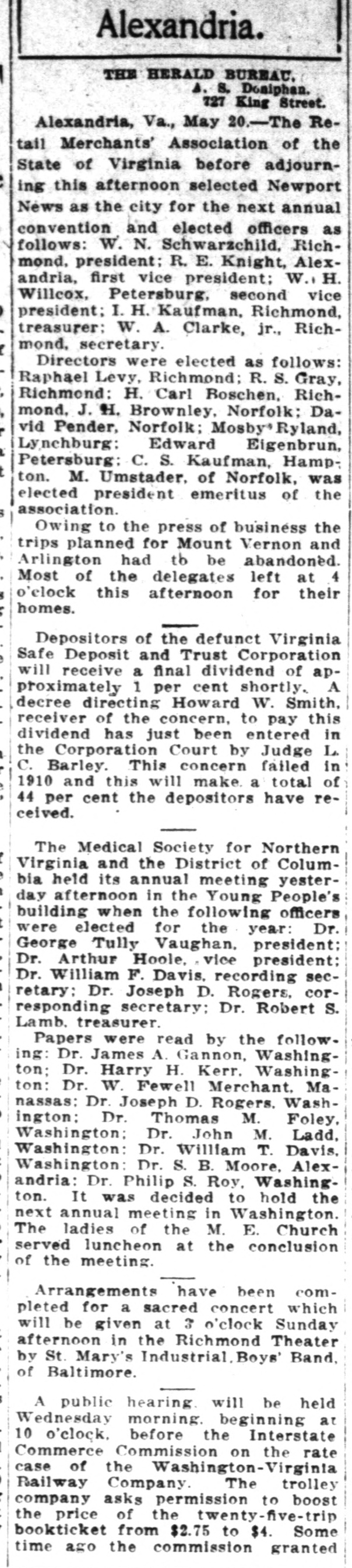 Alexandria. THE HERALD BUREAU. A. S. Dosiphan. 727 King Street. Alexandria, Va., May 20.-The Retail Merchants' Association of the State of Virginia before adjourn: ing this afternoon selected Newport News as the city for the next annual convention and elected officers as follows: W. N. Schwarzchild, Richmond, president: R. E. Knight, Alexandria, first vice president: W.TH. Willcox, Petersburg. second vice ) president: I. H. Kaufman, Richmond, treasurer: W. A. Clarke, jr., Richmond. secretary. f Directors were elected as follows: Raphael Levy, Richmond; R. S. Gray, Richmond: H. Carl Boschen, Richmond. J. H. Brownley, Norfolk: David Pender, Norfolk; Mosby Ryland, Lynchburg: Edward Eigenbrun, Petersburg: C. S. Kaufman, Hampt ton. M. Umstader. of Norfolk, was elected president emeritus of the association. $ Owing to the press of business the trips planned for Mount Vernon and Arlington had tb be abandoned. Most of the delegates left at 4 o'clock this afternoon for their homes. Depositors of the defunct Virginia Safe Deposit and Trust Corporation will receive a final dividend of approximately 1 per cent shortly. A decree directing Howard W. Smith, receiver of the concern, to pay this dividend has just been entered in the Corporation Court by Judge L. C. Barley. This concern failed in 1910 and this will make. a total of 44 per cent the depositors have received. The Medical Society for Northern : Virginia and the District of Columbia held its annual meeting yesterday afternoon in the Young People's building when the following officers t were elected for the year: Dr. George Tully Vaughan, president: Dr. Arthur Hoole, vice president: Dr. William F. Davis, recording sec1 retary: Dr. Joseph D. Rogers. corresponding secretary; Dr. Robert S. Lamb. treasurer. Papers were read by the following: Dr. James A. Gannon, Washington: Dr. Harry H. Kerr. Washing ton: Dr. W. Fewell Merchant. Manassas: Dr. Joseph D. Rogers. Washington: Dr. Thomas M. Foley, Washington Dr. John M. Ladd, Washington Dr. William T. Davis, Washington Dr. S. B. Moore, Alexandria: Dr. Philip S. Roy, Washington. It was decided to hold the next annual meeting in Washington. The ladies of the M. E. Church served luncheon at the conclusion of the meeting. Arrangements have been completed for a sacred concert which will be given at 3 o'clock Sunday afternoon in the Richmond Theater by St. Mary's Industrial Boys' Band, of Baltimore. A public hearing will be held Wednesday morning. beginning at 10 o'clock. before the Interstate Commerce Commission on the rate case of the Washington-Virginia Railway Company The trolley company asks permission to boost the price of the twenty-five-trip bookticket from $2.75 to $4. Some time ago the commission granted