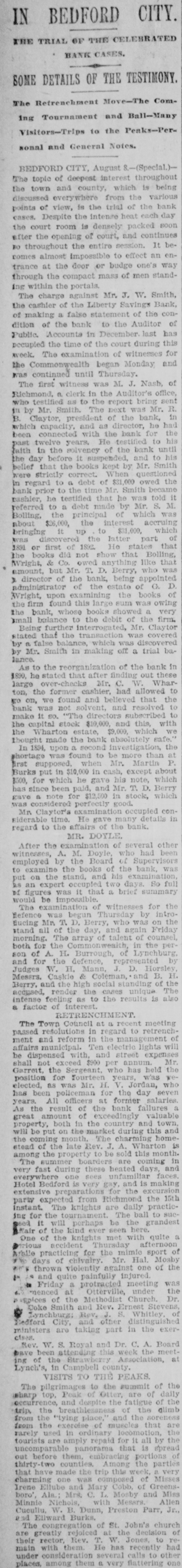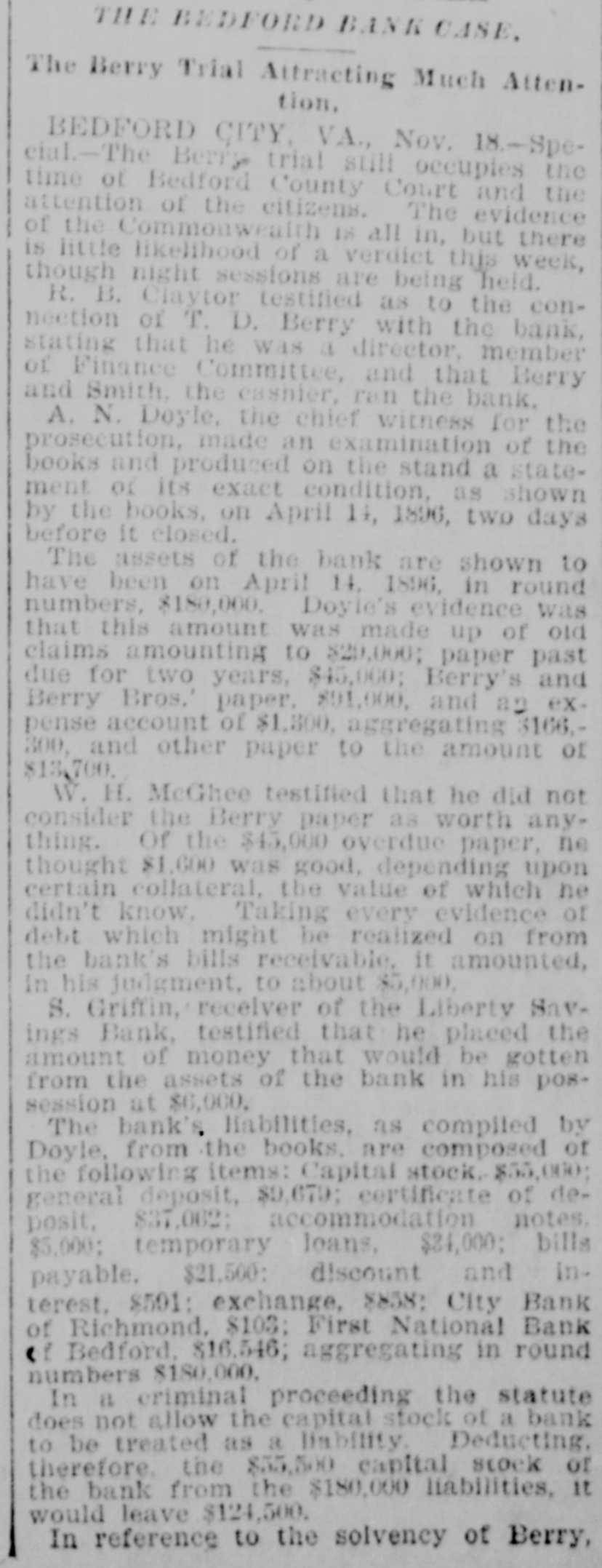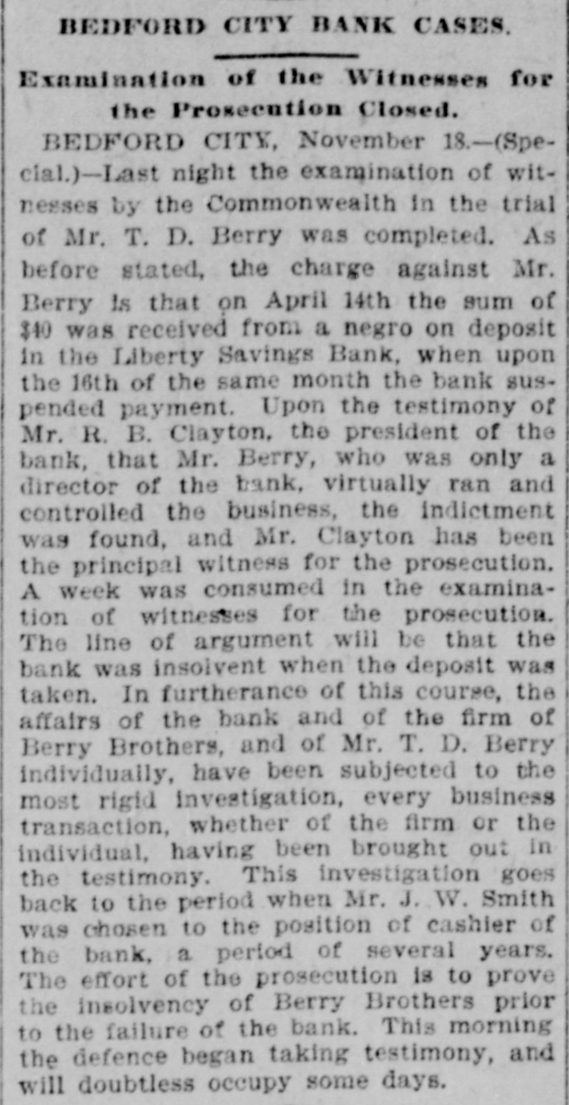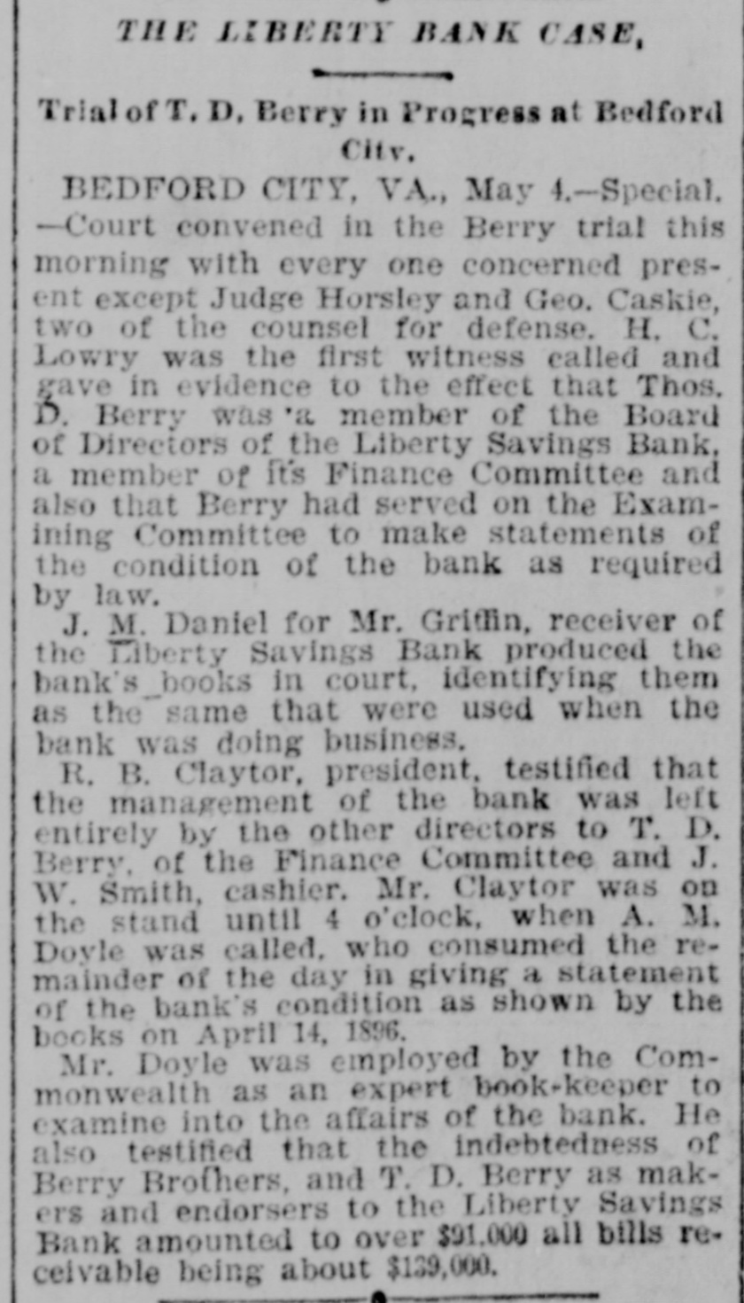 The first witness was M. J. Nash, of Richmond, a clerk in the Auditor's office, who testified as to the report bring sent in by Mr. Smith. The next was Mr. R. B. Claytor, president of the bank, in which capacity, and as director, he had been connected with the bank for the past twelve years. He testified to his faith in the solvency of the bank until the day before it suspended, and to his belief that the books kept by Mr. Smith were strictly correct. When questioned in regard to a debt of $31,000 owed the bank prior to the time Mr. Smith became cashier, he testified that he was told it referred to a debt made by Mr. S. M. Bolling, the principal of which was about $26,000, the interest accruing bringing it up to $31,000, which was discovered the latter part of 1891 or first of 1892. He states that the books did not show that Bolling, Wright, & Co. owed anything like that amount, but Mr. T. D. Berry, who was director of the bank, being appointed administrator of the estate of C. D. Wright, upon examining the books of the firm found this large sum was owing the bank, whose books showed a very small balance to the debit of the firm. Being further interrogated, Mr. Claytor stated that the transaction was covered by a false balance, which was discovered by Mr. Smith in making off a trial balance.