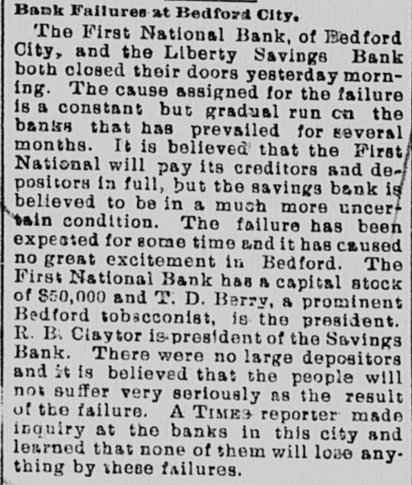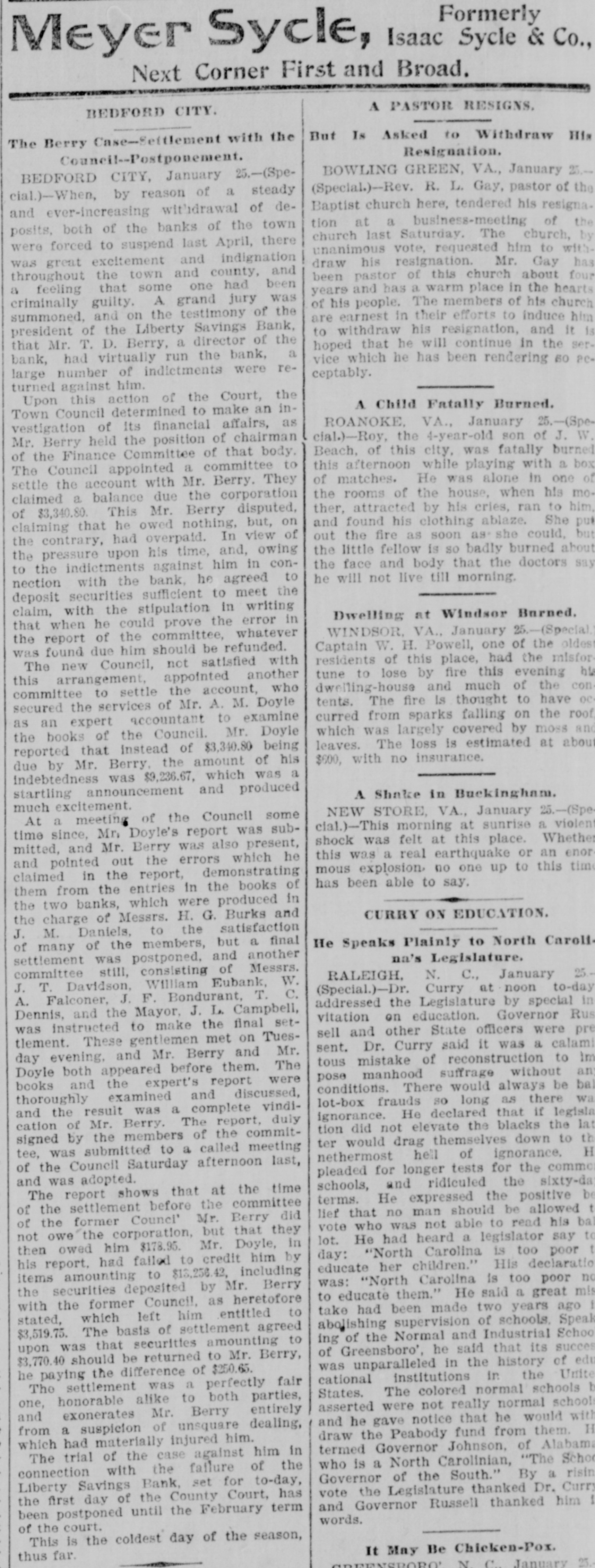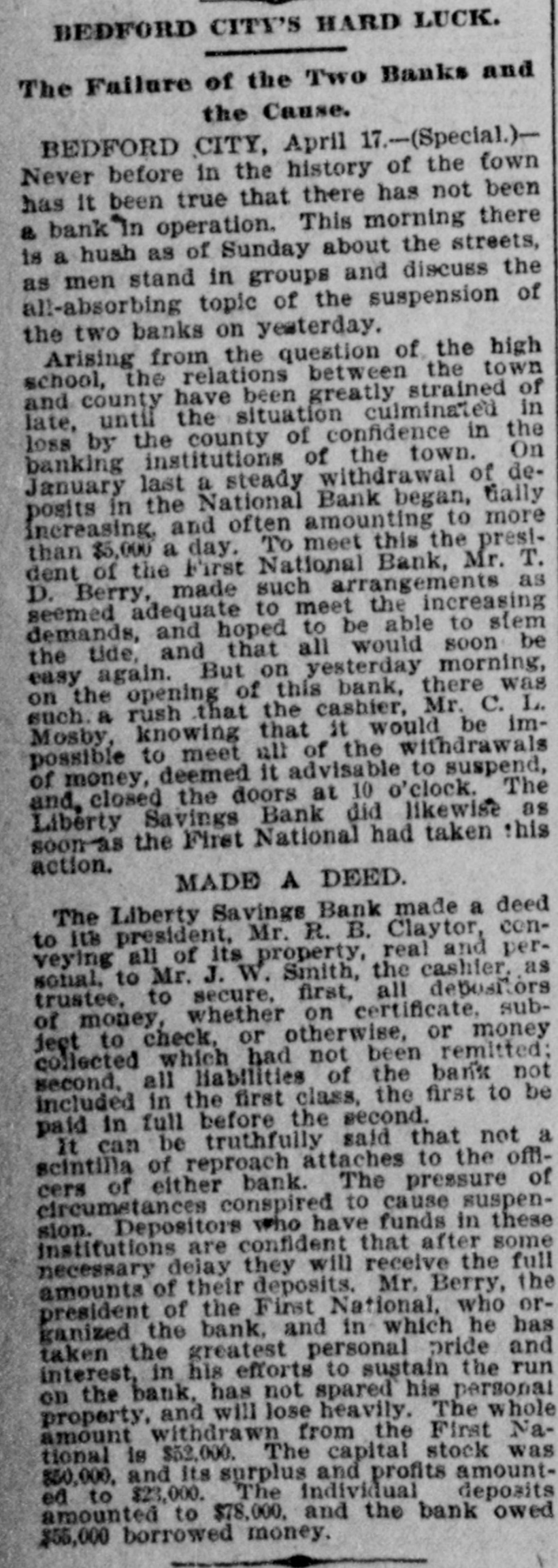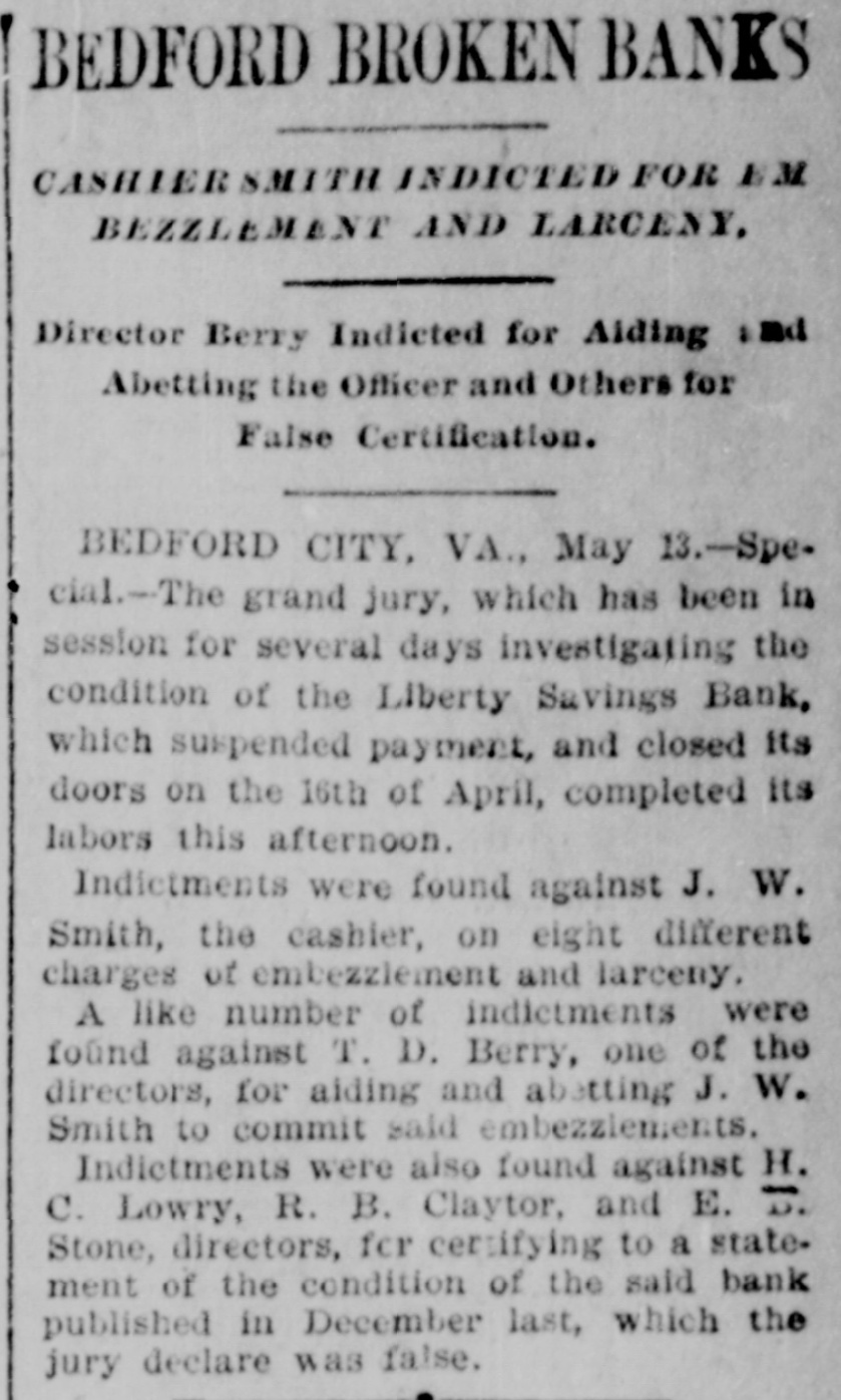The first witness was M. J. Nash, of Richmond, a clerk in the Auditor's office, who testified as to the report bring sent in by Mr. Smith. The next was Mr. R. B. Claytor, president of the bank, in which capacity, and as director, he had been connected with the bank for the past twelve years. He testified to his faith in the solvency of the bank until the day before it suspended, and to his belief that the books kept by Mr. Smith were strictly correct. When questioned in regard to a debt of $31,000 owed the bank prior to the time Mr. Smith became cashier, he testified that he was told it referred to a debt made by Mr. S. M. Bolling, the principal of which was about $26,000, the interest accruing bringing it up to $31,000, which was discovered the latter part of 1891 or first of 1892. He states that the books did not show that Bolling, Wright, & Co. owed anything like that amount, but Mr. T. D. Berry, who was director of the bank, being appointed administrator of the estate of C. D. Wright, upon examining the books of the firm found this large sum was owing the bank, whose books showed a very small balance to the debit of the firm. Being further interrogated, Mr. Claytor stated that the transaction was covered by a false balance, which was discovered by Mr. Smith in making off a trial balance.