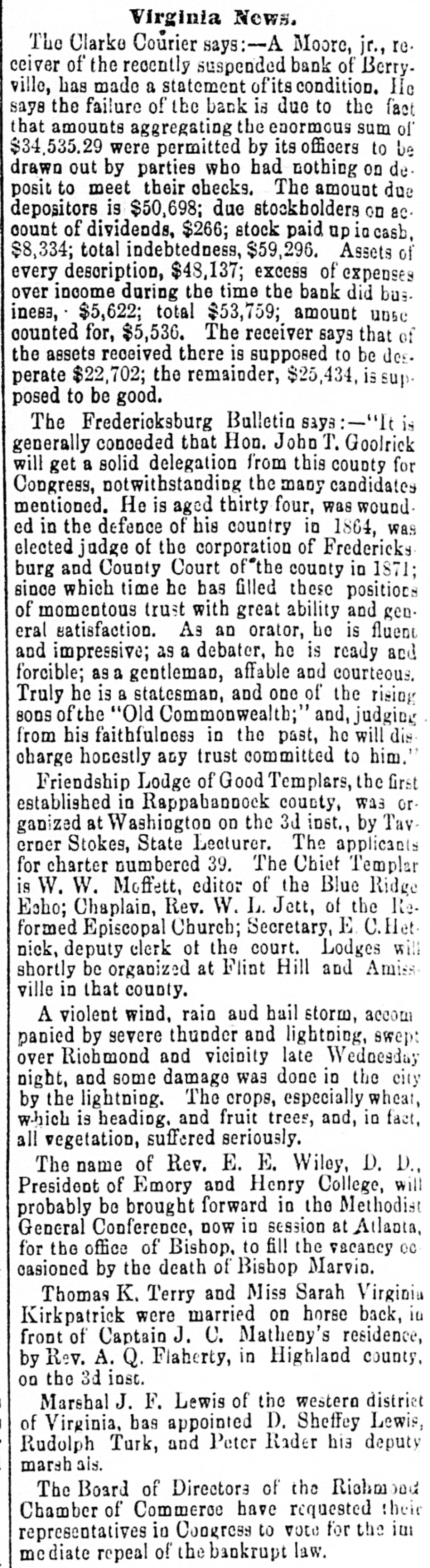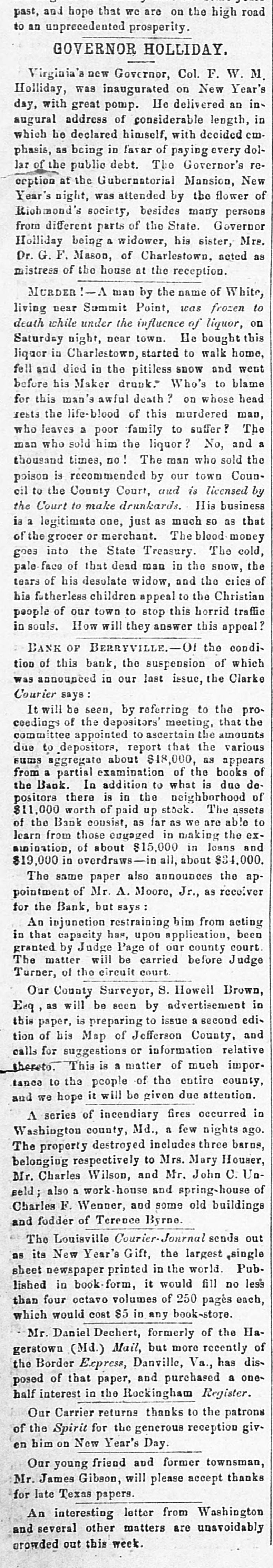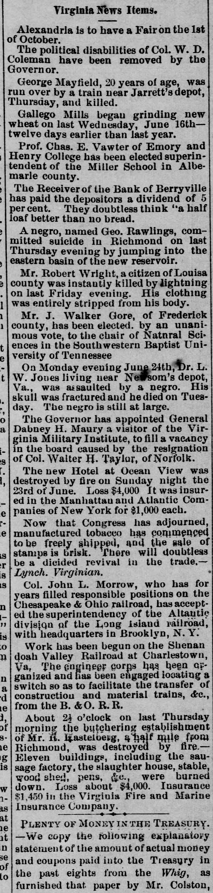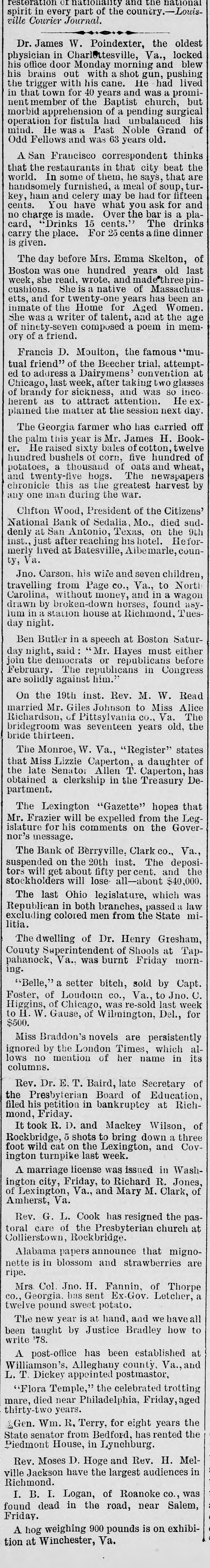 with nis lived cane. He had trigger that town for 40 years and was a promimember of the Baptist church, but apprehension of a pending surgical for fistula had unbalanced his He was a Past Noble Grand of Fellows and was 63 years old. San Francisco correspondent thinks the restaurants in that city beat the In some of them, he says, that are ndsomely furnished, a meal of soup, turham and celery may be had for fifteen You have what you ask for and charge is made. Over the bar is a pla"Drinks 15 cents." The drinks the place. For 25 cents a fine dinner The day before Mrs. Emma Skelton, of was one hundred years old last she read, wrote, and made'three pinShe is a native of Massachusand for twenty-one years has been an of the Home for Aged Women. was a writer of talent, and at the age ninety-seven composed a poem in memfriend. of a Francis D. Moulton, the famous "mufriend" of the Beecher trial, attemptto address a Dairymens' convention at last week, after taking two glasses brandy for sickness, and was SO inco. as to attract attention. He exthe matter at the session next day. The Georgia farmer who has carried off palm this year is Mr. James H. BookHe raised sixty bales of cotton, twelve bushels of corn, five hundred of tatoes, a thousand of oats and wheat, twenty-five hogs. The newspapers ronicle this as the greatest harvest by one man during the war. Clifton Wood, President of the Citizens' Bank of Sedalia, Mo., died sudat San Antonio, Texas, on the 9th just after reaching his hotel. Heforlived at Batesville, Albemarle, counVa. Carson, his wife and seven children, velling from Page co., Va., to North rolina, without money, and in a wagon by broken-down horses, found asyin a station house at Richmond, Tuesnight. Butler in a speech at Boston Saturnight, said Mr. Hayes must either the democrats or republicans before bruary. The republicans in Congress solidly against him." the 19th inst. Rev. M. W. Read Mr. Giles Johnson to Miss Alice chardson, of Pittsylvania CO., Va. The degroom was seventeen years old, the thirteen. The Monroe, W. Va., "Register" states Miss Lizzie Caperton, a daughter of late Senato: Allen T. Caperton, has a clerkship in the Treasury DeThe Lexington "Gazette" hopes that Frazier will be expelled from the Legfor his comments on the Govermessage. The Bank of Berryville, Clark CO., Va., spended on the 20th inst. The deposiwill get about fifty per cent. and the ckholders will lose- all-abont $40,000. The last Ohio legislature, which was publican in both branches, passed a law cluding colored men from the State miThe dwelling of Dr. Henry Gresham, Superintendent of Shools at Taphanock, Va., was burnt Friday morn"Belle," a setter bitch, sold by Capt. of Loudoun co., Va., to Jno. C. ggins, of Chicago, was re-sold last week W. Gause, of Wilmington, Del., for Braddon's novels are persistently by the London Times, which alno mention of her name in its Dr. E. T. Baird, late Secretary of Presbyterian Board of Education, his petition in bankruptcy at RichFriday. took R. D. and Mackey Wilson, of ckbridge, 5 shots to bring down a three wild cat on the Lexington, and Covturnpike last week. marriage license was issued in Washcity, Friday, to Richard R. Jones, Lexington, Va., and Mary M. Clark, of nherst, Va. G. L. Cook has resigned the pascare of the Presbyterian church at lierstown, Rockbridge. Alabama papers announce that mignois in blossom and strawberries are Col. Jno. H. Fannin, of Thorpe Georgia. bas sent Ex-Gov. Letcher, a pound sweet potato. The new year is at hand, and we have all taught by Justice Bradley how to 78. post-office has been established at lliamson's, Alleghany county, Va., and Dickey appointed postmastor, Flora Temple," the celebrated trotting died near Philadelphia, Friday, aged years. Wm. R. Terry, for eight years the te senator from Bedford, has rented the