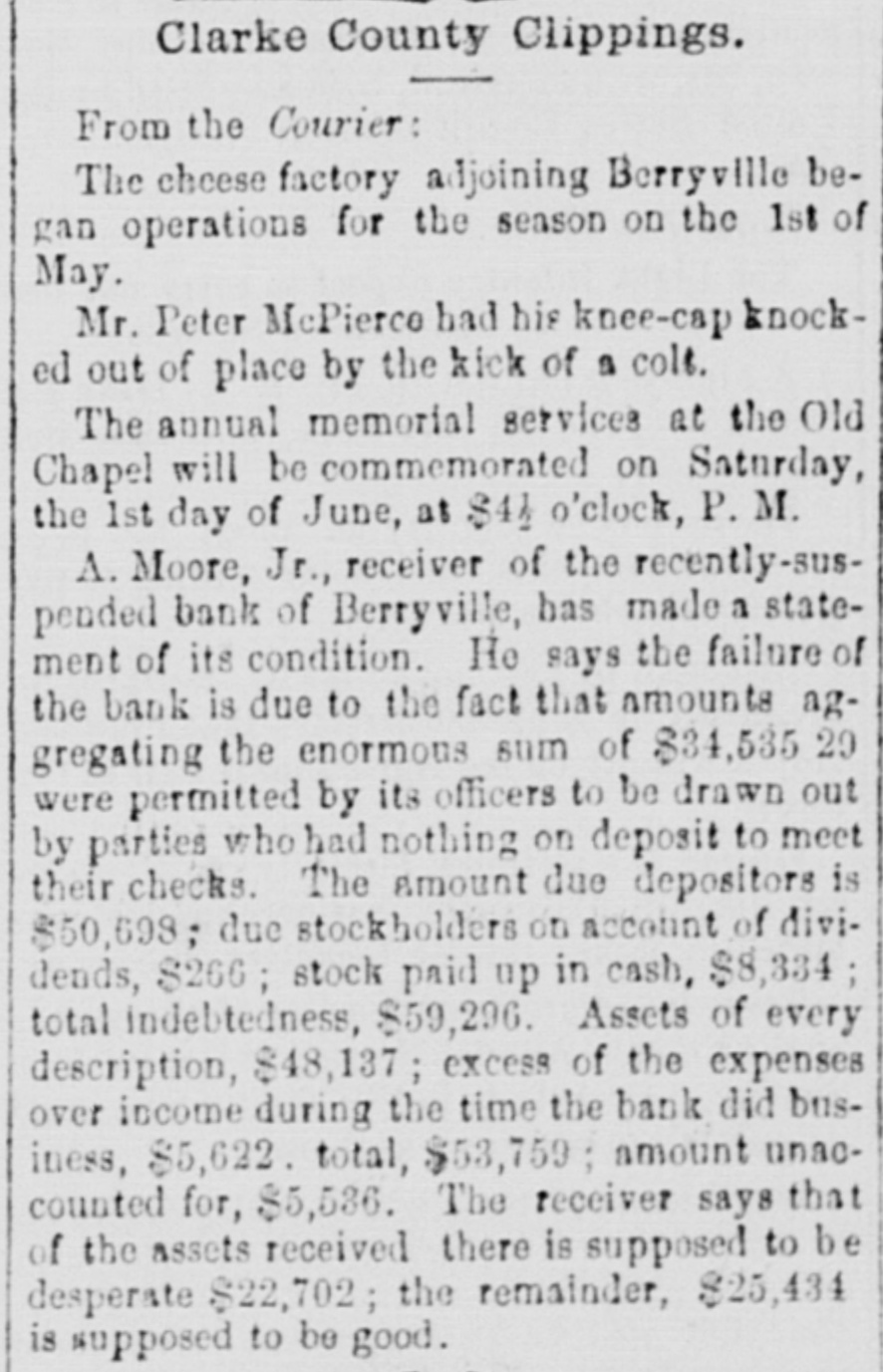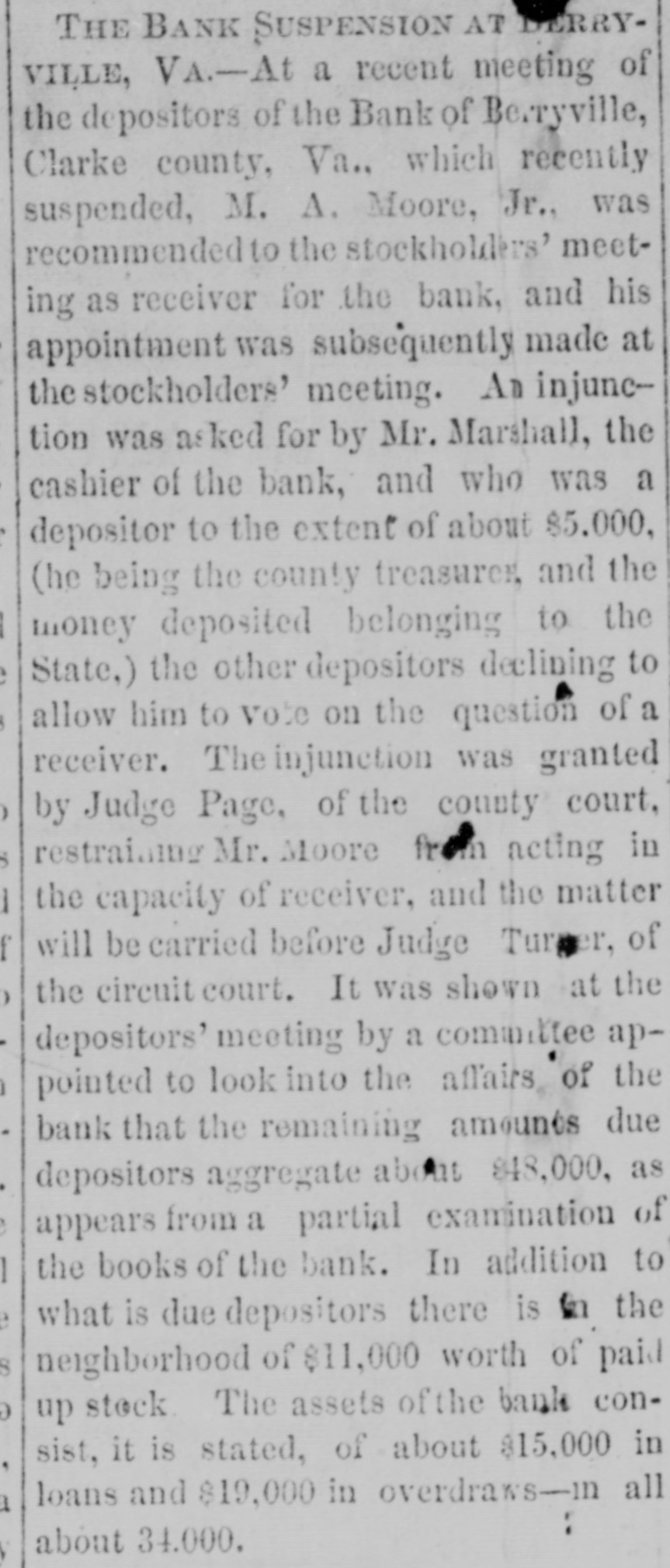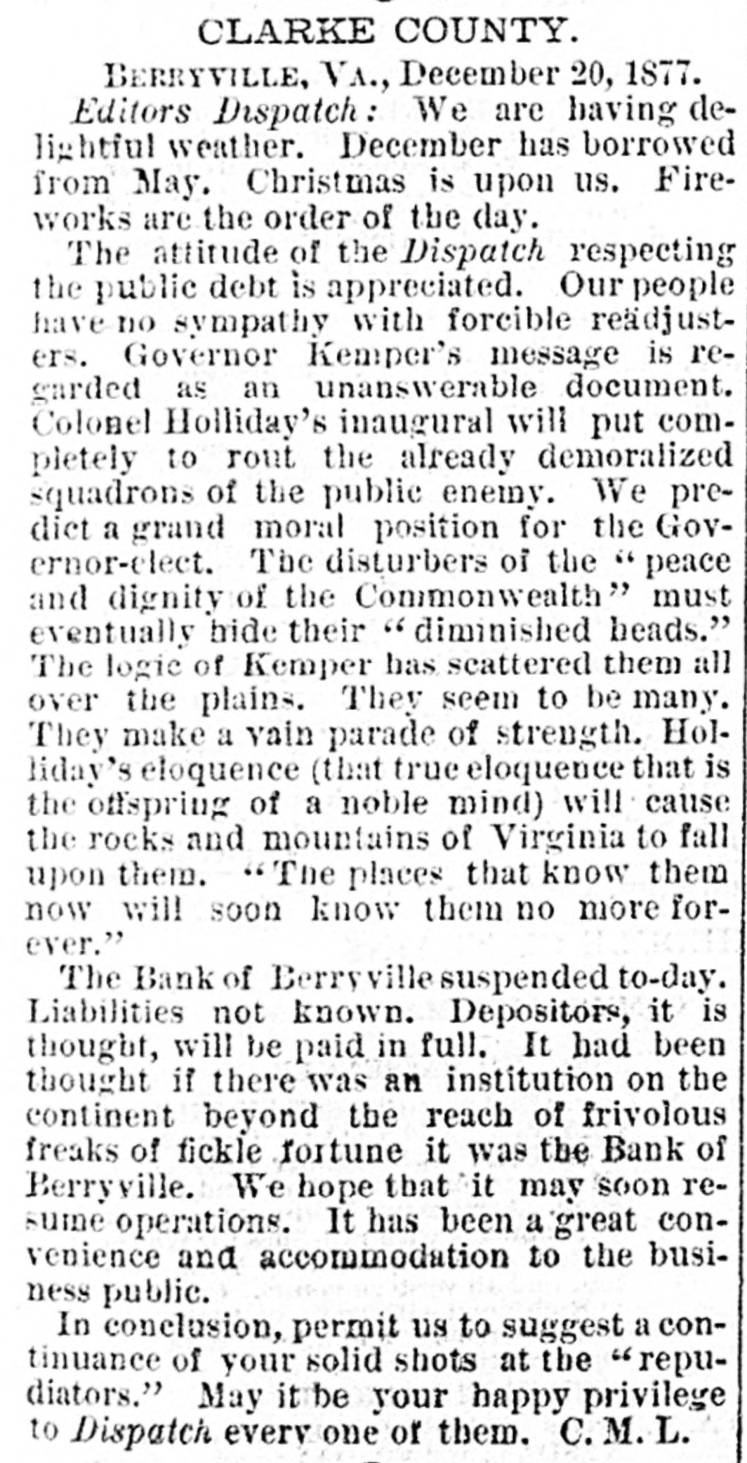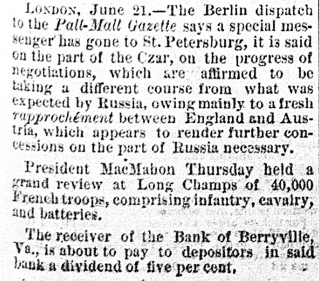 with nis lived cane. He had trigger that town for 40 years and was a promimember of the Baptist church, but apprehension of a pending surgical for fistula had unbalanced his He was a Past Noble Grand of Fellows and was 63 years old. San Francisco correspondent thinks the restaurants in that city beat the In some of them, he says, that are ndsomely furnished, a meal of soup, turham and celery may be had for fifteen You have what you ask for and charge is made. Over the bar is a pla"Drinks 15 cents." The drinks the place. For 25 cents a fine dinner The day before Mrs. Emma Skelton, of was one hundred years old last she read, wrote, and made'three pinShe is a native of Massachusand for twenty-one years has been an of the Home for Aged Women. was a writer of talent, and at the age ninety-seven composed a poem in memfriend. of a Francis D. Moulton, the famous "mufriend" of the Beecher trial, attemptto address a Dairymens' convention at last week, after taking two glasses brandy for sickness, and was SO inco. as to attract attention. He exthe matter at the session next day. The Georgia farmer who has carried off palm this year is Mr. James H. BookHe raised sixty bales of cotton, twelve bushels of corn, five hundred of tatoes, a thousand of oats and wheat, twenty-five hogs. The newspapers ronicle this as the greatest harvest by one man during the war. Clifton Wood, President of the Citizens' Bank of Sedalia, Mo., died sudat San Antonio, Texas, on the 9th just after reaching his hotel. Heforlived at Batesville, Albemarle, counVa. Carson, his wife and seven children, velling from Page co., Va., to North rolina, without money, and in a wagon by broken-down horses, found asyin a station house at Richmond, Tuesnight. Butler in a speech at Boston Saturnight, said Mr. Hayes must either the democrats or republicans before bruary. The republicans in Congress solidly against him." the 19th inst. Rev. M. W. Read Mr. Giles Johnson to Miss Alice chardson, of Pittsylvania CO., Va. The degroom was seventeen years old, the thirteen. The Monroe, W. Va., "Register" states Miss Lizzie Caperton, a daughter of late Senato: Allen T. Caperton, has a clerkship in the Treasury DeThe Lexington "Gazette" hopes that Frazier will be expelled from the Legfor his comments on the Govermessage. The Bank of Berryville, Clark CO., Va., spended on the 20th inst. The deposiwill get about fifty per cent. and the ckholders will lose- all-abont $40,000. The last Ohio legislature, which was publican in both branches, passed a law cluding colored men from the State miThe dwelling of Dr. Henry Gresham, Superintendent of Shools at Taphanock, Va., was burnt Friday morn"Belle," a setter bitch, sold by Capt. of Loudoun co., Va., to Jno. C. ggins, of Chicago, was re-sold last week W. Gause, of Wilmington, Del., for Braddon's novels are persistently by the London Times, which alno mention of her name in its Dr. E. T. Baird, late Secretary of Presbyterian Board of Education, his petition in bankruptcy at RichFriday. took R. D. and Mackey Wilson, of ckbridge, 5 shots to bring down a three wild cat on the Lexington, and Covturnpike last week. marriage license was issued in Washcity, Friday, to Richard R. Jones, Lexington, Va., and Mary M. Clark, of nherst, Va. G. L. Cook has resigned the pascare of the Presbyterian church at lierstown, Rockbridge. Alabama papers announce that mignois in blossom and strawberries are Col. Jno. H. Fannin, of Thorpe Georgia. bas sent Ex-Gov. Letcher, a pound sweet potato. The new year is at hand, and we have all taught by Justice Bradley how to 78. post-office has been established at lliamson's, Alleghany county, Va., and Dickey appointed postmastor, Flora Temple," the celebrated trotting died near Philadelphia, Friday, aged years. Wm. R. Terry, for eight years the te senator from Bedford, has rented the