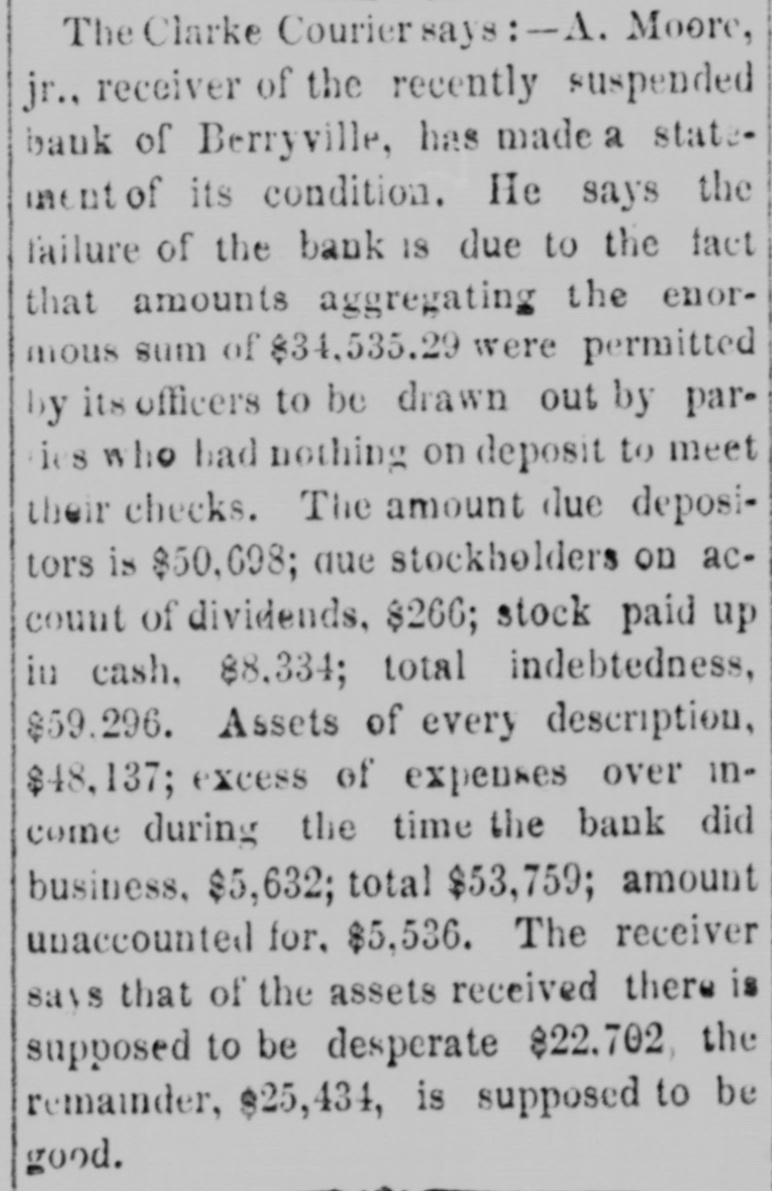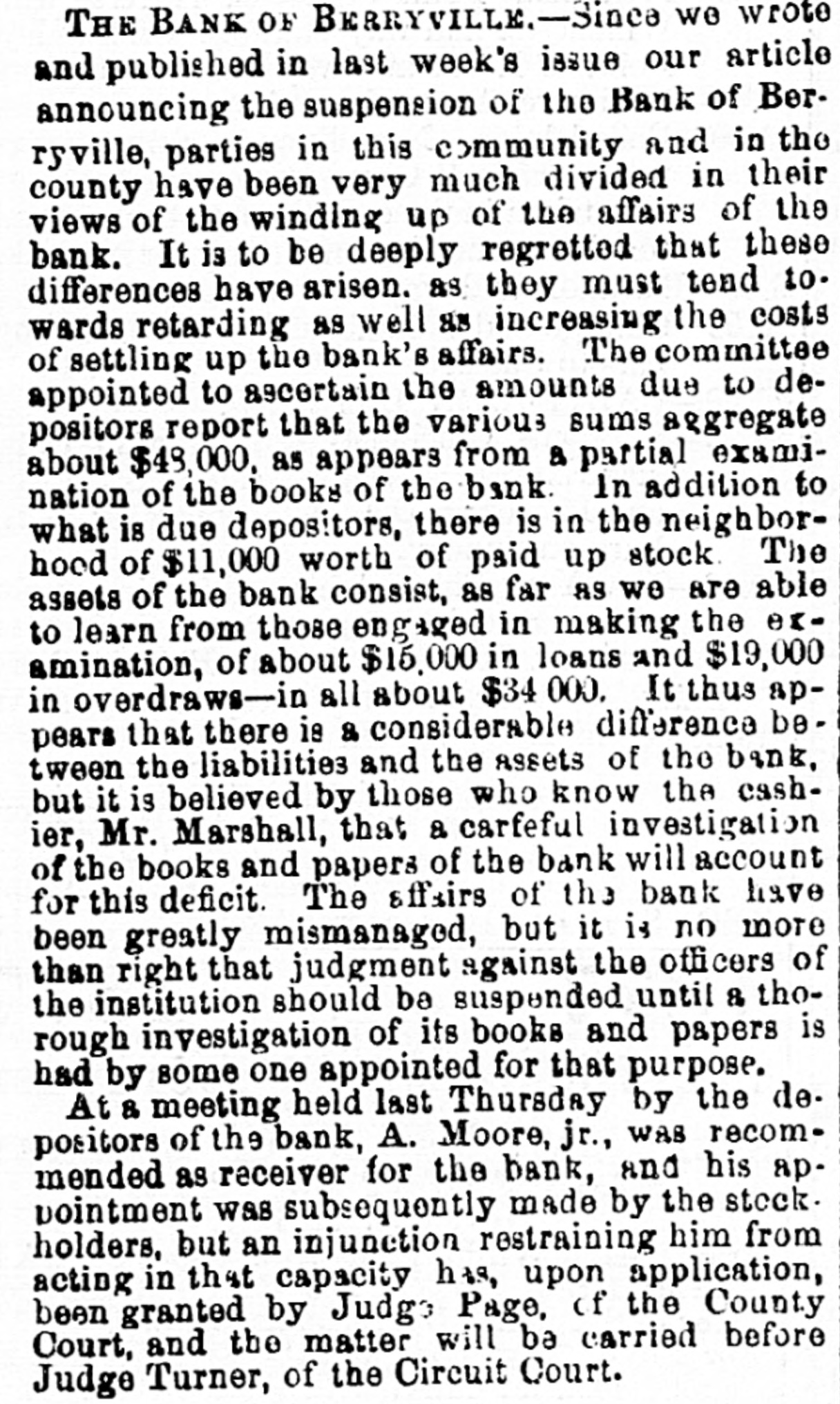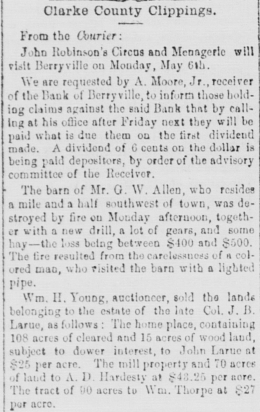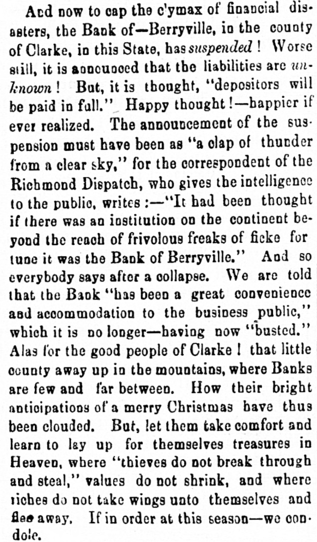with nis lived cane. He had trigger that town for 40 years and was a promimember of the Baptist church, but apprehension of a pending surgical for fistula had unbalanced his He was a Past Noble Grand of Fellows and was 63 years old. San Francisco correspondent thinks the restaurants in that city beat the In some of them, he says, that are ndsomely furnished, a meal of soup, turham and celery may be had for fifteen You have what you ask for and charge is made. Over the bar is a pla"Drinks 15 cents." The drinks the place. For 25 cents a fine dinner The day before Mrs. Emma Skelton, of was one hundred years old last she read, wrote, and made'three pinShe is a native of Massachusand for twenty-one years has been an of the Home for Aged Women. was a writer of talent, and at the age ninety-seven composed a poem in memfriend. of a Francis D. Moulton, the famous "mufriend" of the Beecher trial, attemptto address a Dairymens' convention at last week, after taking two glasses brandy for sickness, and was SO inco. as to attract attention. He exthe matter at the session next day. The Georgia farmer who has carried off palm this year is Mr. James H. BookHe raised sixty bales of cotton, twelve bushels of corn, five hundred of tatoes, a thousand of oats and wheat, twenty-five hogs. The newspapers ronicle this as the greatest harvest by one man during the war. Clifton Wood, President of the Citizens' Bank of Sedalia, Mo., died sudat San Antonio, Texas, on the 9th just after reaching his hotel. Heforlived at Batesville, Albemarle, counVa. Carson, his wife and seven children, velling from Page co., Va., to North rolina, without money, and in a wagon by broken-down horses, found asyin a station house at Richmond, Tuesnight. Butler in a speech at Boston Saturnight, said Mr. Hayes must either the democrats or republicans before bruary. The republicans in Congress solidly against him." the 19th inst. Rev. M. W. Read Mr. Giles Johnson to Miss Alice chardson, of Pittsylvania CO., Va. The degroom was seventeen years old, the thirteen. The Monroe, W. Va., "Register" states Miss Lizzie Caperton, a daughter of late Senato: Allen T. Caperton, has a clerkship in the Treasury DeThe Lexington "Gazette" hopes that Frazier will be expelled from the Legfor his comments on the Govermessage. The Bank of Berryville, Clark CO., Va., spended on the 20th inst. The deposiwill get about fifty per cent. and the ckholders will lose- all-abont $40,000. The last Ohio legislature, which was publican in both branches, passed a law cluding colored men from the State miThe dwelling of Dr. Henry Gresham, Superintendent of Shools at Taphanock, Va., was burnt Friday morn"Belle," a setter bitch, sold by Capt. of Loudoun co., Va., to Jno. C. ggins, of Chicago, was re-sold last week W. Gause, of Wilmington, Del., for Braddon's novels are persistently by the London Times, which alno mention of her name in its Dr. E. T. Baird, late Secretary of Presbyterian Board of Education, his petition in bankruptcy at RichFriday. took R. D. and Mackey Wilson, of ckbridge, 5 shots to bring down a three wild cat on the Lexington, and Covturnpike last week. marriage license was issued in Washcity, Friday, to Richard R. Jones, Lexington, Va., and Mary M. Clark, of nherst, Va. G. L. Cook has resigned the pascare of the Presbyterian church at lierstown, Rockbridge. Alabama papers announce that mignois in blossom and strawberries are Col. Jno. H. Fannin, of Thorpe Georgia. bas sent Ex-Gov. Letcher, a pound sweet potato. The new year is at hand, and we have all taught by Justice Bradley how to 78. post-office has been established at lliamson's, Alleghany county, Va., and Dickey appointed postmastor, Flora Temple," the celebrated trotting died near Philadelphia, Friday, aged years. Wm. R. Terry, for eight years the te senator from Bedford, has rented the