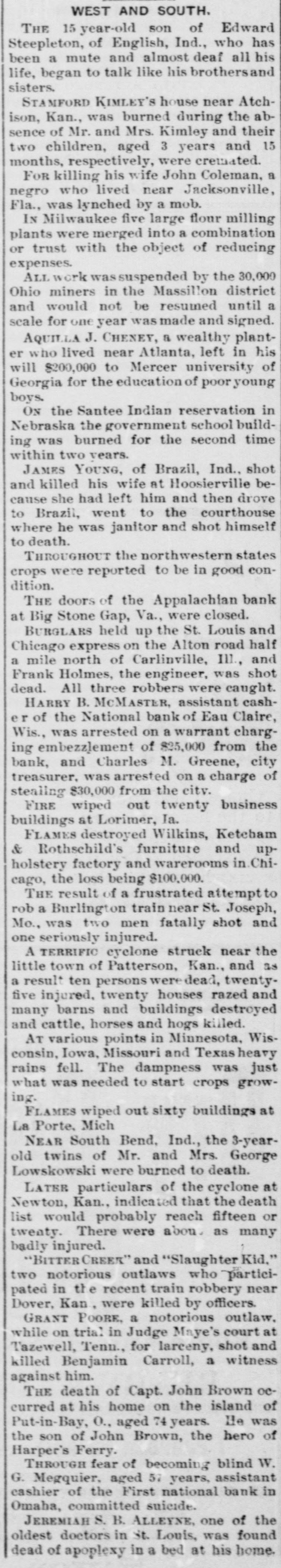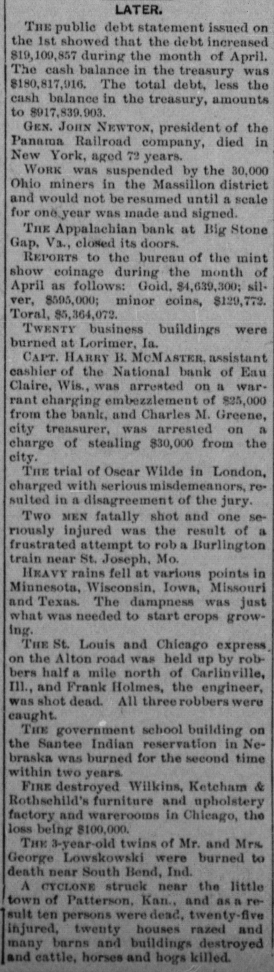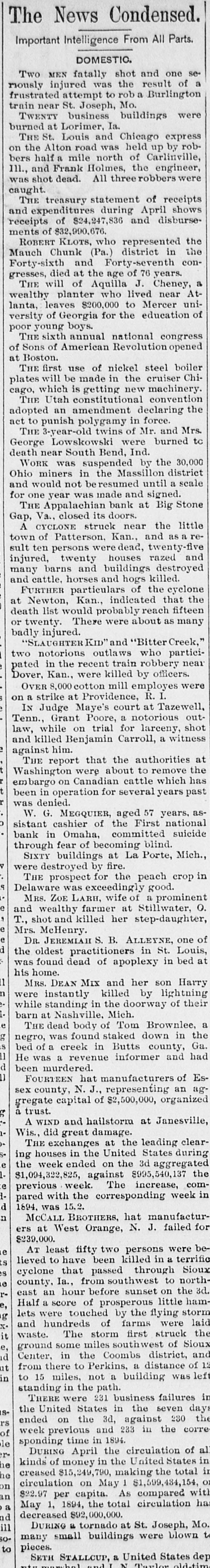 The News Condensed. Important Intelligence From All Parts. DOMESTIC. Two MEN fatally shot and result one of se- a injured was the riously frustrated attempt to rob Mo. a Burlington train TWENTY near St. business Joseph, buildings were burned at Lorimer, Ia. St. Louis and Chicago express by robTHE the Alton road was held Carlinville, up on half mile north of bers and Frank Holmes, the engineer, was shot Ill., dead. All three robbers wer caught. treasury statement of receipts shows THE expenditures during April disburse and receipts of $24,247,836 and ments of $32,990,676. KLOTS, who represented the the ROBERT Chunk (Pa.) district in conForty-sixth Mauch and Forty-seventh died at the age of 76 years. gresses, THE will of Aquilla J. Cheney, At- a planter who lived near uniwealthy leaves $200,000 to Mercer of lanta, versity of Georgia for the education poor young sixth boys. annual national congress at Boston. of THE Sons of American Revolution opened first use of nickel steel boiler ChiTHE will be made in the cruiser plates which is getting new machinery. convention cago, Utah constitutional the THE an amendment declaring adopted act to punish polygamy in force. and 3-year-old twins of Mr. burned Mrs. tc THE Lowskowski were death George near South Bend, Ind. was suspended by the district 30,000 WORK miners in the Massillon a scale and Ohio would not be resumed until for year was made and signed. THE one Appalachian bank at Big Stone Gap, Va., closed its doors. little CYCLONE struck near the A of Patterson, Kan., and twenty-five as a retown ten persons were dead, and sult twenty houses razed destroyed injured, barns and buildings killed. and many cattle, horses and hogs FURTHER particulars of the that cyclone the Newton, Kan., indicated fifteen at list would probably reach death or twenty. There were about as many badly "SLAUGHTER injured. KID" and "Bitter Creek," notorions outlaws who partici- near two in the recent train robbery officers. Dover, pated Kan., were killed by OVER 8,000 cotton mill employes I. were strike at Providence, R. on IN a Judge Maye's court at Tazewell, outGrant Poore, a notorious shot Tenn., while on trial for larceny, witness law, and killed Benjamin Carroll, a against him. report that the authorities the at THE were about to remove which has Washington on Canadian cattle embargo been in operation for several years past denied. was W. G. MEGQUIER, aged 57 years. national as sistant cashier of the First suicide bank in Omaha, committed blind. through fear of becoming v SIXTY buildings at La Porte, Mich., were destroyed by fire. in S THE prospect for the peach crop Delaware was exceedingly good. e MRS. ZOE LARH, wife of a prominent O. wealthy farmer at Stillwater, e and T., shot and killed her step-daughter, Mrs. McHenry. d DR. JEREMIAH S. B. ALLEYNE, Louis, one of oldest practitioners in St. bed at was the found dead of apoplexy in home. 11 n his MRS. DEAN MIX and her son lightning Harry instantly killed by of their were while standing in the doorway barn at Nashville. Mich. e g THE dead body of Tom Brownlee, in the a was found staked down Ga. 11 negro, of creek in Butts county, had d He bed was a a revenue informer and been murdered. 1) FOURTEEN hat manufacturers of Escounty, N. J., representing organized an aga sex gregate capital of $2,500,000, g trust. A WIND and hailstorm at Janesville, 1. Wis., did great damage. STHE exchanges at the leading clearin the United States during e ing houses week ended on the 3d aggregated the 1e $1,094,322,825, the against $995,540,137 com1previous week. The increase, week in pared with the corresponding d n 1694, was 15.2. BROTHERS, hat manufactur- for ers McCALL at West Orange, N. J. failed e $239,000. AT least fifty two persons were terrific bets lieved to have been killed in a Sioux s that passed through northe cyclone Ia., from southwest to the 3d. county. an hour before sunset little on hame, east score of prosperous storm g lets Half were a touched by the flying laid x. hundreds of farms were the it and The storm first struck e, waste. some miles southwest of Sioux and d ground in the Coombs district, of ut Center, there to Perkins, a distance left in from to 15 miles, not a building was standing THERE were in the 231 path. business failures in sUnited States in the seven day the rs ended the on the 3d, against 230 corre of week previous and 233 in the le sponding time in 1894. r DURING April the circulation of in al he kinds of money in the United States total in he creased $15,249,790, making the on circulation on May 1 $1,509,434,154. with an per capita. As compared ha a $22.97 May 1, 1894, the total circulation ad ill decreased DURING a $92,000,000. tornado at St. Joseph, Mo. to somany small buildings were blown to pieces. STALLCUP, a United States dep SETH N