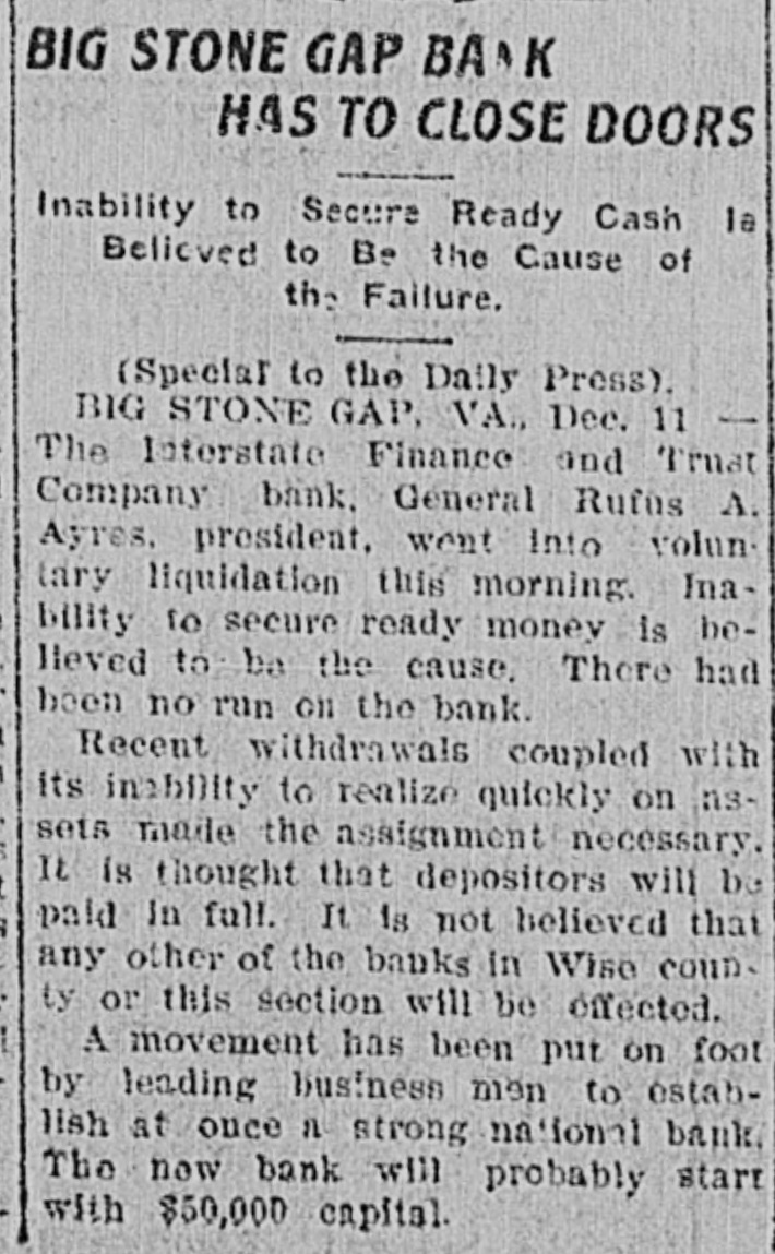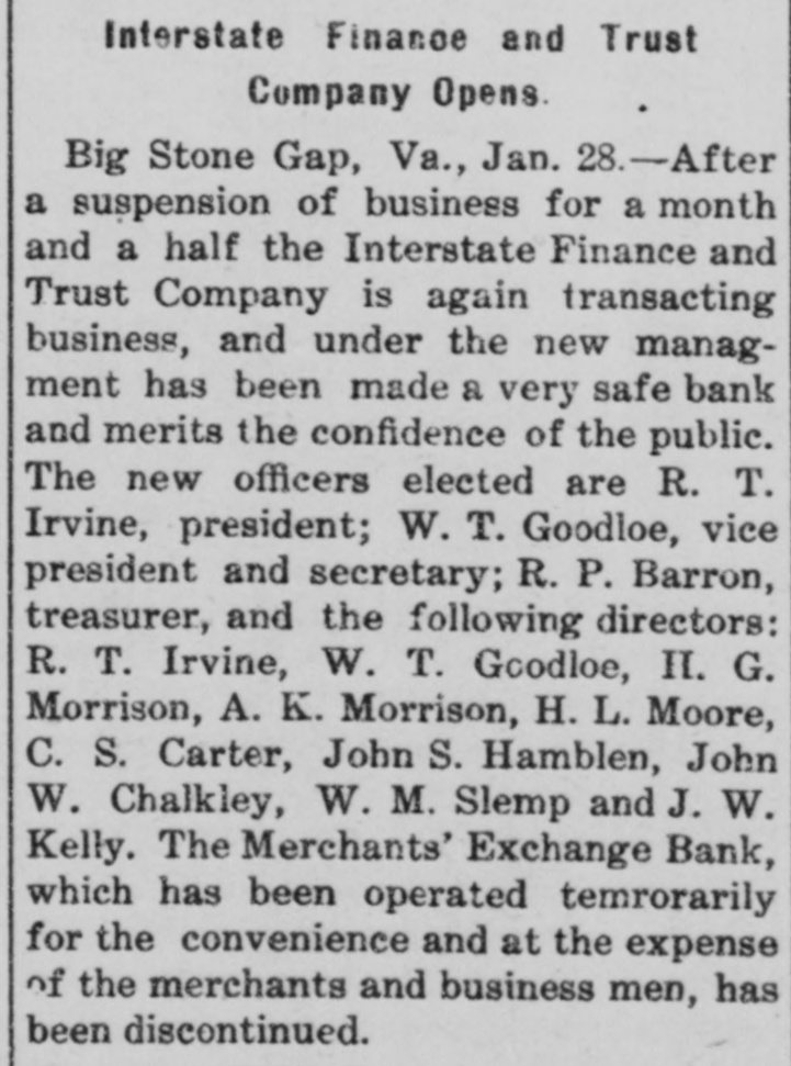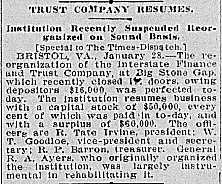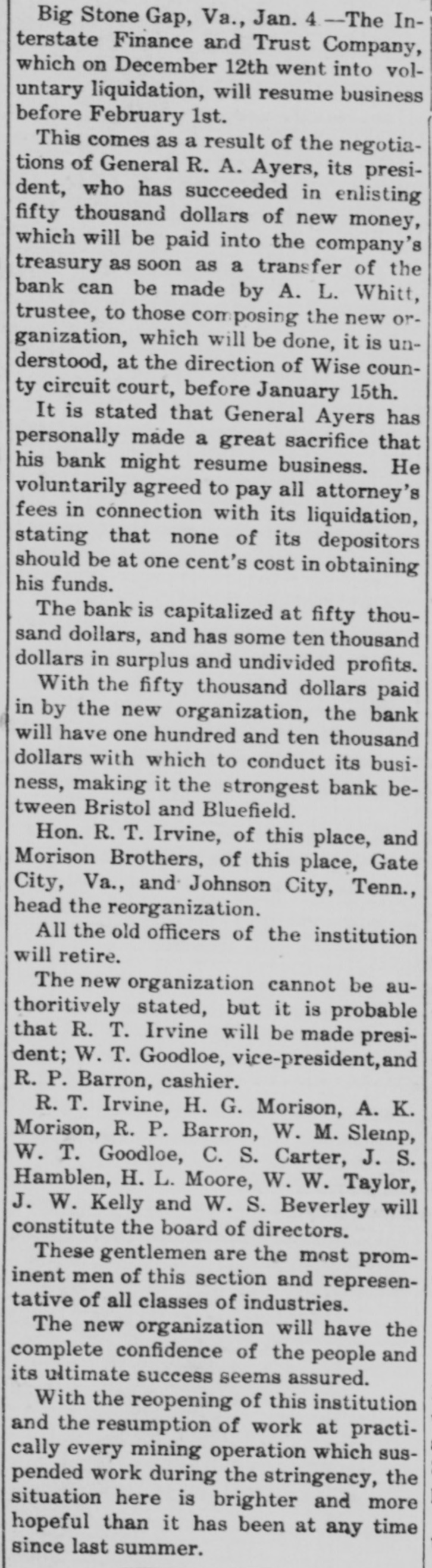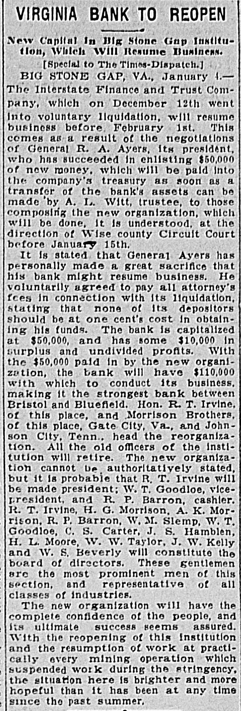 VIRGINIA BANK TO REOPEN New Capital In Big Stone Gnp Institution, Which will Resume Business. [Special to The Times-Dispatch.] BIG STONE GAP, VA., January 1.The Interstate Finance and Trust Company, which on December 12th went into voluntary liquidation, will resume business before. February 1st. This comes as a result of the negotiations of General R. A. Ayers, its president, who has succeeded in enlisting $50,000 of new money. which will be paid into the company's treasury as soon as a transfer of the bank's assets can be made by A. L. Witt, trustee, to those composing the new organization, which will be done, It is understood. at the direction of Wise county Circuit Court before January 15th. It is stated that General Ayers has personally made a great sacrifice that his bank might resume business. He voluntarily agreed to pay all attorney's fees in connection with its liquidation, stating that none of its depositors should be at one cent's cost in obtaining his funds. The bank is capitalized at $50,000, and has some $10,000 in surplus and undivided profits. With the $50,000 paid in by the new organization, the bank will have $110,000 with which to conduct its business. making it the strongest bank between Bristol and Bluefield. Hon. R. T. Irvine, of this place, and Morrison Brothers, of this place, Gate City, Va., and Johnson City, Tenn., head the reorganization. All the old officers of the institution will retire. The new organization cannot De authoritatively stated, but it is probable that R. T. Irvine will be made president; W. T. Goodloe, vicepresident, and R. P. Barron, cashier. R. T. Irvine, H. G. Morrison, A. K. Morrison, R. P. Barron, W. M. Slemp. W. T. Goodloe, C. S. Carter, J. S. Hamblen, H. L. Moore, W. W. Taylor, J. W. Kelly and W. S. Beverly will constitute the board of directors. These gentlemen are the most prominent men of this section, and representative of all classes of industries. The new organization will have the complete confidence of the people, and its ultimate success seems assured. With the reopening of this institution and the resumption of work at practically every mining operation which suspended work during the stringency, the situation here is brighter and more hopeful than it has been at any time since the past summer.