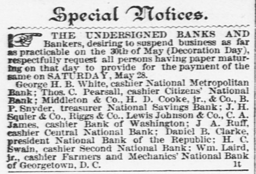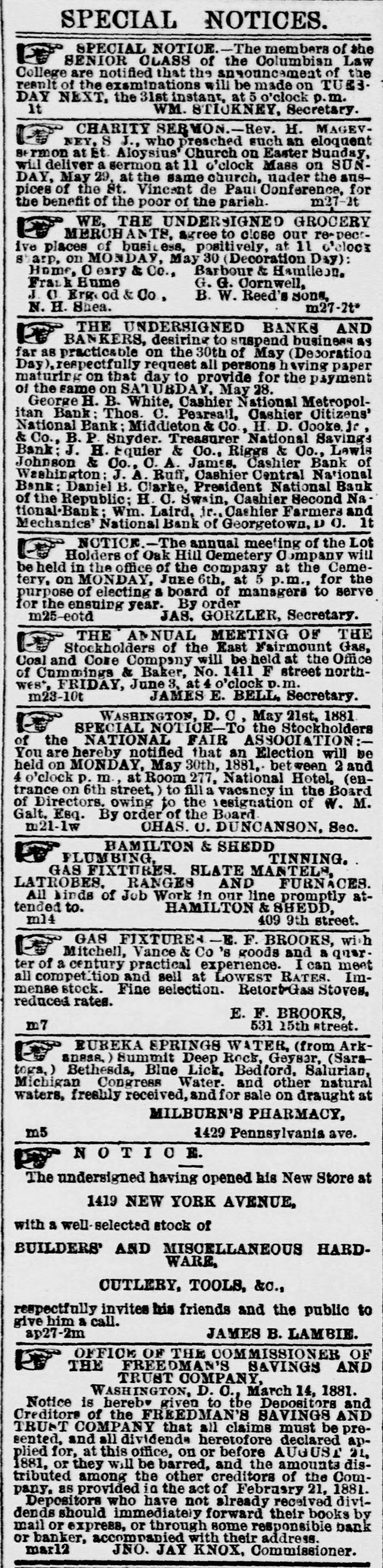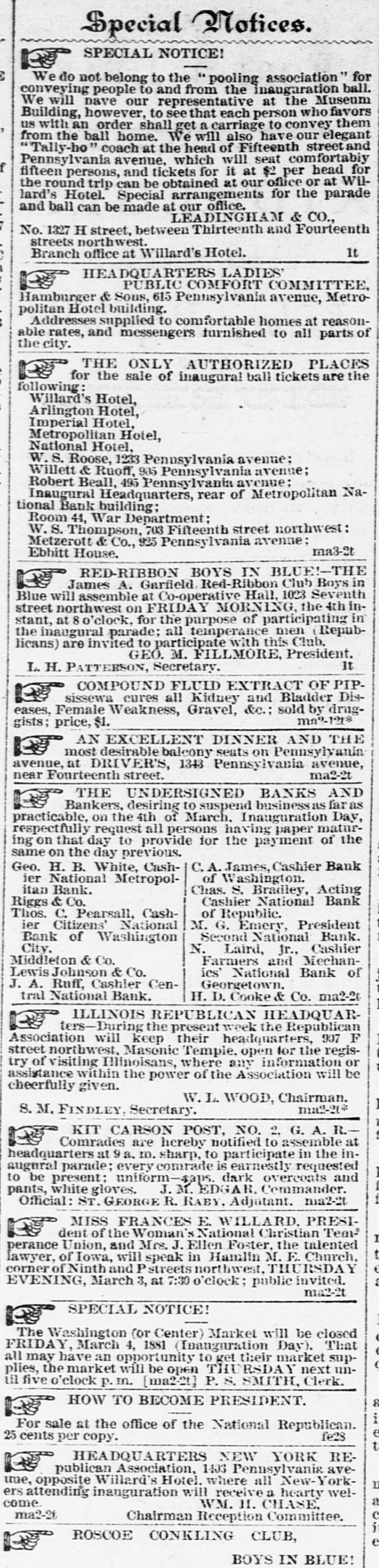 Special SPECIAL NOTICE! We do not belong to the "pooling association" for conveying people to and from the inaugaration ball. We will nave our representative at the Museum Building, however, to see that each person who favors us with an order shall get a carriage to convey them from the ball home. We will also have our elegant Tally-ho coach at the head of Fifteenth street and Pennsylvania avenue, which will seat comfortabiy fifteen persons, and tickets for it at $2 per head for the round trip can be obtained at our office or at Willard's Hotel. Special arrangements for the parade and ball can be made at our office. LEADINGHAM & CO., No. 1327 H street, between Thirteenth and Fourteenth streets northwest. It Branch office at Willard's Hotel. HEADQUARTERS LADIES' PUBLIC COMFORT COMMITTEE, Hamburger & Sons, 615 Pennsylvania avenue, Metropolitan Hotel building. Addresses supplied to comfortable homes at reasonable rates, and messengers furnished to all parts of the city. THE ONLY AUTHORIZED PLACES for the sale of inaugural ball tickets are the following: Willard's Hotel, Arlington Hotel, Imperial Hotel, Metropolitan Hotel, National Hotel, W. S. Roose, 1233 Pennsylvania avenue: Willett & Ruoff, 905 Pennsylvania avenue; Robert Beall, 495 Pennsylvania avenue: Inaugural Headquarters, rear of Metropolitan National Bank building; Room 44, War Department: W.S. Thompson, 703 Fifteenth street northwest: Metzerott & Co., 925 Pennsylvania avenue: ma3-2t Ebhitt House, RED-RIBBON BOYS IN BLUE!-THE James A. Garfield Red-Ribbon Club Boys in Blue will assemble at Co-operative Hall, 1023 Seventh street northwest on FRIDAY MORNING, the 4th instant, at 8 o'clock, for the purpose of participating in the inaugural parade; all temperance men (Republicans) are invited to participate with this Club. GEO. M. FILLMORE, President. It L. H. PATTERSON, Secretary. COMPOUND FLUID EXTRACT OF PIPsissewa cures all Kidney and Bladder Diseases, Female Weakness, Gravel, &c.: sold by drugma2-191* gists; price, $1. AN EXCELLENNT DINNER AND THE most desirable balcony seats on Pennsylvania avenue, at DRIVER'S, 1343 Pennsylvania avenue, ma2-2t near Fourteenth street. THE UNDERSIGNED BANKS AND Bankers, desiring to suspend business as far as practicable, on the 4th of March, Inauguration Day, respectfully request all persons having paper maturing on that day to provide for the payment of the same on the day previous. C.A. James, Cashier Bank Geo. H. B. White, Cashof Washington. ier National Metropolitan Bank. Chas. S. Bradley, Acting Cashier National Bank Riggs & Co. of Republic. Thos. C. Pearsall, Cashier Citizens' National M. G. Emery, President Second National Bank. Bank of Washington City. N. Laird, Jr., Cashier Middleton & Co. Farmers and Mechanics' National Bank of Lewis Johnson & Co. J. A. Ruff, Cashier CenGeorgetown, H. D. Cooke & Co. ma2-20 tral National Bank. ILLINOIS REPUBLICAN HEADQUAR ters-During the present week the Republican Association will keep their headquarters, 907 F street northwest, Masonic Temple. open for the registry of visiting Illinoisans, where any information or assistance within the power of the Association will be cheerfully given. W. L. WOOD, Chairman. ma2-21* S. M. FINDLEY, Secretary. KIT CARSON POST, NO. 2. G. A. R.Comrades are hereby notified to assemble at headquarters at 9a. m. sharp, to participate in the inaugural parade; every comrade is earnestly requested to be present; uniform- dark overcoats and pants, white gloves. J.M. EDGAR Commander. Official: ST. GEORGE R. RABY. Adjutant. ma2-2t MISS FRANCES E. WILLARD. PRESIdent of the Woman's National Christian Temperance Union, and Mrs. J. Ellen Foster. the talented lawyer, of Iowa, will speak in Hamlin M. E. Church, corner of Ninth and Pstreets northwest, THU RSDAY EVENING, March 3, at 7:30 o'clock: public invited. ma2-2t SPECIAL NOTICE! The Washington (or Center) Market will be closed FRIDAY, March 4, 1881 (Inauguration Day). That all may have an opportunity to get their market supplies, the market will be open THU RSDAY next until five o'clock p.m. [ma2-21] P. S. SMITH, Clerk. HOW TO BECOME PRESIDENT. For sale at the office of the National Republican. fe28 25 cents per copy. t HEADQUARTERS NEW YORK REpublican Association, 1403 Pennsylvania avetue, opposite Willard's Hotel. where all New-York1 ers attending inauguration will receive a hearty wela come WM. 11. CHASE, ma2-21 e Chairman Reception Committee. j ROSCOE CONKLING CLUB, e BOYS IN BLUE!