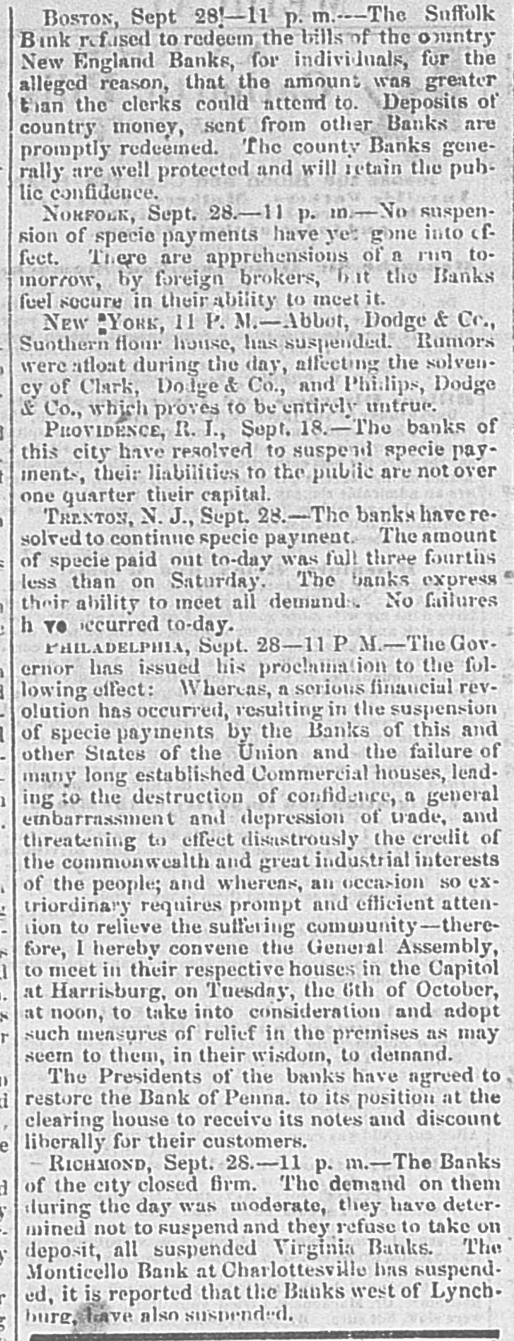 BOSTON, Sept 28'-11 P. m.--The Suffolk Bink refused to redeem the bills of the country New England Banks, for individuals, for the alleged reason, that the amount was greater than the clerks could attend to. Deposits of country money, sent from other Banks are promptly redeemed. The county Banks generally are well protected and will retain the public confidence. NORFORK, Sept. 28.-11 p. m-No suspension of specie payments have ye: gone into offeet. There are apprehensions of a run tomorrow, by foreign brokers, but the Banks feel secure in their ability to meet it. New "York, 11 P. M.-Abbot, Dodge & Cr., Suothern flour house, has suspended. Rumors were atloat during the day, affecting the solvency of Clark, Dodge & Co., and Philips, Dodge & Co., which proves to be entirely untrue. PROVIDENCE, R.I., Sept. 18.-The banks of this city have resolved to suspend specie payments, their liabilities to the public are not over one quarter their capital. TRENTON, N.J., Sept. 28.-The banks have resolved to continue specie payment. The amount of specie paid out to-day was full three fourths less than on Saturday. The banks express their ability to meet all demands. No failures h TO occurred to-day. PHILADELPHIA, Sept. 28-11 P M.-The Governor has issued his proclamation to the following effect: Whereas, a serious financial revolution has occurred, resulting in the suspension of specie payments by the Banks of this and other States of the Union and the failure of many long established Commercial houses, lending to the destruction of confidence, a general embarrassment and depression of trade, and threatening to effect disastrously the credit of the commonwealth and great industrial interests of the people; and whereas, an occasion so extriordinary requires prompt and efficient attention to relieve the suffering community-therefore, I hereby convene the General Assembly, to meet in their respective houses in the Capitol at Harrisburg, on Tuesday, the 6th of October, at noon, to take into consideration and adopt such measures of relief in the premises as may seem to them, in their wisdom, to demand. The Presidents of the banks have agreed to restore the Bank of Penna. to its position at the clearing house to receive its notes and discount liberally for their customers. - RICHMOND, Sept. 28.-11 p. m.-The Banks of the city closed firm. The demand on them during the day was moderate, they have determined not to suspend and they refuse to take on deposit, all suspended Virginia Banks. The Monticello Bank at Charlottesville has suspended, it is reported that the Banks west of Lynchhure, have also suspended,