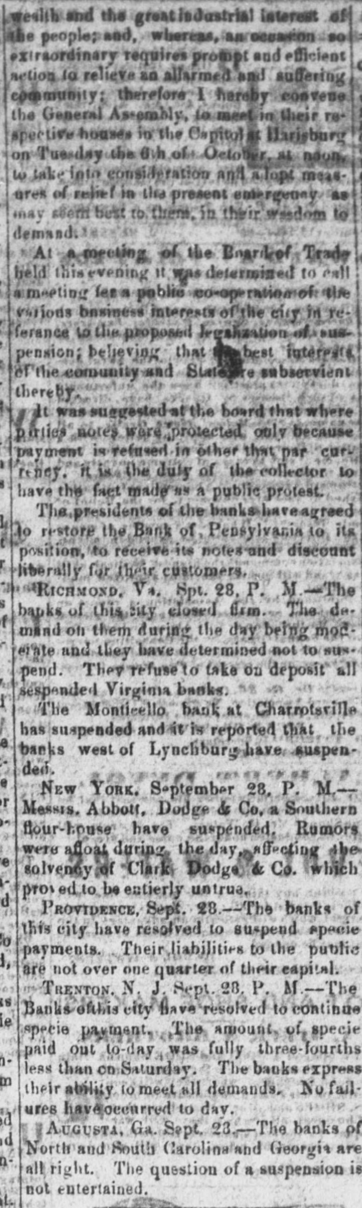 wealth and the greatindustrial interest of the peoples and, whereas, an occasion so extraordinary requires prompt and efficient action to relieve an allarmed and suffering community; therefore I hereby convene the General Assembly, to meet in their respective houses in the Capitol at Harisburg on Tuesday the Bih of October, at noon, w take into consideration and sclept measares of relief in the present emergency. as may seem best to them, in their wesdom to demand. At a meeting. of the Board of Trade held this evening It was determined to call a meeting fee a poblic co-ope rationeh the various basiness interests of the city in referance to the proposed legalization of suspension; beheving that best interests of the comunity and Stategere subservient thereby dt was suggested at the board that where parties notes were protected only because payment is refused in other that par curreney. n is the duty of the collector to have the fact made us a public protest. The presidents of the banks-haveagreed to restore the Bank of, Pensylvania to its position, to receive its notes and discount liberally for their customers, RICHMOND, V4, Spt. 28, P. M -The banks of this city closed firm The demand on them during the day being mod. erate and they have determined not to sus pend. They refuse to take on deposit all sespended Virgima banks. The Monticello bank at Charrotsville has suspended and it is reported that the banks west of Lynchburg have suspended. New York. September 28, P. M-Messrs. Abbott, Dodge & Co. a Southern flour-house have suspended. Rumors were afloat during the day affecting she solvency of Clark Dodge, & Co. which prov ed to be entierly untrua, d PROVIDENCE, Sept. 28.-The banks of this city have resolved to suspend specie payments. Their liabilities to the public are not over one quarter of their capital. TRENTON. N. J. Sept 28. P. M.-The IS Banks othis city have resolved to continue ie specie payment. The amount. of specie paid out to-day was fully three-fourths less than on Saturday. The banks express an their ability to meet all demands, No failures have occurred to day. Augusta, Ga. Sept. 23.-The banks of North and South Carolinaland Georgia are all right. The question of a suspension is not entertained.