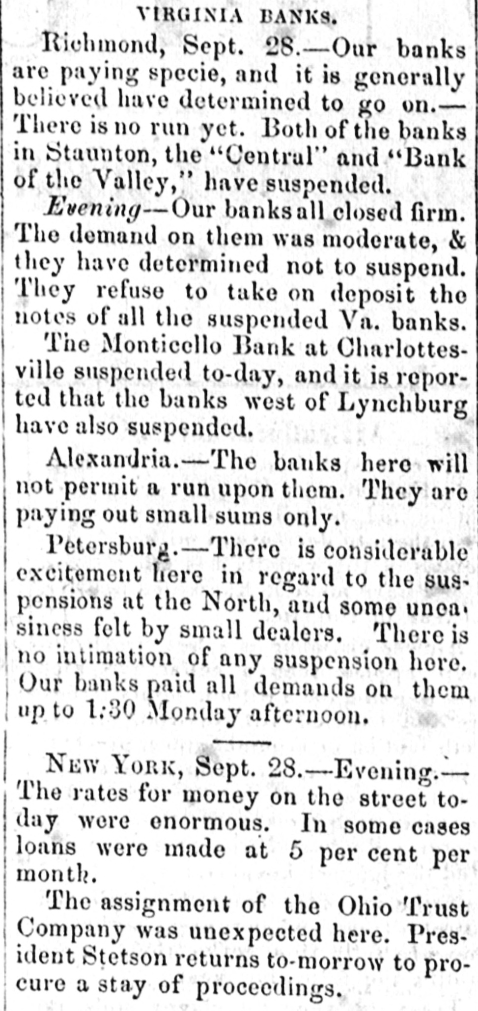 VIRGINIA BANKS. Richmond, Sept. 28.-Our banks are paying specie, and it is generally believed have determined to go on.There is no run yet. Both of the banks in Staunton, the "Central" and "Bank of the Valley," have suspended. Evening-Our banksall closed firm. The demand on them was moderate, & they have determined not to suspend. They refuse to take on deposit the notes of all the suspended Va. banks. The Monticello Bank at Charlottesville suspended to-day, and it is reported that the banks west of Lynchburg have also suspended. Alexandria.-The banks here will not permit a run upon them. They are paying out small sums only. Petersburg.-There is considerable excitement here in regard to the suspensions at the North, and some unea. siness felt by small dealers. There is no intimation of any suspension here. Our banks paid all demands on them up to 1:30 Monday afternoon. NEW YORK, Sept. 28.-Evening.The rates for money on the street today were enormous. In some cases loans were made at 5 per cent per month. The assignment of the Ohio Trust Company was unexpected here. President Stetson returns to-morrow to procure a stay of proceedings.