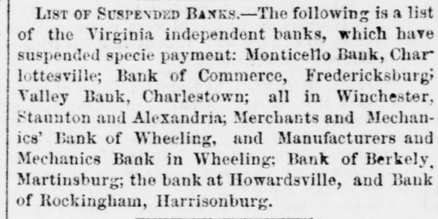 LIST OF SUSPENDED BANKS.-The following is a list of the Virginia independent banks, which have suspended specie payment: Monticello Bank, Char lottesville; Bank of Commerce, Fredericksburg; Valley Bank, Charlestown; all in Winchester, Staunton and Alexandria; Merchants and Mechanics' Bank of Wheeling, and Manufacturers and Mechanics Bank in Wheeling; Bank of Berkely. Martinsburg; the bank at Howardsville, and Bank of Rockingham, Harrisonburg.