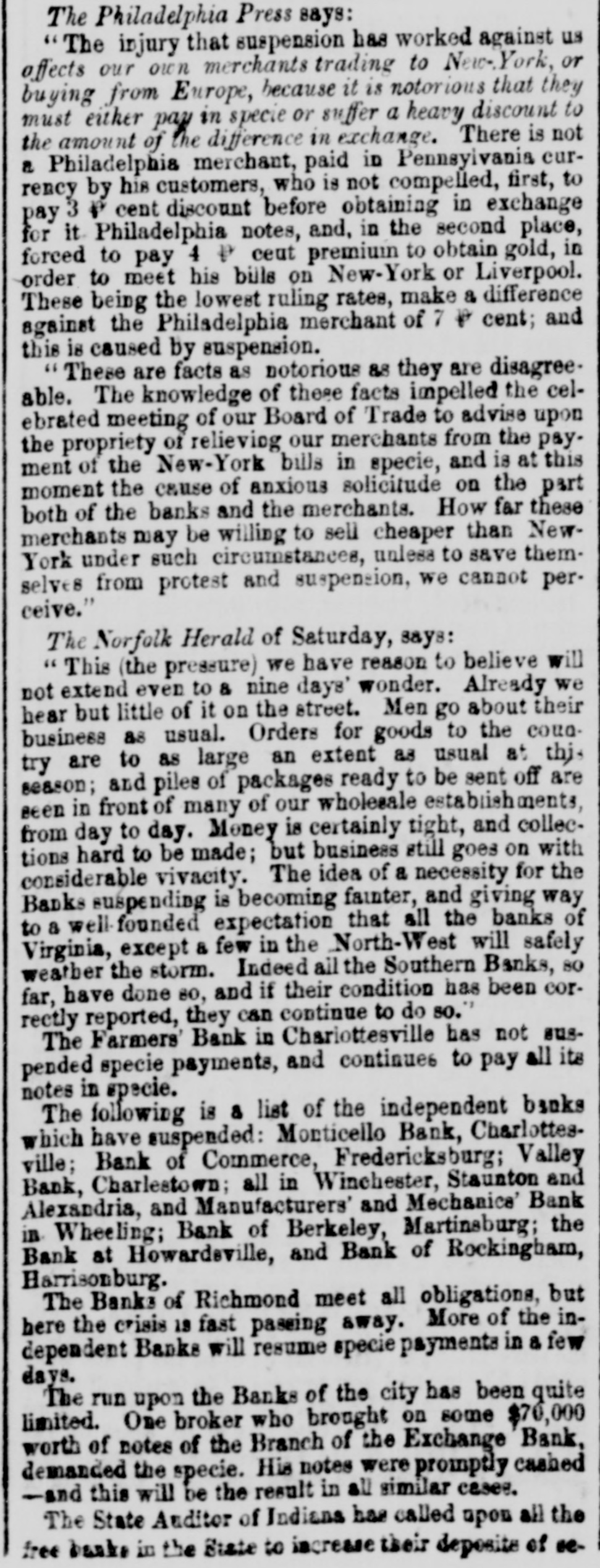 The Philadelphia Press says: "The injury that suspension has worked against us affects our own merchants trading to New-York, or buying from Europe, because it is notorious that they must either pay in specie or suffer a heavy discount to the amount of the difference in exchange. There is not a Philadelphia merchant, paid in Pennsylvania currency by his customers, who is not compelled, first, to pay 3 p cent discount before obtaining in exchange for it Philadelphia notes, and, in the second place, forced to pay 4 P ceut premium to obtain gold, in order to meet his bills on New-York or Liverpool. These being the lowest ruling rates, make a difference against the Philadelphia merchant of 7 p cent; and this is caused by suspension. "These are facts as notorious 88 they are disagreeable. The knowledge of these facts impelled the celebrated meeting of our Board of Trade to advise upon the propriety of relieving our merchants from the pay. ment of the New-York bills in specie, and is at this moment the cause of anxious solicitude on the part both of the banks and the merchants. How far these merchants may be willing to sell cheaper than NewYork under such circumstances, unless to save themselves from protest and suspension, we cannot perceive." The Norfolk Herald of Saturday, says: "This (the pressure) we have reason to believe will not extend even to & nine days' wonder. Already we hear but little of it on the street. Men go about their business as usual. Orders for goods to the cour. try are to as large an extent as usual at this season; and piles of packages ready to be sent off are seen in front of many of our wholesale establish ments, from day to day. Money is certainly tight, and collections hard to be made; but business still goes on with considerable vivacity. The idea of a necessity for the Banks suspending is becoming fainter, and giving way to a well-founded expectation that all the banks of Virginia, except & few in the North-West will safely weather the storm. Indeed all the Southern Banks, 80 far, have done so, and if their condition has been correctly reported, they can continue to do so." The Farmers' Bank in Chariottesville has not suspended specie payments, and continues to pay all its notes in specie. The following is & list of the independent banks which have suspended: Monticello Bank, Charlottes. ville; Bank of Commerce, Fredericksburg; Valley Bank, Charlestown; all in Winehester, Staunton and Alexandria, and Manufacturers' and Mechanics' Bank in Wheeling; Bank of Berkeley, Martinsburg; the Bank at Howardsville, and Bank of Rockingham, Harrisonburg. The Banks of Richmond meet all obligations, but here the crisis 19 fast passing away. More of the independent Banks will resume specie payments in a few days. The run upon the Banks of the city has been quite limited. One broker who brought on some $70,000 worth of notes of the Branch of the Exchange Bank, demanded the specie. His notes were promptly cashed -and this will be the result in all similar cases. The State Auditor of Indians has called upon all the free banks in the State to increase their deposite of se-