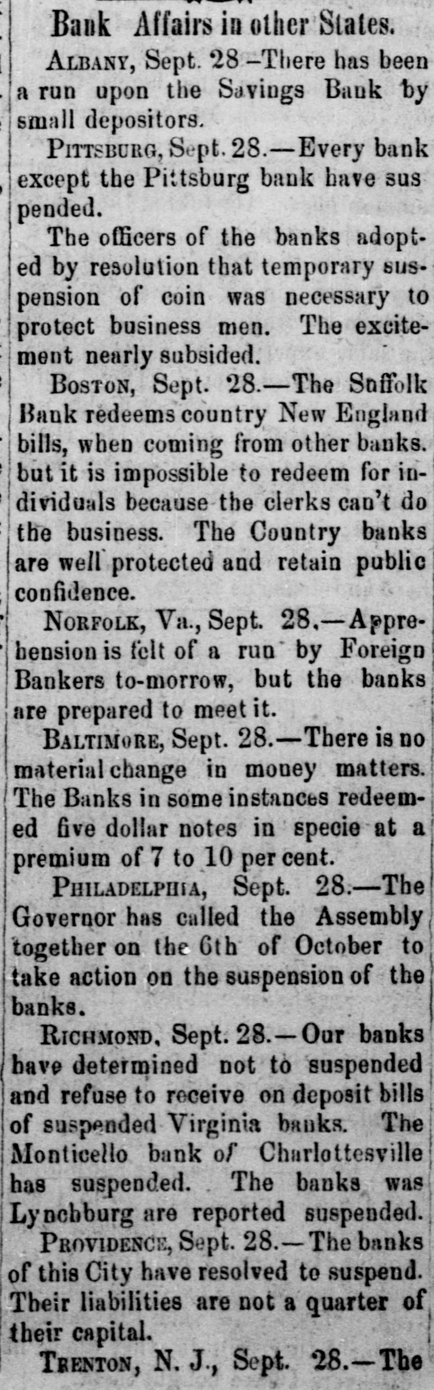 Bank Affairs in other States. ALBANY, Sept. 28-There has been a run upon the Savings Bank by small depositors. PITTSBURG, Sept. 28.-Every bank except the Pittsburg bank have sus pended. The officers of the banks adopted by resolution that temporary suspension of coin was necessary to protect business men. The excitement nearly subsided. BOSTON, Sept. 28.-The Suffolk Bank redeems country New England bills, when coming from other banks. but it is impossible to redeem for individuals because the clerks can't do the business. The Country banks are well protected and retain public confidence. NORFOLK, Va., Sept. 28.-Apprebension is felt of a run by Foreign Bankers to-morrow, but the banks are prepared to meet it. BALTIMORE, Sept. 28.-There is no material change in money matters. The Banks in some instances redeemed five dollar notes in specie at a premium of 7 to 10 per cent. PHILADELPHIA, Sept. 28.-The Governor has called the Assembly together on the 6th of October to take action on the suspension of the banks. RICHMOND, Sept. 28.-Our banks have determined not to suspended and refuse to receive on deposit bills of suspended Virginia banks. The Monticello bank of Charlottesville has suspended. The banks was Lynchburg are reported suspended. PROVIDENCE, Sept. 28.- The banks of this City have resolved to suspend. Their liabilities are not a quarter of their capital. TRENTON, N.J., Sept. 28.-The