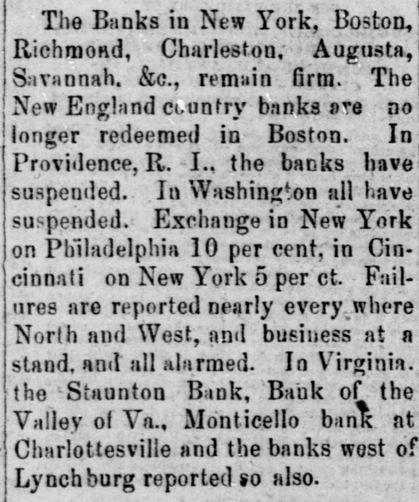 Suspension occurred as part of the widespread financial crisis of late September 1857 when many banks suspended specie payments across states; reported alongside other Virginia bank suspensions.