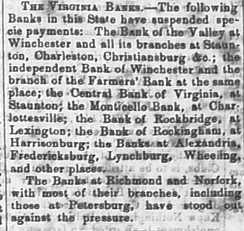 THE VIRGINIA BANKS.-The following Banks in this State have suspended specie payments: The/Bank of the Valley at Winchester and all its branches at Staunton, Charleston, Christiansburg &c.; the independent Bank of Winchester and the branch of the Farmers' Bank at the same place; the Central Bank of Virginia, at Staunton, the Monticello Bank, at Char: Jottesville; the Bank of Rockbridge, at Lexington; the Bank of Rockingham, at Harrisonburg; the Banks Alexandria, Fredericksburg, Lynchburg, Wheeling, adidas and other places, The Banks at Richmond and Norfork, with most of their branches, including those at Petersburg, have stood out against the pressure.