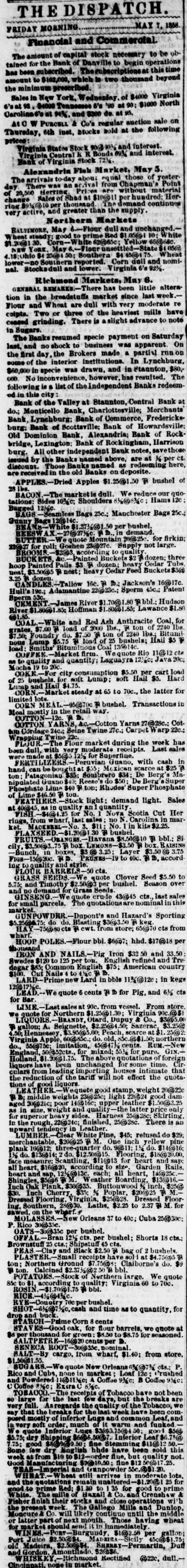 THE DISPATCH. MAY 1, 1858. FRIDAY MORNING Financial and Commercial. The amount of capital stock necessary to be obtained for the Bank of Danville to begin operations has been subscribed. The subscriptions at this time amount to $102,000, which to two thousand beyond the minimum prescribed. Sales in New York, Wednesday. of $4000 Virginia at 93 $4000 Tennessee 6's '90 at 90; $1000 North Carolina at 94% and 8300 de at 95. At C W PURCHLL & Co's regular auction sale on Thursday, 6th inst, Stocks hold at the following prices: Virginia States Stock 90@ 101/2 and interest. Virginia Central R R Bonds 0% and interest. Bank of Virginia Stock 72%. Alexandria Fish Market, May 5. The arrivals to-day about equal those of yester. day There was an actival from Chapman's Point of 20,500 Herring. Prices are without material change Sales of Shad at $10@11 per hundred: Herring $9%@10 per thousand The demand continues very active, and greater than the supply. Northern Markets BALTIMORE, May -Flour dull and unchanged heat steady good prime Red $1 1.05@1 10: W hite $1.20@1 Corn-White 62@65c; Yellow 65@68c NEW York. May itted as@ 4.18:0hio $4 25@ 50; Southera $4 45@1 75. Wheat lower Southern reported. Corn dell and nominal. Stocks dull and lower. Virginia 6's 92%. Richmond Markets, May 6. GENERAL REMARKS- has been little alteration in the breadstuffs market since last week Flour and Wheat are dull with very moderate re coipts. Two or three of the heaviest mills have cansed grinding. There is slight advance to note in Sugars. The Banks resumed specie payment on Saturday last, and no shock to business was apparent On the first day, the Brokers made a partial run on some of the interior institutions. In Lynchburg, $60,000 in specie was drawn. and in Staunton, $80,000. No incon enience, however, has resulted. The following is a list of the Independent Banks redeemed in this city Bank of the Valley at Staunton, Central Bank at do.; Monticello Bank, Charlottesville; Merchants Bank, Lynchburg: Bank of Commerce, Fredericksburg: Bank of Scottaville; Bank of Howardsville: Old Dominion Bank, Alexandria; Bank of Rock bridge, Lexington: Bank of Rockingham, Harrison burg. All other independent Bank notes, save those issued by the Banks named above, are at 1/2 per ct discount. Those Banks named as here, are received in the old Banks on deposite. APPLES.-Dried Apples $1 25@1 50 P bushel of 28 BACON lbs. dull. We reduce our quo tations: Sides 10% Shoulders 8X@8%c; Hams 12c: Bagged BAGS 12/60 Seamless Bags 25c.; Manchester Bags 250.; Baga12@14c Gunny hite $1.373/@1 50 per bushel, BEESW AX Mb. in demand BUTTER. quote Mountain 20@25c for firkin: 22@27 for roll; Goshen 23@27c. Supply not large. BROOMS $2@3 according to quality BUCKETS. Painted Buc $2 dozen; three hoop Painted Pails $3 a dozen; heavy Cedar Tubs neat, $3.50@5 P nest; heavy Cedar Feed Buckets $3@ 3.25 CANDLES dozen -Tallow 16c. P 1b.: Jackson's 16@17c Hull's 19c.; Adamantine 22@23c.; Sperm 450.; Patent Sperm CEMENT -James River .80 * bbl.: Hudson River $1.80@1 .85: Hoffman 1.80@1.85; Lawance $1.80 @1.85. COAL White and Red Ash Anthracite Coal, for grates. $7.00 73 load 2000 lbs., ton of 2240 lbs. $7.50; Foundry do. 50 ton of 2240 lbs. Bitumi nous Lump $5.75 * load of 25 bushels: Hail $5 * load: Smiths' Bitumit Coal 13@14c OFFEE -Market firm. quote Rio 11@12 cts as to quality and quantity: Laguay ra 12,2c; Java 20c; 20c to Mochs COKE city consumption $5.50 per cart load of 25 bushels. for noft Lump: soft Hail $5. Hard $4.75 Hail and Lump CORN. Market steady at 65 to 70c., the latter for limited lots. CORN MEAL 95@70c . bushel. Transactions in Meal mostly in the retail way. COTTON- 12c. b. COTTON YARNS, &c.-Cotton Yarns 27@28c.; Cottoo Cordage 240.; Seine Twine 27c.; Carpet W arp 22c.: 22c. Wrapping FLOUR. Twine The Flour market during the week has been dull, with very moderate receipts. Last sales were made at $5@5 12½ for Superfine. FERTI Peruvian Guano, with cash in hand, can be bought $55; xican scarce at $25 ton; Patagonian $35: Sombrero $34; De Berg's Manipulated Guano $40; Reese $50; De Berg Super Phosphate Lime $40 * ton; Rhodes' Super Phosphate $46.50 P Lime ton. of FEATHERS -Stock light; demand light. Sales at 40@45, in quality an quantity FISH SI@ for No. Nova Scotia Cut Her rings, from wharf, last sales; no N. Carolina in market. MACKEREL $11: No. in kits $2.25. PLAXSEED 20@1 30 P bushel. FRUITS. ORANGES. Havana $8.50@10 * bbl.; 8i city, $3.50@3.. B box LEMONS- $3.50 P box. RAISINS Bunch, in boxes, $3 3.25: Layer $3.50@ 3.75 FiGs- 15@20c. *D. PRUNES 19 to 40c. B. accord style. ing FLOUR BARRELS cts. GRASS SEEDS We quote Clover Seed 50 to 5.75; and Timothy 50@3 per bushel. Season over and no demand for Grass Seeds GINSENG. We quote crude 43@45 cts., last sales for small parcels. The quotations are nominal in this market. RR.-Dupont's and Hazard's Sporting $5.25@6.75: do do. Blasting $3@3.50 P keg. HAY -75(@80 ets # cwt. from store; 65@70 cts from wharf. HOOP bbl. $6@7; hhd. $17@18 per thousand IRON AND NAILS.-Pig Iron $32 50 and 33.50 Swedes $120 to 125 per ton. English refined and Tre degar $85; Common English $75; American country $100. Cut Nails to 1 & C LARD new Lard in bble 11%@12c in kegs 12@17%c. quote cents P tb for Pig. and 6½ cts for Bar LIME. sales at 90c. from vessel. From store We quote for Northern $1.25@1 30; Virginia 90c @$1 LIQUORS. BRANDY, Otard, Dupuy & Co., $3@5.00 * gallon; A. Seignette, $2.25@4.50; Sazerac, $3.25@ 4.50; Hennessey $3.95@5.00; Peach, searce at $1. 25@2 Virginia Apple 60@85c.; do. old, 50; northern do., 55@75c; imitation, 45@47 cents. RUM -New England, 50@52cts., for mixed; 55% for pure. GIN.Holland 20@1.75. The above quotations of foreign liquors have been unchanged for some time. culars from leading importing houses intimate that the reduction of the tariff will not effect the quotagood liquors of tions -Wequote good stamp, weight 20@22c TD: middle weights 23@25c; light 220024 good dam aged 30@21c; poor 14@16c; upper lea
