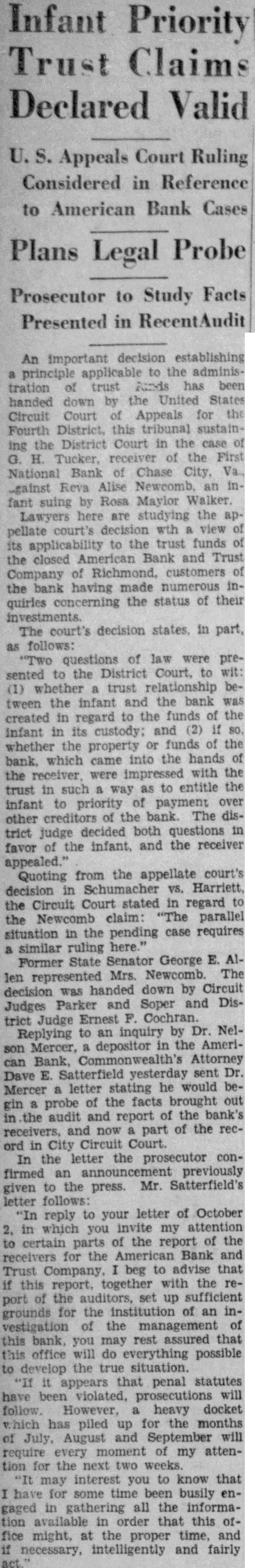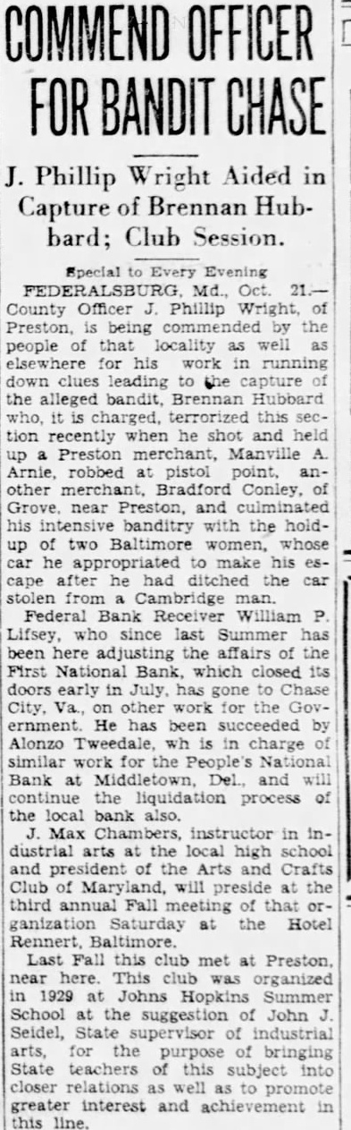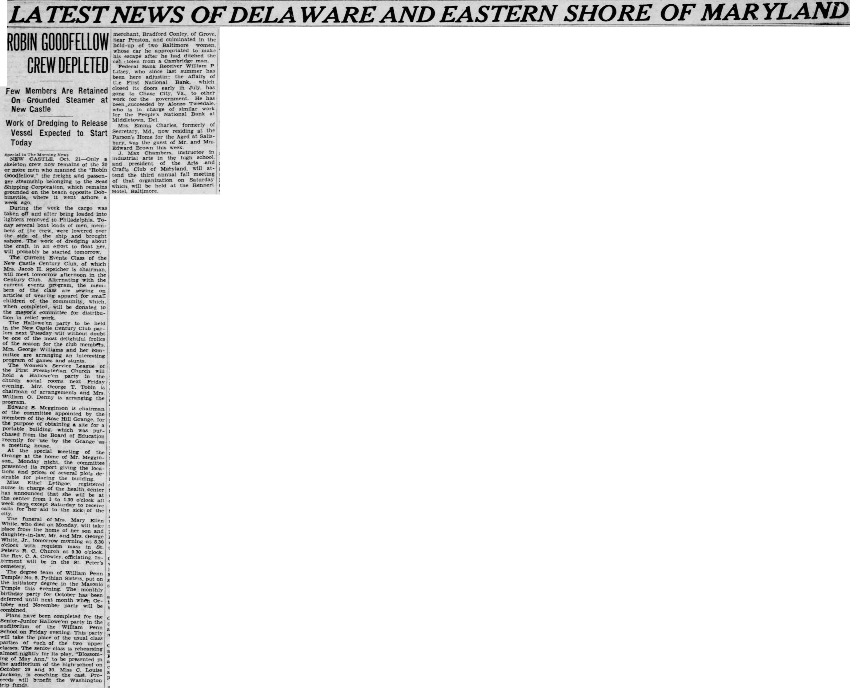 NEW Oct. skeleton crew now remains of the 30 more men who manned the "Robin Goodfellow, the freight and passenger steamship belonging to the Seas Shipping which grounded on the beach Dobbinsville, where went ashore week ago, During the week the cargo was taken off and after being loaded into lighters removed Toboat loads of men, members of the crew, were lowered over the ship brought ashore. The work of dredging about craft, in an effort to float her, will probably started tomorrow. The Current Events Class of the New Castle Century Club, of which Mrs. Jacob H. Speicher chairman, meet in the Century Club. Alternating current events program, the members the class sewing articles wearing apparel for small children the community, which, when completed, will be donated the mayor's committee for distriburelief work. The Hallowe'en party to be held the Castle Century Club parnext Tuesday without doubt of the most delightful frolies the season for club members. Mrs. George Williams and her committee are arranging program and The League the First Presbyterian Church hold Hallowe'en party the church social rooms next Friday evening. Mrs. George Tobin chairman of and William Denny is arranging the program. Edward Megginson is chairman the appointed by the members of the Rose Hill Grange, for the purpose obtaining site for portable which was purchased from the Board Education recently use by the Grange meeting house. the special of meeting the Grange the home of Megginthe presented its report giving the locations prices of plots sirable for placing building. Miss Ethel nurse in charge the health registered center has announced that she be the center from to 1.30 o'clock week days except Saturday to all calls aid the of the city. The funeral Mrs. of Ellen White. who died Monday Mary will take place from the home of her and Mr. and Mrs. George tomorrow morning o'clock with requiem mass in St. Peter's Church at Rev. Crowley, terment will be in the St. Peter's cemetery. The degree team of William Penn Temple. Sisters. put on initiatory degree in the Masonic Temple this evening The monthly birthday party for October has been deferred until next month when October November party will combined. Plans have been completed for the Hallowe'en party in auditorium the William Penn School on Friday evening. This will take the place of the usual class parties each of the two upper classes The senior class rehearsing almost nightly its May to presented in of October 29 and Miss Louise Jackson. coaching Proceeds benefit the Washington trip merchant, Bradford Conley, of Grove. near and culminated in the of two Baltimore whose car he appropriated to make escape after he had ditched the from Cambridge man. Federal Bank Receiver William Lifsey, who since last summer has been here adjusting affairs of the First National Bank, which closed its doors early in July, has Chase City, Va., to other gone government. He has work for by Alonzo who charge of similar work the People's National Bank Del. Mrs. Emma Charles. formerly of Secretary Md., now residing the Parson's Home for the Aged at bury, the guest of Mr. and Mrs. Edward this week. Max Chambers, instructor in industrial the high of the Arts and and president Crafts Club Maryland, will tend the third annual fall meeting of that organization on Saturday will be held at the Rennert which Baltimore.