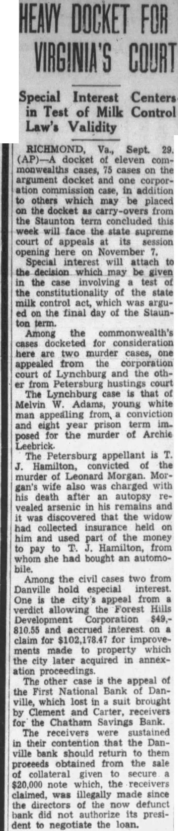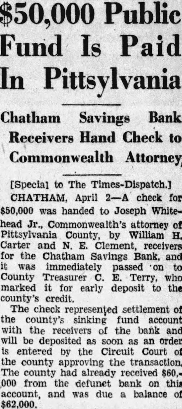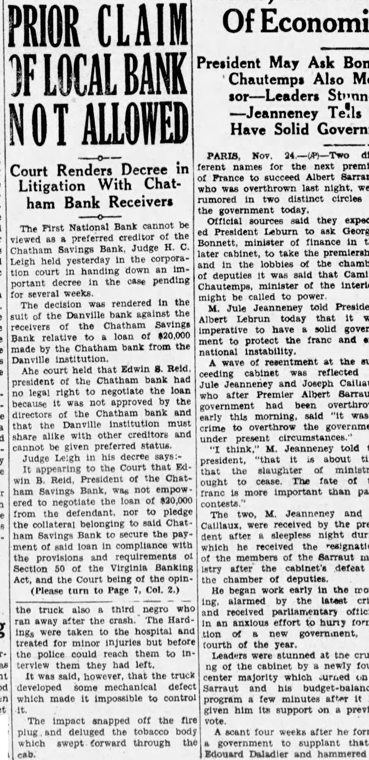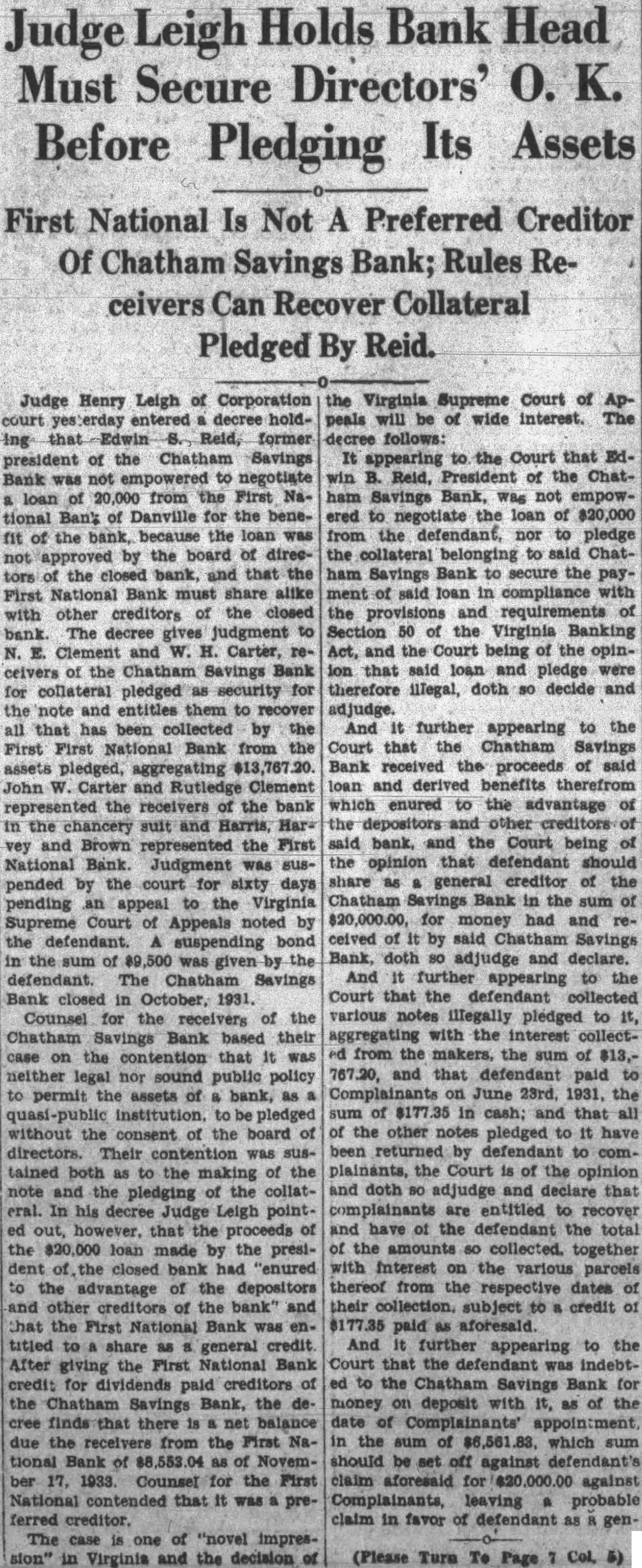 Judge Henry Leigh of Corporation decree holdReid, former president of the Chatham Savings Bank not negotiate loan 20,000 from the First NaBan's Danville for the benefit of the because the loan was by the of directhe bank, and the First Bank alike with creditors the closed decree judgment Clement and W. Carter, ceivers the Chatham Savings pledged for entitles them to that has been collected by the First First National Bank from pledged, aggregating John Carter and Rutledge Clement represented the receivers the bank in the chancery suit and Harris, and Brown represented First National Bank. Judgment was suspended the court for sixty days pending appeal to the Virginia Supreme Court of Appeals noted the defendant. suspending the was given the defendant. Chatham Savings Bank closed in October, Counsel the receivers of the Chatham Savings Bank based their case contention that neither legal sound public policy permit the assets bank, pledged without the consent the board was sustained the making the pledging the collateral. In Judge Leigh point. that the the $20,000 loan made by the presiclosed had "enured the advantage of depositors creditors of the bank" and that the First Bank engeneral After the First National Bank credit for paid creditors the Savings Bank, the dethere balance due the from the First of ber 17, Counsel the First National that ferred "novel impresVirginia and the the Virginia Supreme Court of peals will be wide interest. The follows: appearing the Court that Edwin B. Reid, of the ChatBank, not empowered to the loan $20,000 from the nor to pledge the belonging said Chatham Savings Bank to secure the said loan in compliance with the and requirements Section 50 the Virginia Banking Act, and the the opinion pledge were therefore illegal, doth decide and adjudge. And further appearing to the Court that the Chatham Savings Bank received the proceeds of said loan derived benefits therefrom which enured to advantage the said bank, Court being the opinion that defendant should share general creditor of the Chatham Savings Bank in sum for money had and ceived said Chatham Savings Bank, doth adjudge and declare. And further appearing to the Court that defendant collected various notes illegally pledged to it, aggregating the interest collectfrom the makers, the sum of $13,767.20, and that defendant paid on June 23rd. 1931, of $177.35 in cash; and that all the other pledged have been by complainants, the Court of the opinion and doth adjudge that are entitled and have the defendant the total the together with Interest the various from the dates their subject credit $177.35 paid And appearing to the Court that the to the Bank for money on deposit with of the the sum of which sum off against claim aforesaid against Complainants, leaving probable claim in favor of defendant gen-