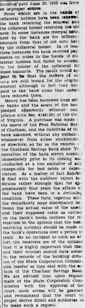 June improper source. in the hands Notes which are have been renewed collateral holders bank retaining the retaining the old collateral holder instances renewal notes note. In some the bank are for by from that old note amounts collateral holder. leas the three instances the bank received notes in the hands ments lateral holders but failed to accoun the holder of the collateral these The result would be that the makers of pear to still bound for the although fact they amount the bank sums that should paid have reduced them. Money has been borrowed from oth banks and the assets of the ban pledged apparently without Sec. 4149(50) the pliance purchase made the assets of the First National Ban of Chatham, and the liabilities th bank without any authorit whatsoever from either stockholder or directors, far the records the Chatham show. operation of the bank eleven immediately prior to its closing conducted loss charge-offs for bad debts depreclation. matter of fact filed with the report dicates rather strongly that for proximately four years the affairs the bank have been in declining condition. These together the remarkably large discrepancy tween the actual value of the and their supposed value on the bank's books inclines the to the opinion that the searching should be made the bank's period years. As an incident to an fort the are of the opinion that highly important that they and their counsel should have access to the records the banking division the State Corporation Commission insofar they deal with fairs of the Chatham Savings Bank We are advised that upon request made of the State Corporaton Commission with the approval of the court, such access will be granted and recommend that court proper decree direct and authorize to make such request.