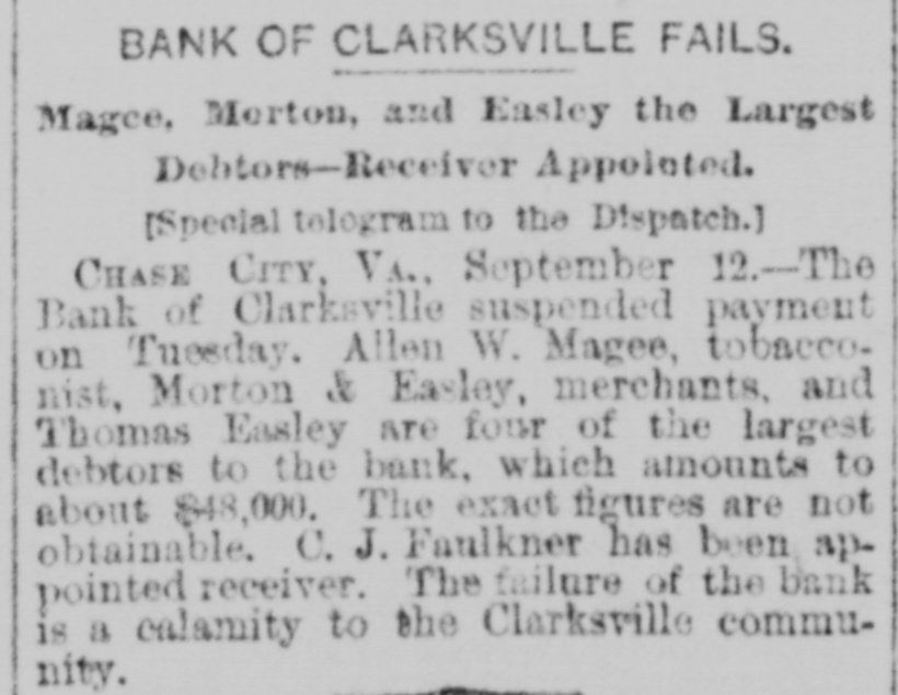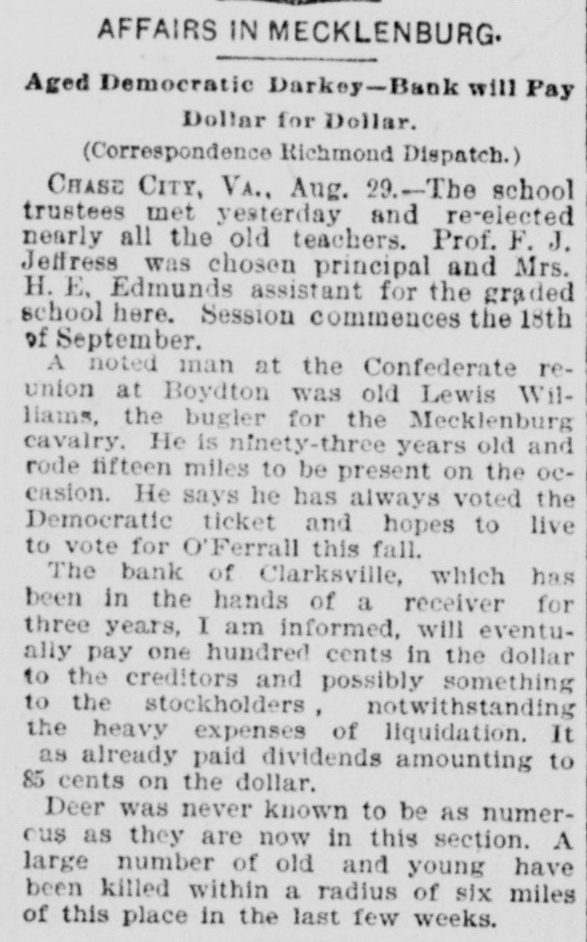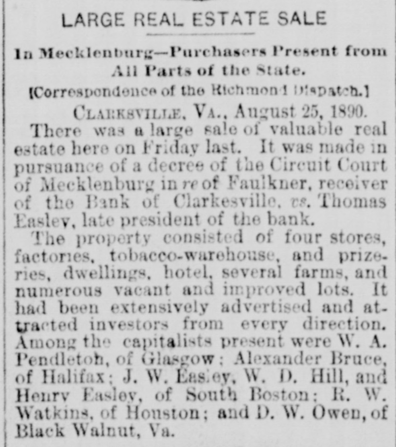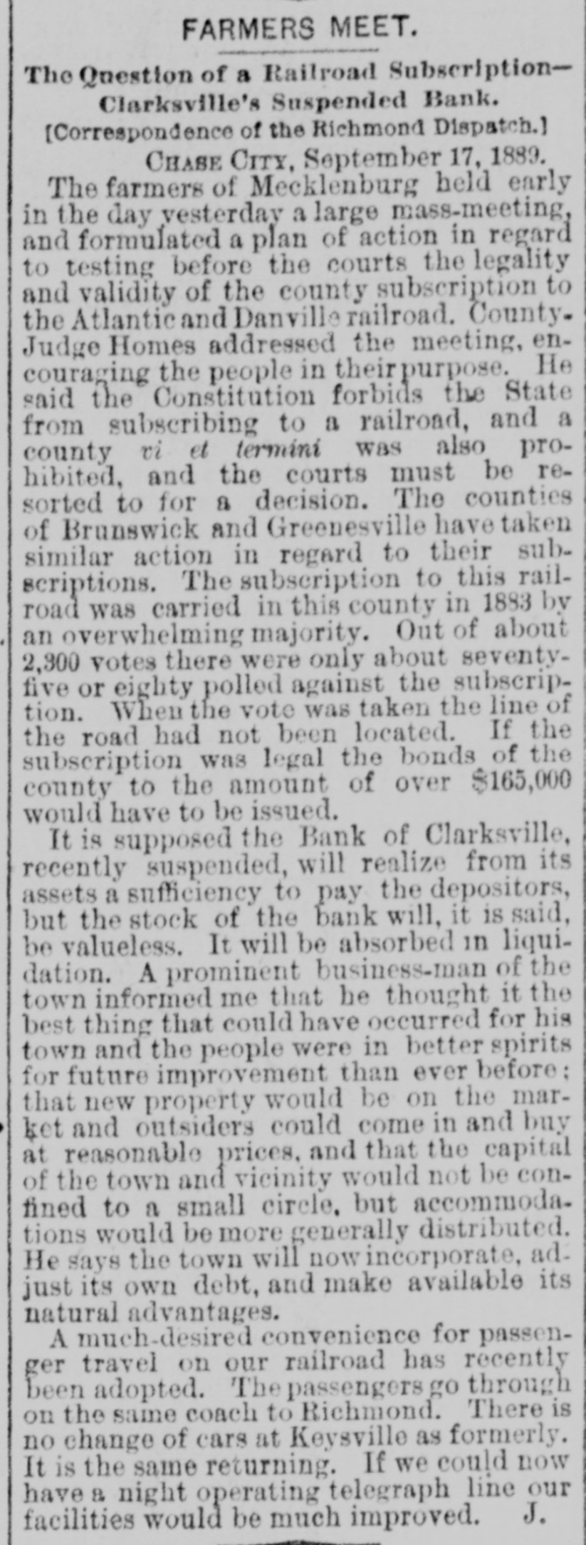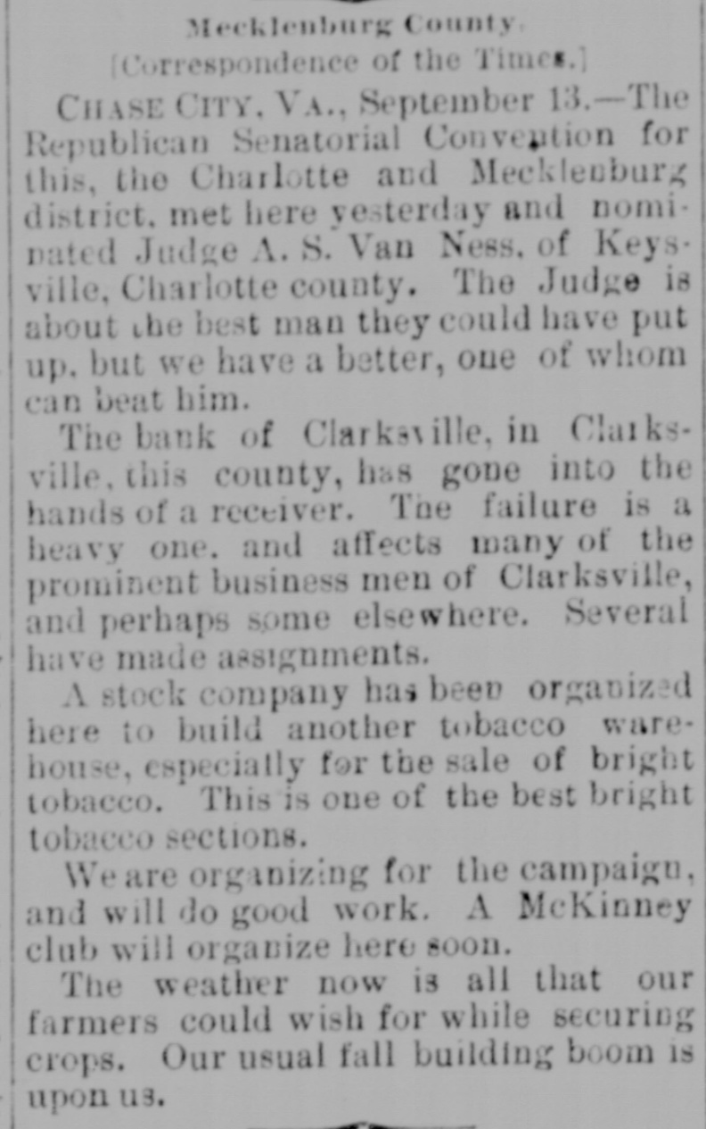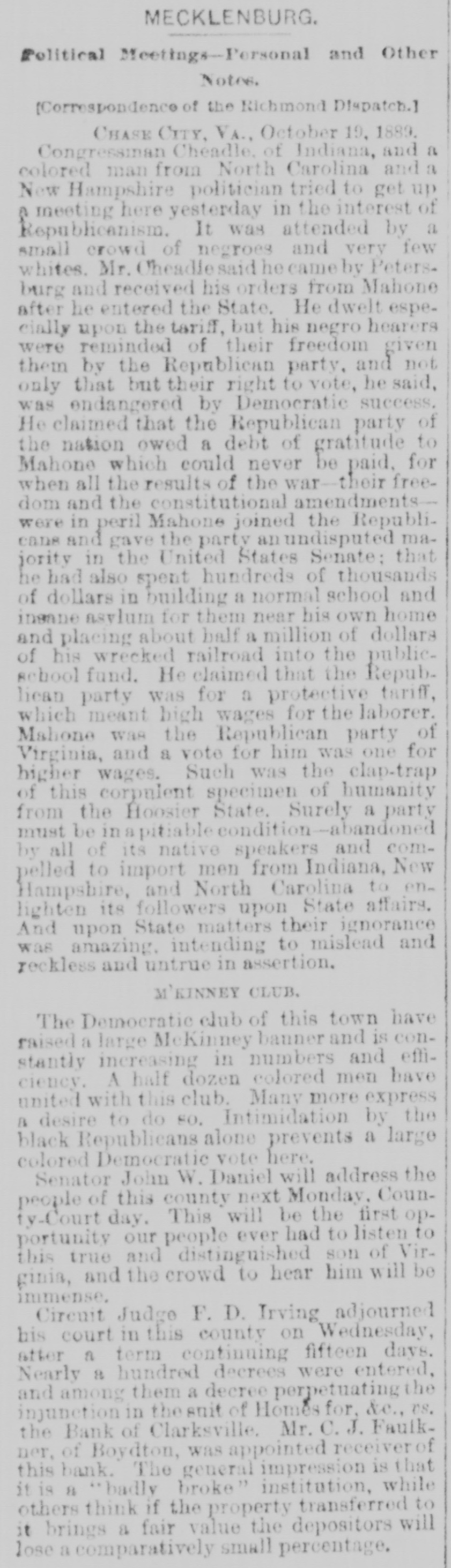 MECKLENBURG. Political Meetings-Personal and Other Notes. [Correspondence of the Richmond Dispatch.] CHASE CITY, VA., October 19, 1889. Congressinan Cheadle, of Indiana, and a colored man from North Carolina and a New Hampshire politician tried to get up & meeting here yesterday in the interest of Republicanism. It was attended by a small crowd of negroes and very few whites. Mr. Cheadlesaid he came by Petersburg and received his orders from Mahone after he entered the State. He dwelt especially upon the tariff, but his negro hearers were reminded of their freedom given them by the Republican party, and not only that but their right to vote, he said, was endangered by Democratic success. He claimed that the Republican party of the nation owed a debt of gratitude to Mahone which could never be paid, for when all the results of the war-their freedom and the constitutional amendmentswere in peril Mahone joined the Republicans and gave the party an undisputed majority in the United States Senate: that he had also spent hundreds of thousands of dollars in building a normal school and insane asylum for them near his own home and placing about half a million of dollars of his wrecked railroad into the publicschool fund. He claimed that the Republican party was for a protective tariff, which meant high wages for the laborer. Mahone was the Republican party of Virginia, and a vote for him was one for higher wages. Such was the clap-trap of this corpulent specimen of humanity from the Hoosier State. Surely a party must be in a pitiable condition-abandoned by all of its native speakers and compelled to import men from Indiana, New Hampshire, and North Carolina to enlighten its followers upon State affairs. And upon State matters their ignorance was amazing, intending to mislead and reckless and untrue in assertion. M'KINNEY CLUB, The Democratic club of this town have raised a large McKinney banner and is constantly increasing in numbers and efficiency. A half dozen colored men have united with this club. Many more express B desire to do so. Intimidation by the black Republicans alone prevents a large colored Democratic vote here. Senator John W. Daniel will address the people of this county next Monday. County-Court day. This will be the first opportunity our people ever had to listen to this true and distinguished son of Virginia, and the crowd to hear him will be immense. Circuit Judge F. D. Irving adjourned his court in this county on Wednesday, after a term continuing fifteen days. Nearly 8 hundred decrees were entered, and among them a decree perpetuating the injunction in thesnit of Homes for, &c., US. the Bank of Clarksville. Mr. C.J. Faulkner, of Boydton, was appointed receiver of this bank. The general impression is that it is 8 "badly broke" institution, while others think if the property transferred to it brings a fair value the depositors will lose a comparatively small percentage.