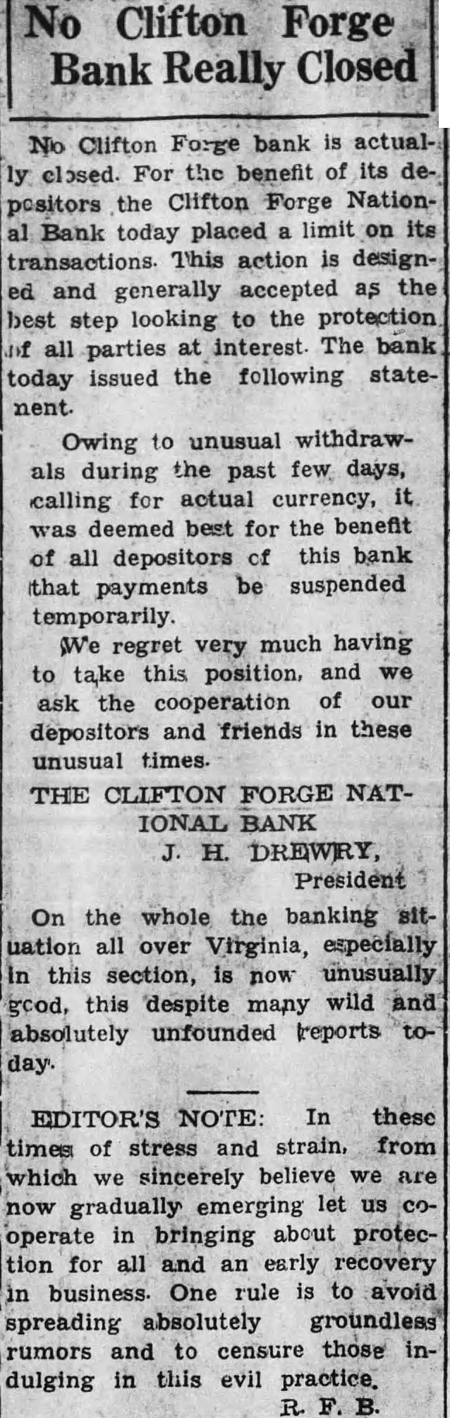 No Clifton Forge Bank Really Closed No Clifton Forge bank is actualclosed. For the benefit of its depositors the Clifton Forge NationBank today placed limit on its transactions. This action is designed and generally accepted as the best step looking to the protection of all parties at interest The bank today issued the following statenent. Owing to unusual withdrawals during the past few days, calling for actual currency, it was deemed best for the benefit of all depositors of this bank that payments be suspended temporarily. We regret very much having to take this position, and we ask the cooperation of our depositors and friends in these unusual times. THE CLIFTON FORGE NATIONAL BANK H. DREWRY, President On the whole the banking situation all over Virginia, especially in this section, is now unusually good, this despite many wild and absolutely unfounded reports today. EDITOR'S In these times of stress and strain, from which we sincerely believe we are now gradually emerging let us COoperate in bringing about protection for all and an early recovery in business. One rule is to avoid spreading absolutely groundless rumors and to censure those indulging in this evil practice. R.