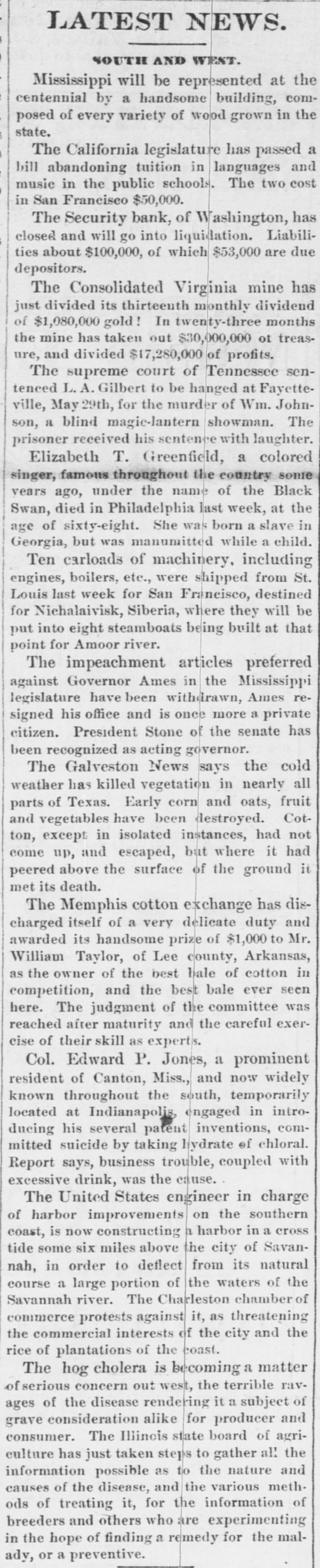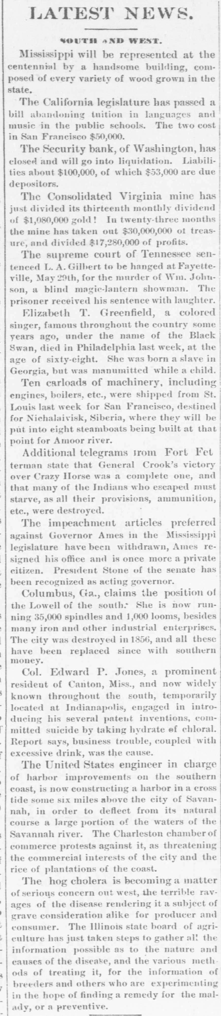 LATEST NEWS. SOUTH AND WEST. Mississippi will be represented at the centennial by a handsome building, composed of every variety of wood grown in the state. The California legislature has passed a bill abandoning tuition in languages and music in the public schools. The two cost in San Francisco $50,000. The Security bank, of Washington, has closed and will go into liquidation. Liabilities about $100,000, of which $53,000 are due depositors. The Consolidated Virginia mine has just divided its thirteenth monthly dividend of $1,080,000 gold! In twenty-three months the mine has taken out $30,000,000 of treasure, and divided $17,280,000 of profits. The supreme court of Tennessee sentenced L.A. Gilbert to be hanged at Fayetteville, May 29th, for the murder of Wm. Johnson, a blind magic-lantern showman. The prisoner received his sentence with laughter. Elizabeth T. Greenfield, a colored singer, famous throughout the country some years ago, under the name of the Black Swan, died in Philadelphia last week, at the age of sixty-eight. She was born a slave in Georgia, but was manumitted while a child. Ten carloads of machinery, including engines, boilers, etc., were shipped from St. Louis last week for San Francisco, destined for Nichalaivisk, Siberia, where they will be put into eight steamboats being built at that point for Amoor river. Additional telegrams from Fort Fet terman state that General Crook's victory over Crazy Horse was a complete one, and that many of the Indians who escaped must starve, as all their provisions, ammunition, etc., were destroyed. The impeachment articles preferred against Governor Ames in the Mississippi legislature have been withdrawn, Ames resigned his office and is once more a private citizen. President Stone of the senate has been recognized as acting governor. Columbus, Ga., claims the position of the Lowell of the south: She is now running 35,000 spindles and 1,000 looms, besides many iron and other industrial enterprises. The city was destroyed in 1856, and all these have been replaced since with southern money. Col. Edward P. Jones, a prominent resident of Canton, Miss., and now widely known throughout the south, temporarily located at Indianapolis, engaged in introducing his several patent inventions, committed suicide by taking hydrate of chloral. Report says, business trouble, coupled with excessive drink, was the cause. The United States engineer in charge of harbor improvements on the southern coast, is now constructing a harbor in a cross tide some six miles above the city of Savannah, in order to deflect from its natural course a large portion of the waters of the Savannah river. The Charleston chamber of commerce protests against it, as threatening the commercial interests of the city and the rice of plantations of the coast. The hog cholera is becoming a matter of serious concern out west, the terrible ravages of the disease rendering it a subject of grave consideration alike for producer and consumer. The Illinois state board of agrit culture has just taken steps to gather all the information possible as to the nature and causes of the disease, and the various meth ods of treating it, for the information of 8 breeders and others who are experimenting in the hope of finding a remedy for the malady, or a preventive.