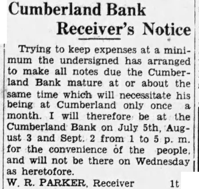 Cumberland Bank Receiver's Notice Trying to keep expenses at a minimum the undersigned has arranged to make all notes due the Cumberland Bank mature at or about the same time which will necessitate his being at Cumberland only once month. I will therefore be at the Cumberland Bank on July 5th, August 3 and Sept. 2 from to 5 p. m. for the convenience of the people, and will not be there on Wednesday as heretofore. W. R. PARKER, Receiver It