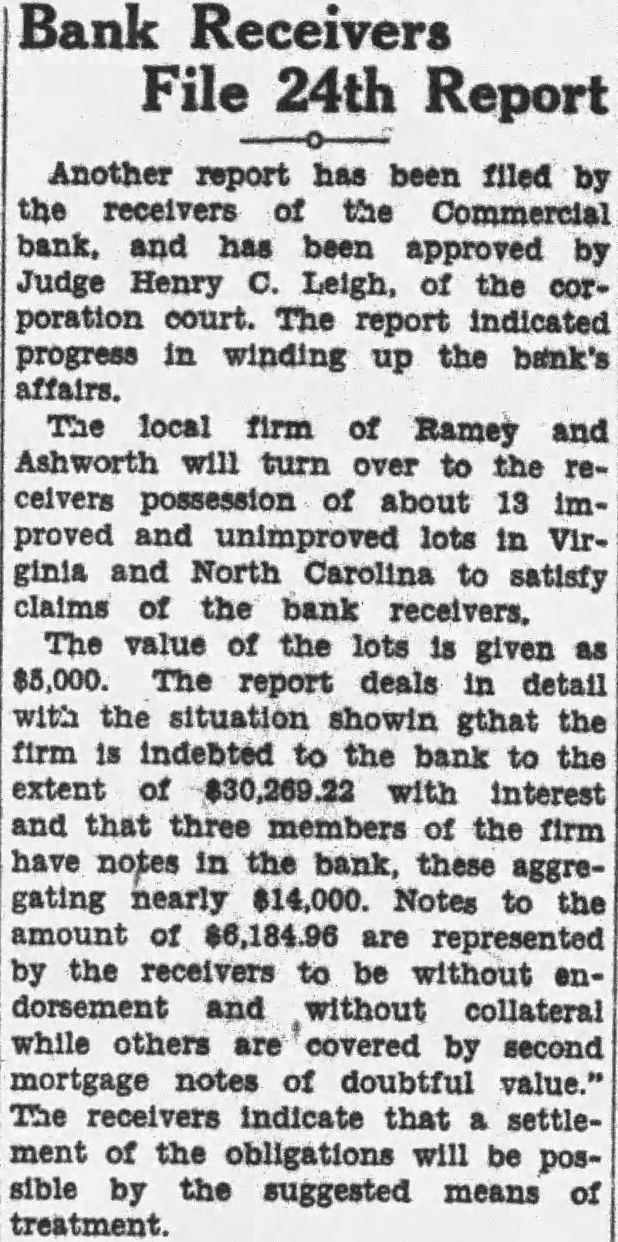Another report has been filed by the receivers of the Commercial bank, and has been approved Judge Henry Leigh, the corporation court. The report indicated progress in winding up the bank's affairs. The local firm of Ramey and Ashworth will turn over the ceivers of about 13 improved unimproved lots in Virginia and North Carolina to satisfy claims of the bank receivers. The value of the lots given The report deals in detail with the situation showin gthat the firm is indebted to the bank to the extent of with interest and that three members of the firm have notes in bank, these aggregating nearly Notes to the amount of $6,184.96 are represented by the receivers to without and without collateral while others are covered by second mortgage notes of doubtful value." The indicate that settlement of the obligations will be possible by the suggested means of treatment.