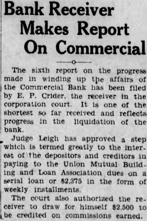 The sixth report on the progress made in winding the affairs the Commercial Bank has been filed by Crider. the receiver in the corporation court It one of the shortest far and reflects progress in the liquidation of the Judge Leigh has approved step termed greatly to the inter. est depositors and creditors paying to the Union Mutual Build ing and Loan on serial loan $2,375 in the form weekly installments The court also the ceiver to draw for himself $2,500 credited on commissions earned.