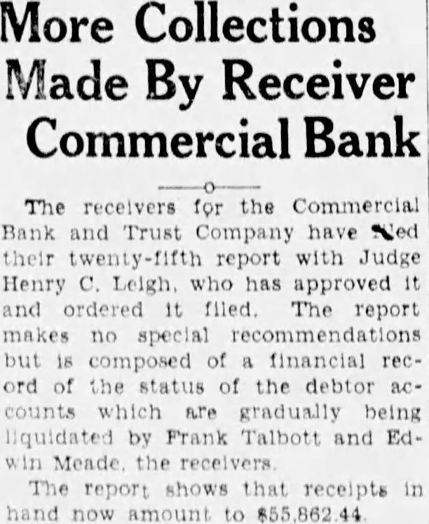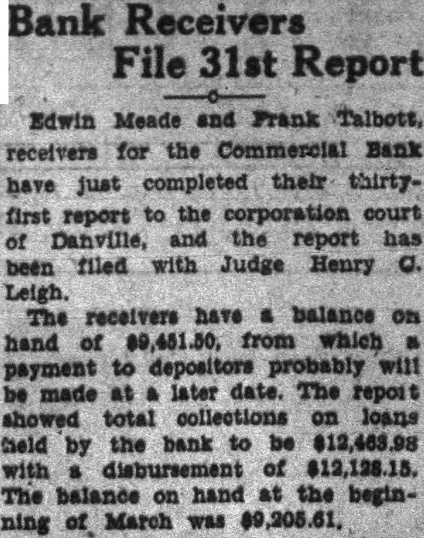 Edwin Meade and Frank Talbott, receivers for the Commercial Bank have just completed their thirtyfirst report to the corporation court of Danville, and the report has been filed with Judge Henry G. Leigh. The receivers have & balance on hand of $9,451.50, from which payment to depositors probably will be made at & later date. The repoit showed total collections on loans held by the bank to be $12,463.98 with disbursement of $12,128.15. The balance on hand at the beginning of March was $9,205.61.