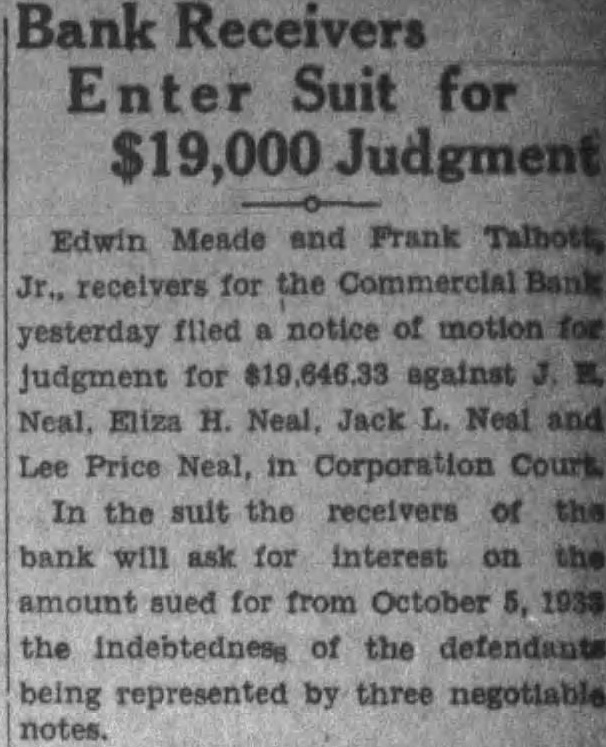 Edwin Meade and Frank Talbott, receivers for the Commercial yesterday filed notice of motion judgment for $19,646.33 against J. Eliza H. Jack L. Neal and Lee Price Neal, in Corporation In the suit the receivers of bank will ask for interest on the amount sued for from October the indebtedness of the defendants being represented by three negotiable notes.