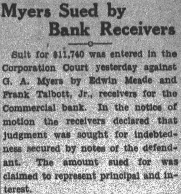 Sult for was entered in the Corporation Court yesterday against Myers by Edwin Meade and Frank Talbott, receivers for the Commercial bank. In the notice of motion the receivers declared that was sought for indebtedness secured by notes of the defendant. The amount sued for claimed to represent principal and interest.