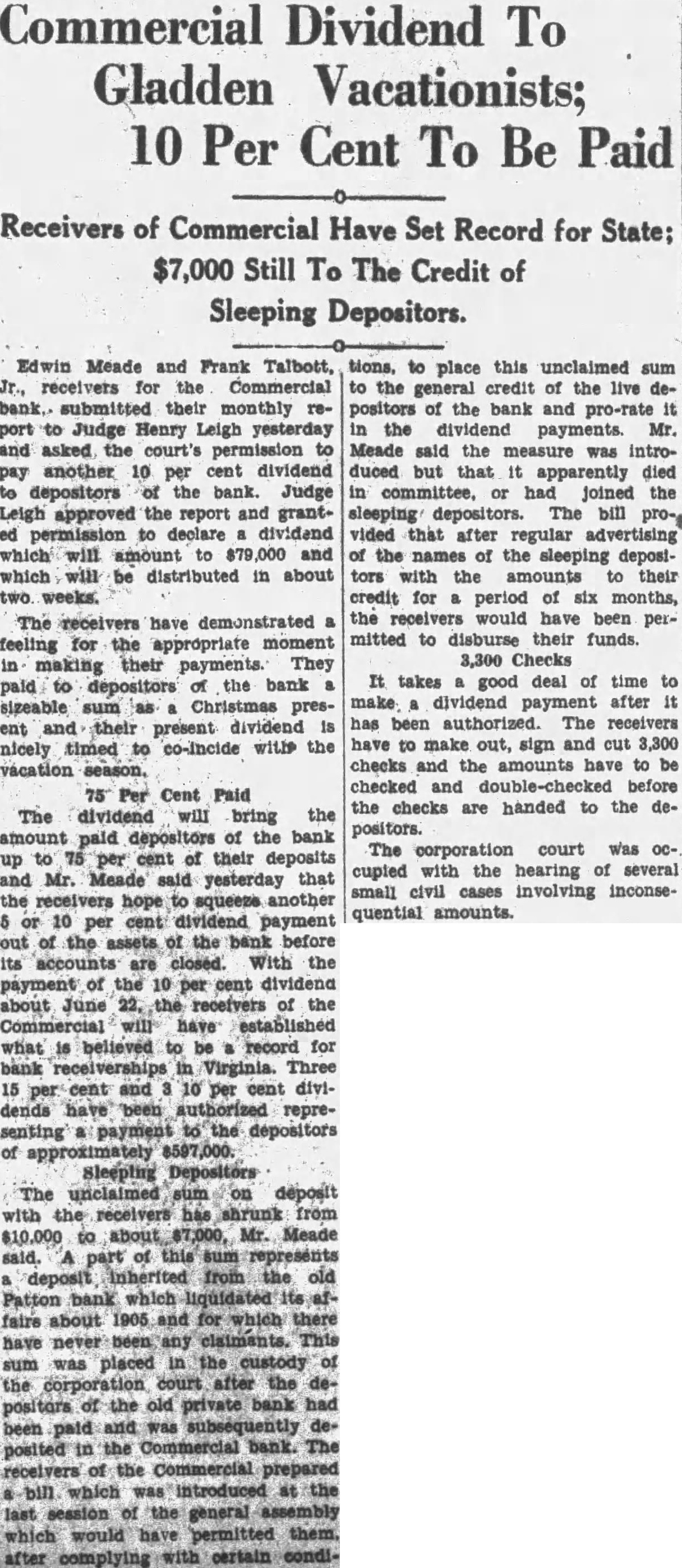 Per Cent Paid The dividend bring the paid depositors the bank per cent of their deposits and Mr. Meade yesterday that receivers hope squeeze another 10 per cent dividend payment of the the bank its accounts are closed. With the payment of the cent dividend about June receivers of the established what believed record for bank in Virginia. Three cent and per cent diviper dends representing payment depositors Sleeping Depositors The sum on deposit with the receivers has shrunk to about Mr. Meade said. part sum deposit from the old Patton bank which about 1905 for which have never any This placed the custody the court after the depositors the old private bank had been subsequently in the Commercial bank. The posited receivers of the Commercial prepared which was introduced at last session general assembly would them. tions, to place this unclaimed to the credit the live depositors the bank and the Mr. Meade the was duced but apparently died had joined the The bill vided that after the names of the deposttors with the their credit for period of six months, the would been permitted to their funds. 3,300 It takes good deal of time dividend after The receivers have make out, sign cut 3,300 checks the amounts have checked and before the checks are handed to the positors. The corporation court was with hearing of several small civil cases involving inconsequential amounts.