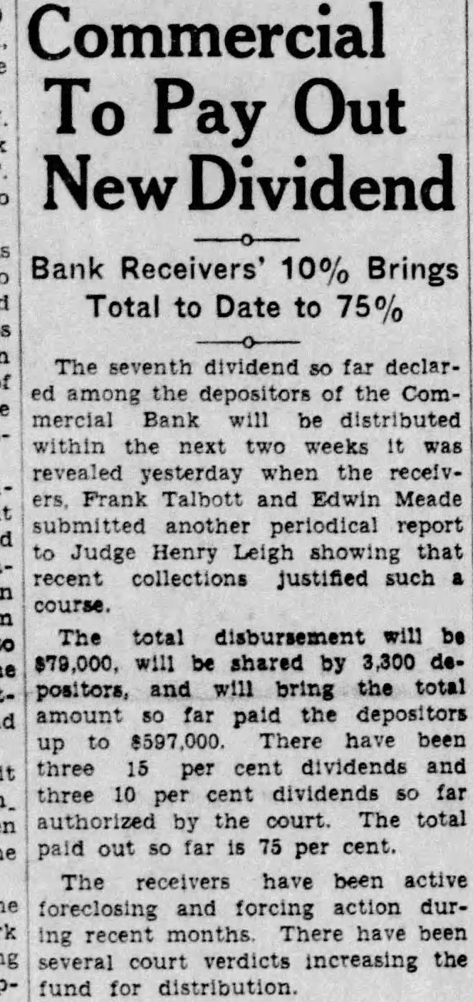 The seventh dividend so far declaramong the depositors of the Commercial distributed within the next two weeks revealed yesterday when receivFrank Talbott Edwin Meade submitted another periodical report Judge Henry Leigh showing that recent collections justified such course.